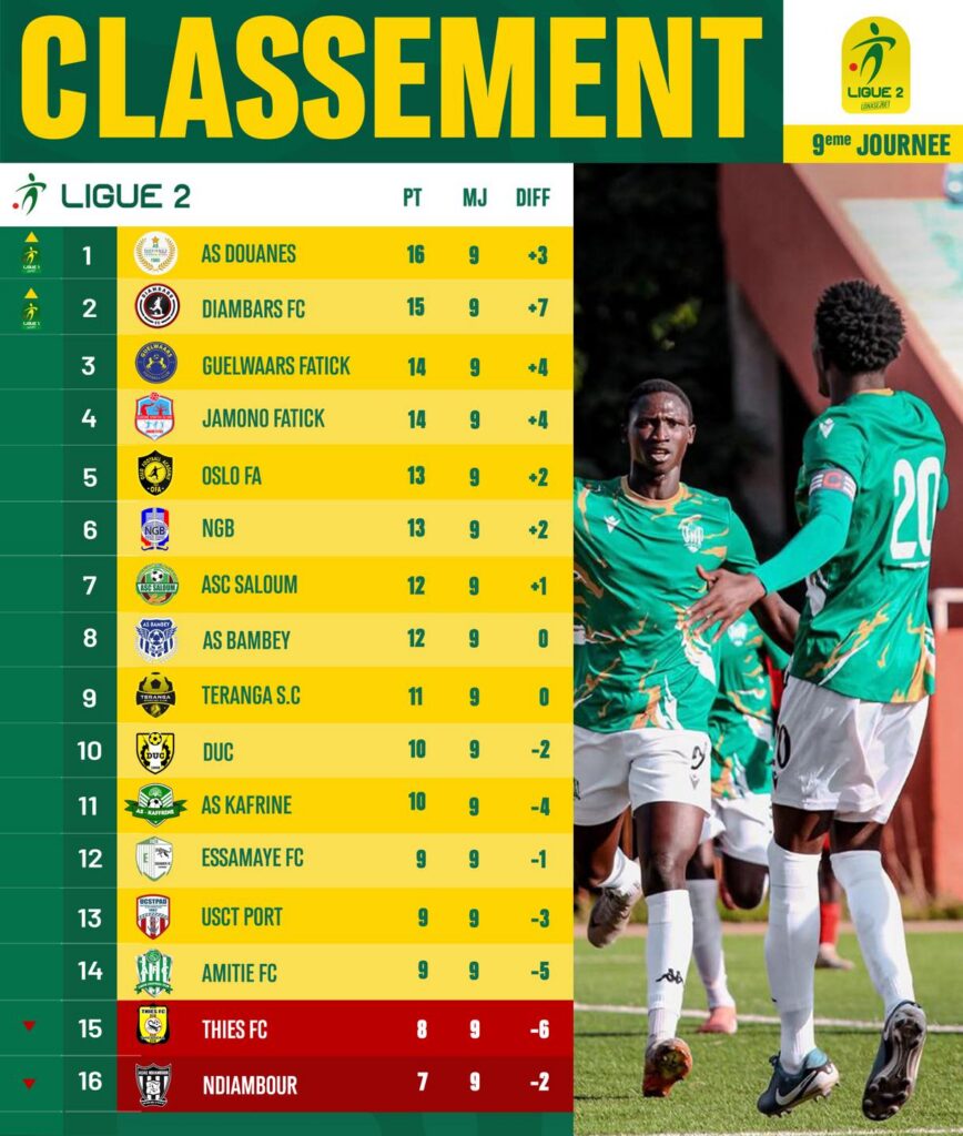 Malgré un match nul, l’AS Douanes conserve la tête du championnat avec 16 points, devant Diambars (15 pts). Guelwaars Fatick et Jamono Fatick suivent de près avec 14 points chacun. Oslo FA et NGB Niarry Tally totalisent 13 points, tandis que ASC Saloum et AS Bambey restent en embuscade avec 12 points.