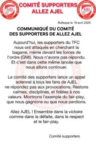 Le Comité des Supporters Allez AJEL a déclaré que leurs membres ont été attaqués par des supporters du TFC qui cherchaient la bagarre, même en présence des forces de l’ordre (GMI).