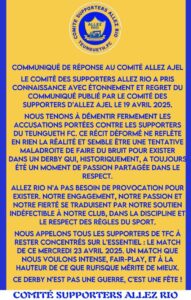 Le comité Allez Rio dément fermement les accusations formulées par Allez AJEL. Selon eux, le récit des événements est déformé et ne reflète en rien la réalité. Ils y voient une tentative maladroite de faire du bruit pour exister dans un derby qui, historiquement, a toujours été un moment de passion partagée dans le respect.
