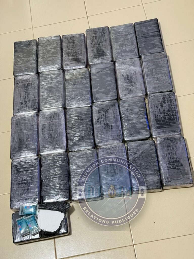 Cette opération a conduit à la saisie exceptionnelle de 25 kilogrammes de cocaïne, conditionnés en paquets d’un kilogramme chacun, pour une valeur estimée à 1,25 milliard de francs CFA. Les forces de l’ordre ont également saisi 4 paquets de haschisch de 100 grammes (400 000 FCFA), 45 grammes d’ecstasy (315 000 FCFA), un véhicule utilisé dans les activités criminelles et des paquets de faux billets, confirmant l’implication du réseau dans des activités financières illicites.