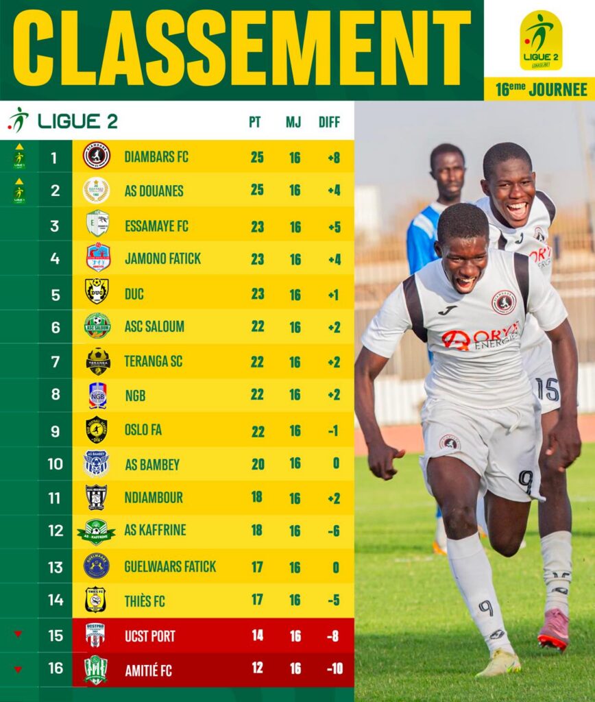 Lors de la 16ᵉ journée du championnat de Ligue 2 sénégalaise, Diambars FC s’est offert le fauteuil de leader grâce à sa victoire 1-0 face à Port FC, dimanche. À égalité de points (25) avec l’AS Douanes, les académiciens de Saly prennent l’avantage grâce à un goal-average supérieur (+8).