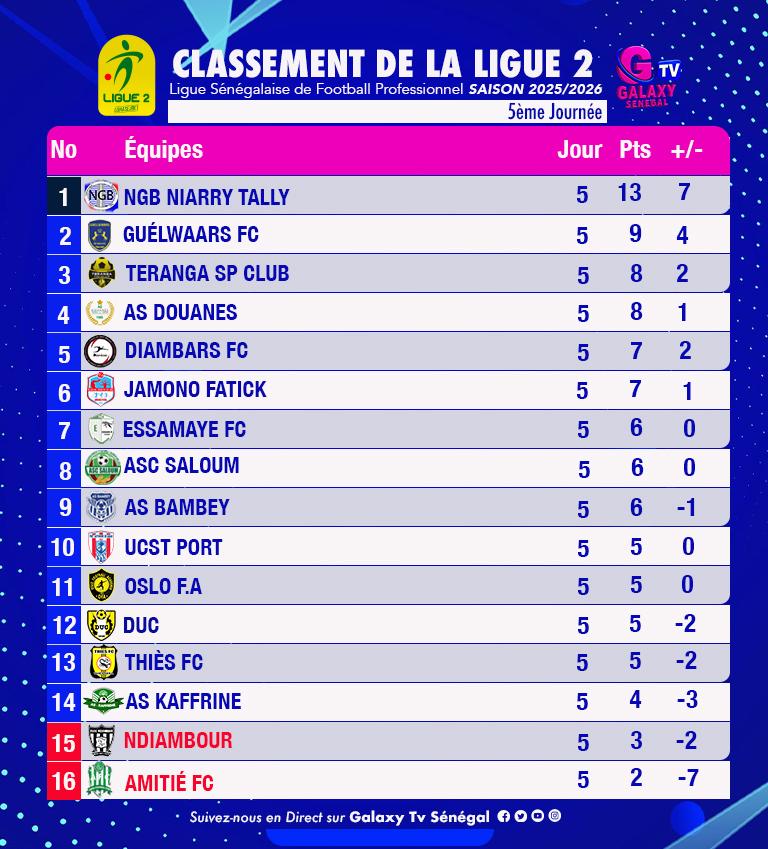 Cette journée confirme la domination de NGB Niarry Tally, la belle performance de Guelwaars FC et la compétitivité croissante de la Ligue 2.