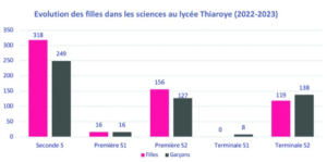 Le Lycée de Thiaroye affiche des effectifs impressionnants de filles en sciences, mais un déséquilibre persiste dans les choix de filières. En Seconde S, elles sont largement majoritaires (348 filles contre 185 garçons). Cependant, lorsqu’il s’agit de poursuivre en S1, elles se raréfient.