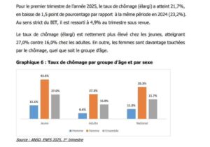 Le phénomène NEET (ni en emploi, ni en études, ni en formation) continue de poser un défi majeur. 33,5 % des jeunes de 15 à 24 ans sont dans cette situation au 1er trimestre 2025. Les femmes (43,5 %) et les jeunes ruraux (44,2 %) sont les plus touchés. En glissement annuel, le taux recule cependant légèrement (-0,9 point).