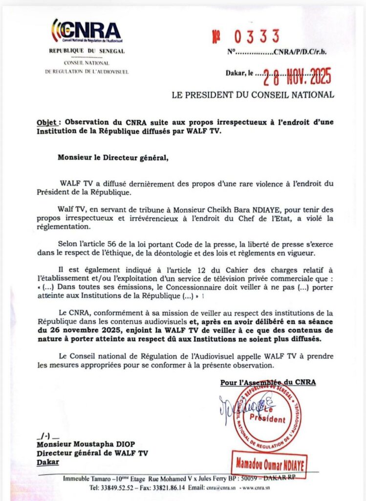 Le Conseil national de Régulation de l’Audiovisuel (CNRA) a adressé une mise en garde officielle à WALF TV à la suite de la diffusion de propos jugés irrespectueux à l’égard d’une haute institution de la République.