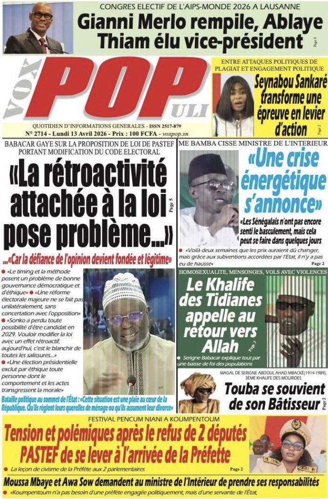 La presse sénégalaise de ce lundi s’ouvre sur un tableau économique sombre : la croissance du PIB s’effondre de 6,7% en 2025 à 2,5% en 2026, une crise énergétique se profile avec une hausse imminente des prix des carburants, et le secteur du BTP crie à l’agonie avec 30 000 à 100 000 emplois menacés. Sur le plan politique, la proposition de loi Pastef sur le Code électoral cristallise les tensions entre majorité et opposition, tandis qu’un incident protocolaire à Koumpentoum entre deux députés Pastef et la préfète alimente le débat sur les rapports entre élus et administration. En toile de fond, la Ziarra générale de Tivaouane et le geste humanitaire de Mouhamed Dieng pour des jumelles siamoises.