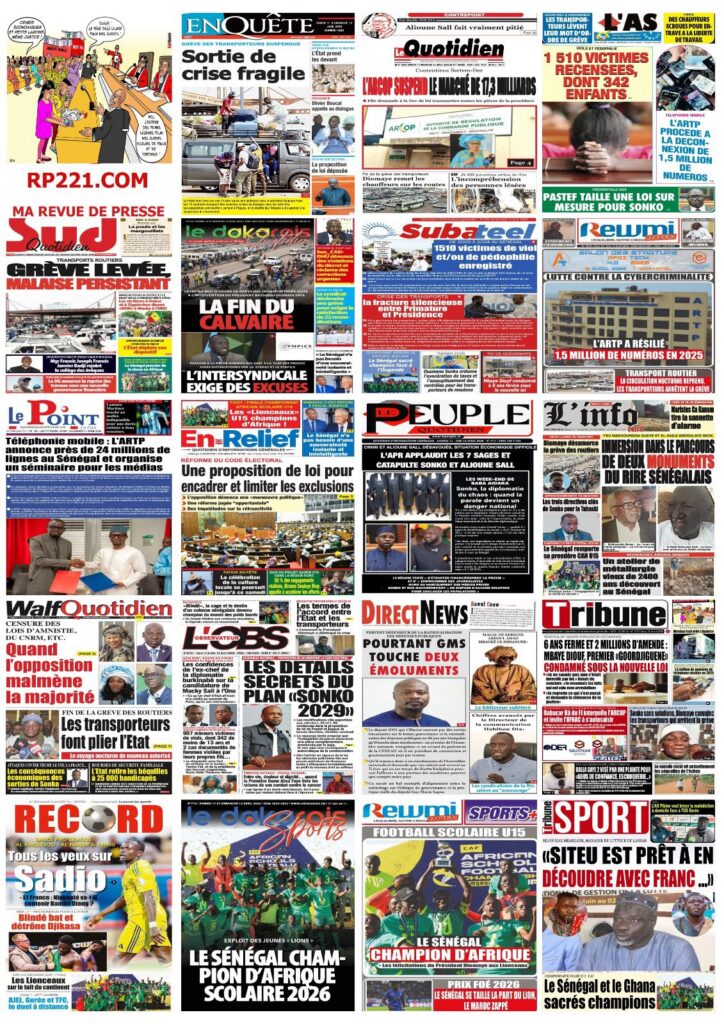 Fin de grève des transporteurs, sacre des Lionceaux U15 en football scolaire africain, dossier tentaculaire de la BR de Keur Massar, loi sur les violences sexuelles, proposition de révision du code électoral et retrait du Mali de la RASD : les journaux sénégalais de ce week-end couvrent une actualité dense, entre crise sociale résolue dans la douleur et turbulences institutionnelles.
