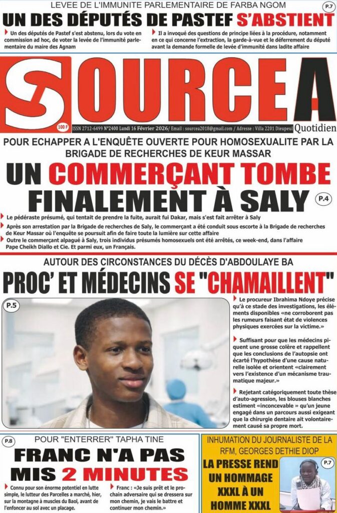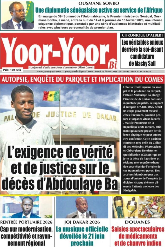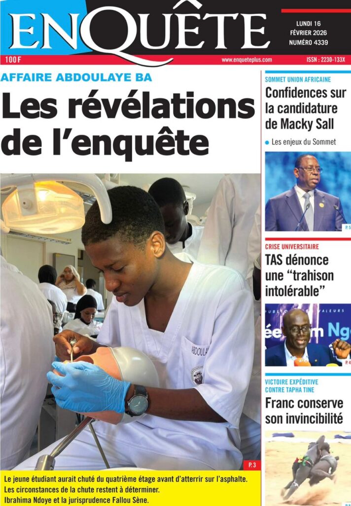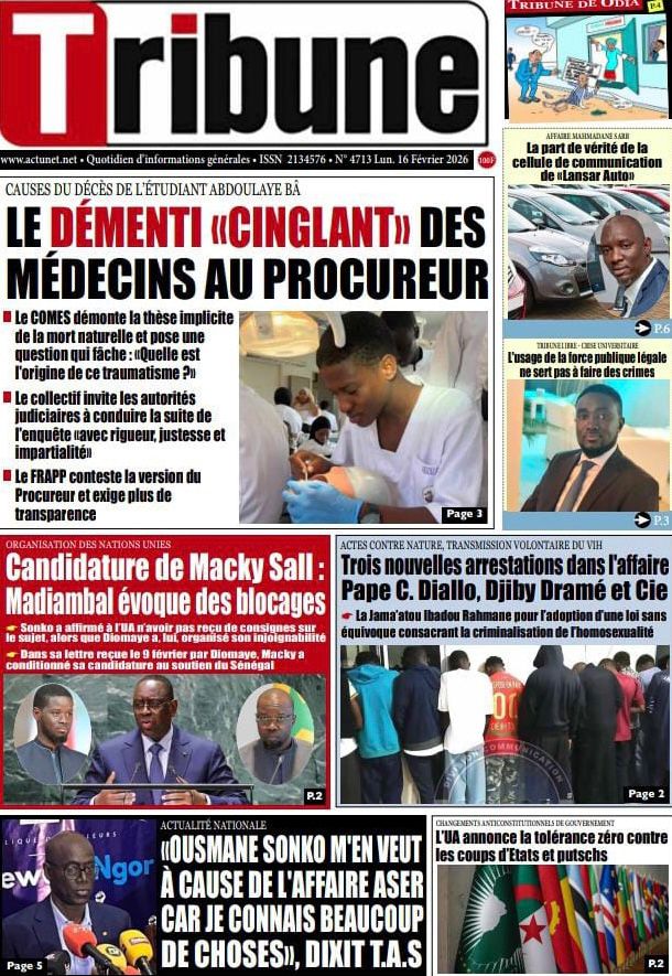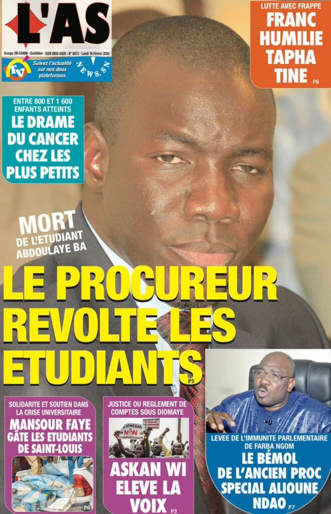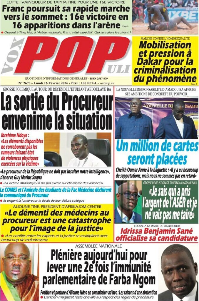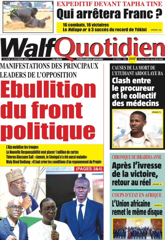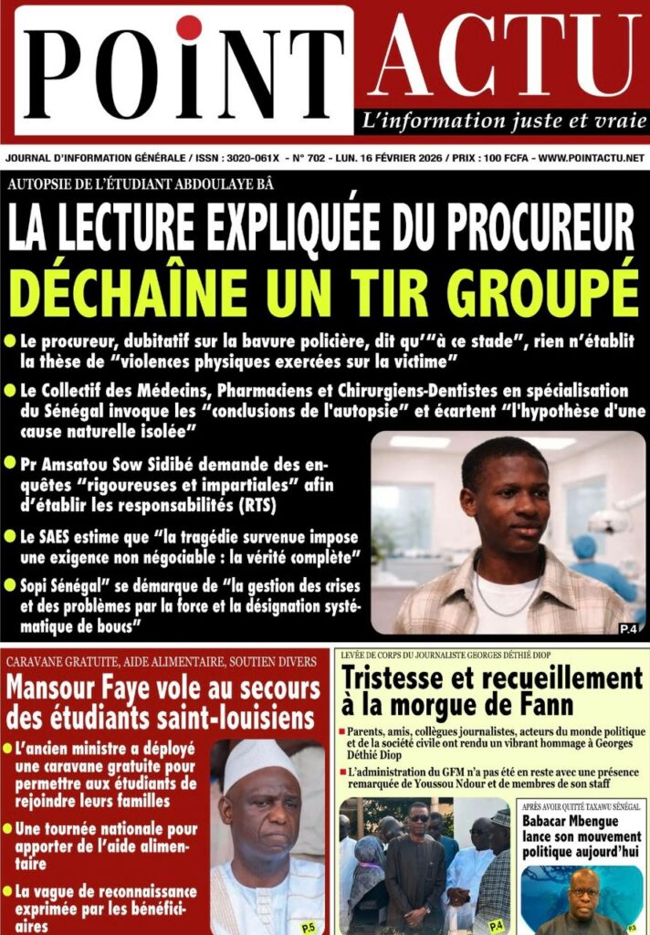 L’actualité sénégalaise de ce lundi 16 février 2026 est monopolisée par l’affaire Abdoulaye Ba qui continue de secouer le pays. Entre un Procureur dont le communiqué suscite l’indignation, des médecins qui dénoncent une autopsie « cinglante », et un gouvernement accusé de fuir ses responsabilités, la crise universitaire atteint son paroxysme. Par ailleurs, la lutte sénégalaise célèbre Franc, invincible avec 16 victoires en 16 combats, et le football livre ses derniers verdicts avec US Gorée champion d’aller.