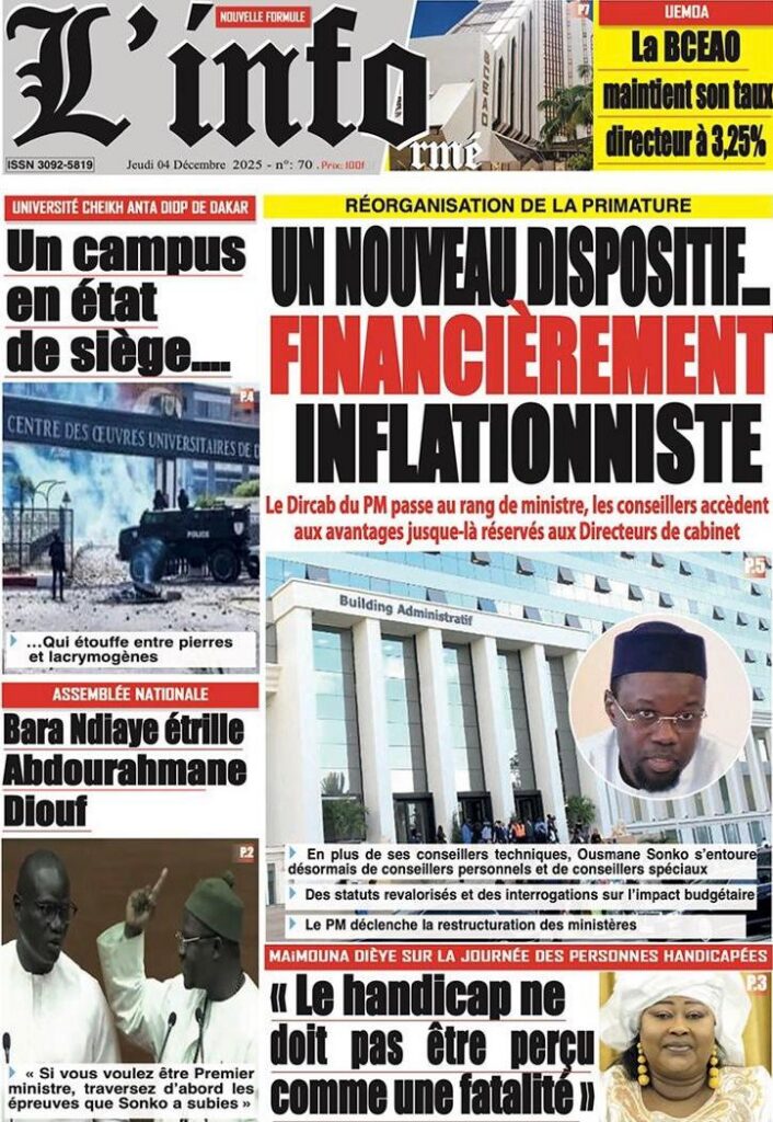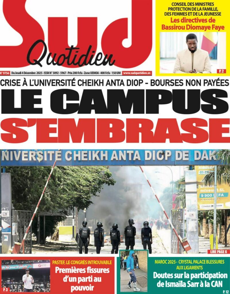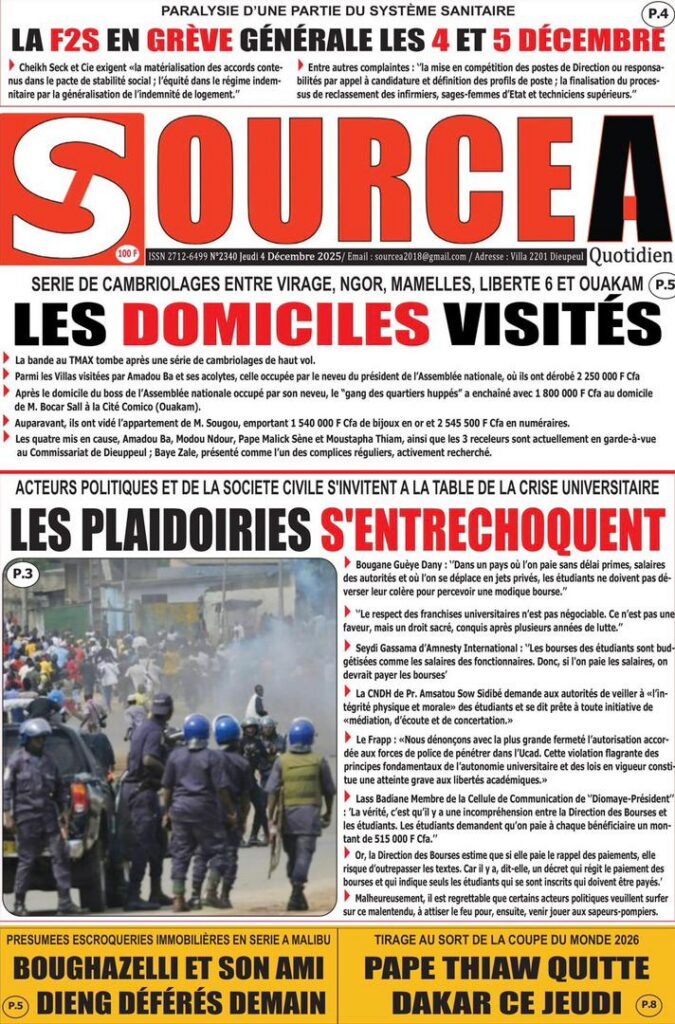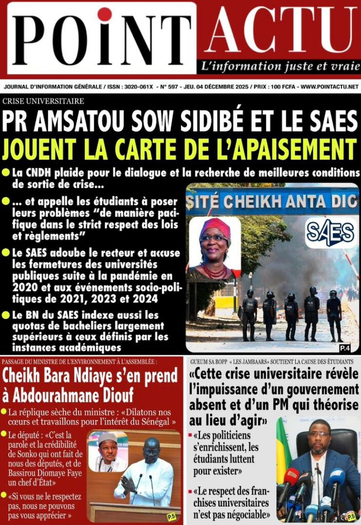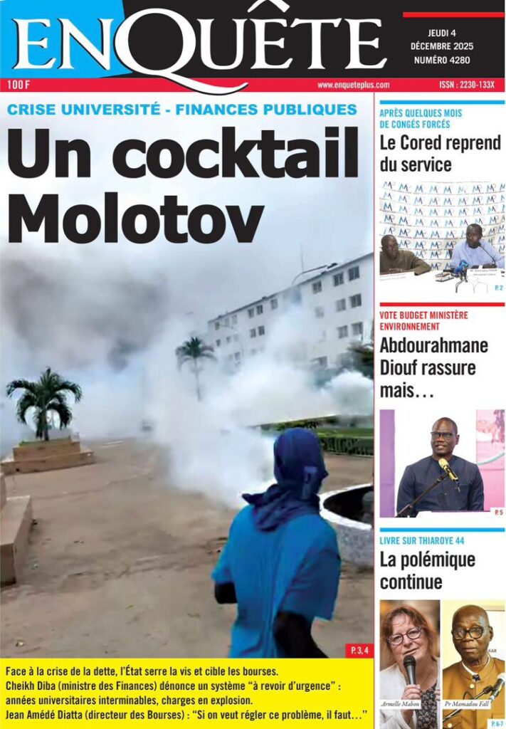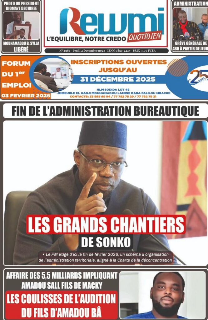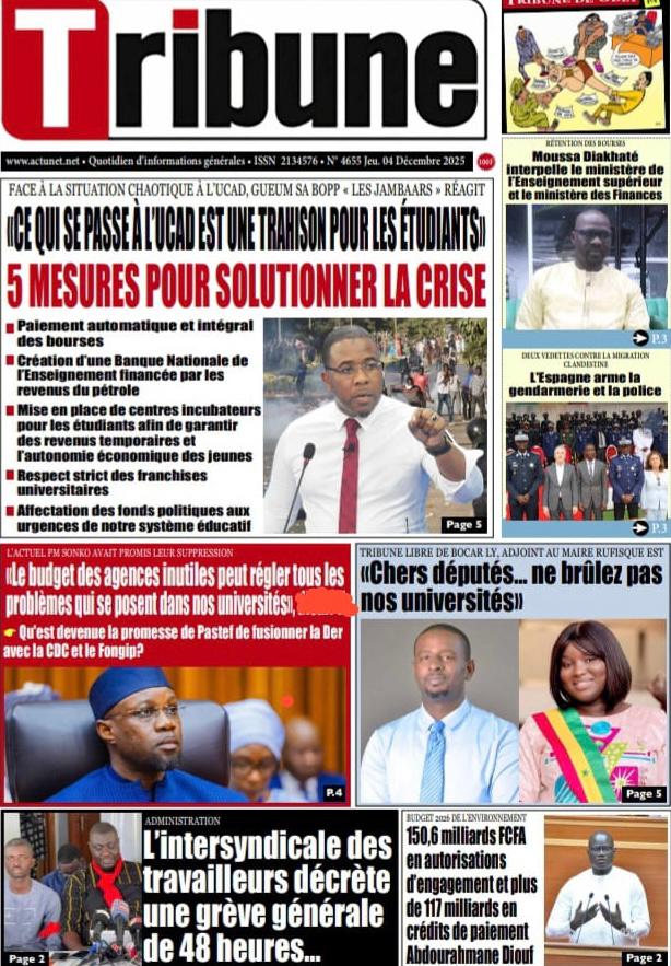 Ce jeudi 04 décembre 2025, l’actualité nationale est dominée par les tensions sociales, les réformes engagées par le gouvernement, les remous dans le secteur universitaire, ainsi que plusieurs affaires judiciaires et politiques. Voici l’essentiel des Unes des quotidiens sénégalais.