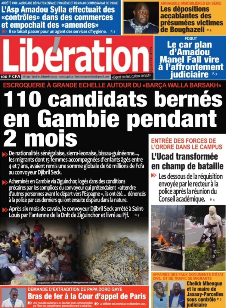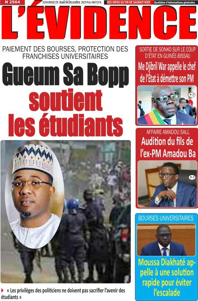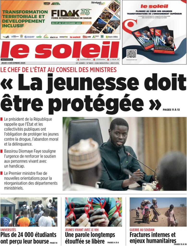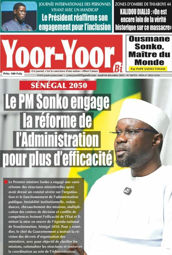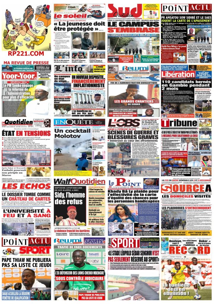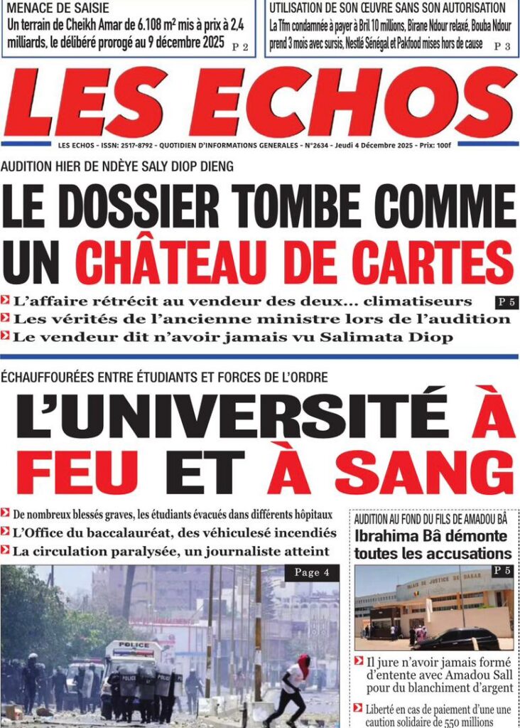 Ce jeudi 04 décembre 2025, l’actualité nationale est dominée par les tensions sociales, les réformes engagées par le gouvernement, les remous dans le secteur universitaire, ainsi que plusieurs affaires judiciaires et politiques. Voici l’essentiel des Unes des quotidiens sénégalais.