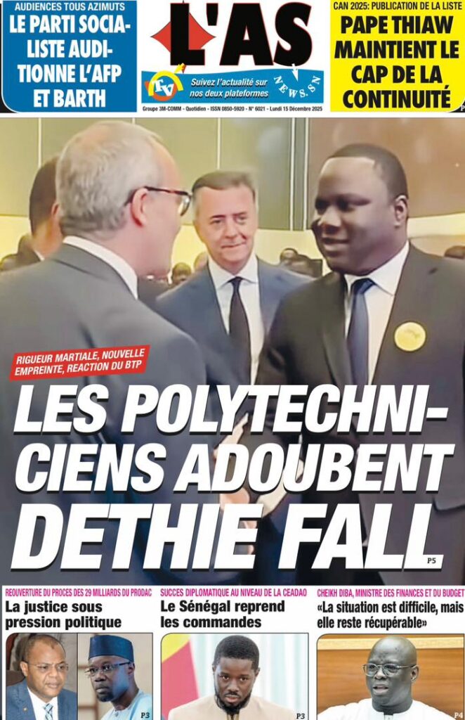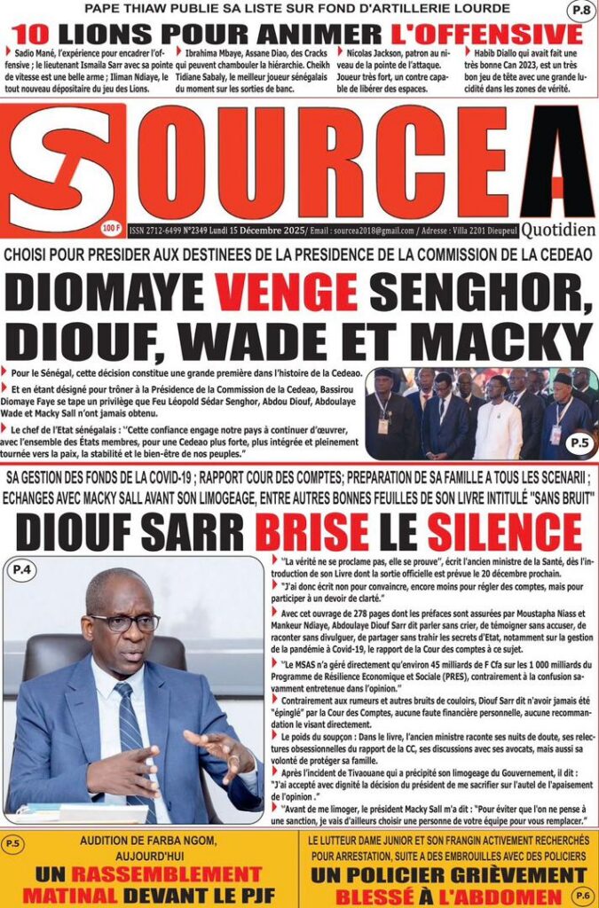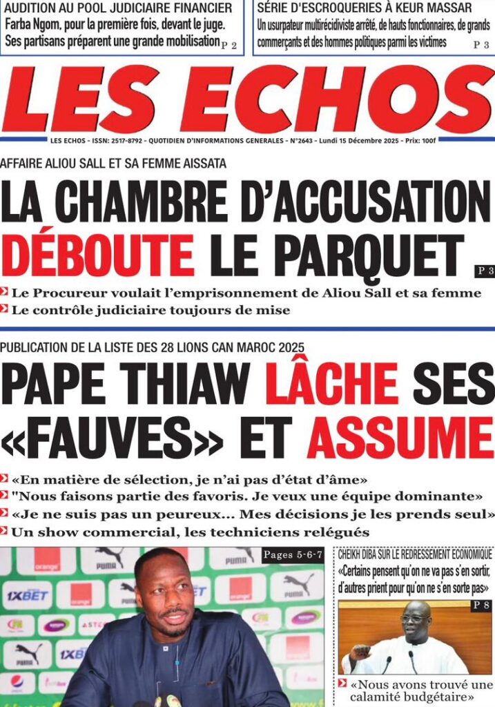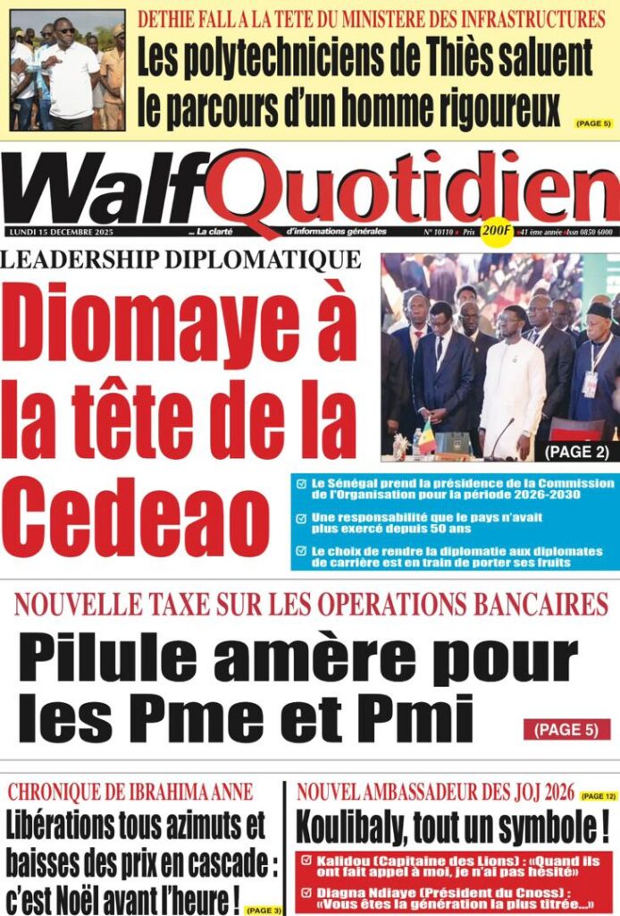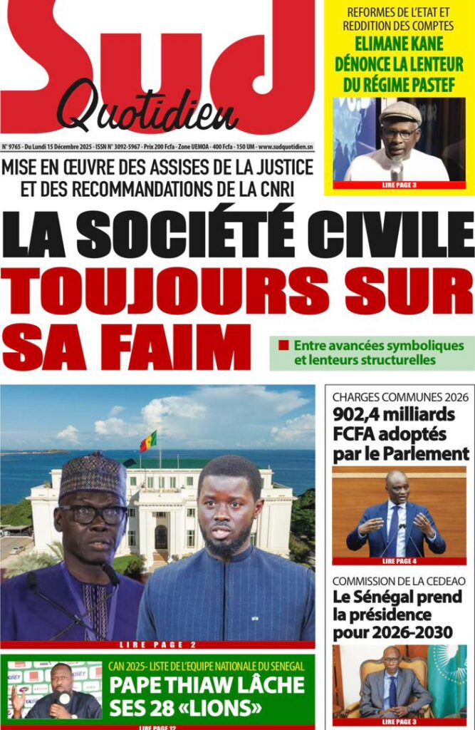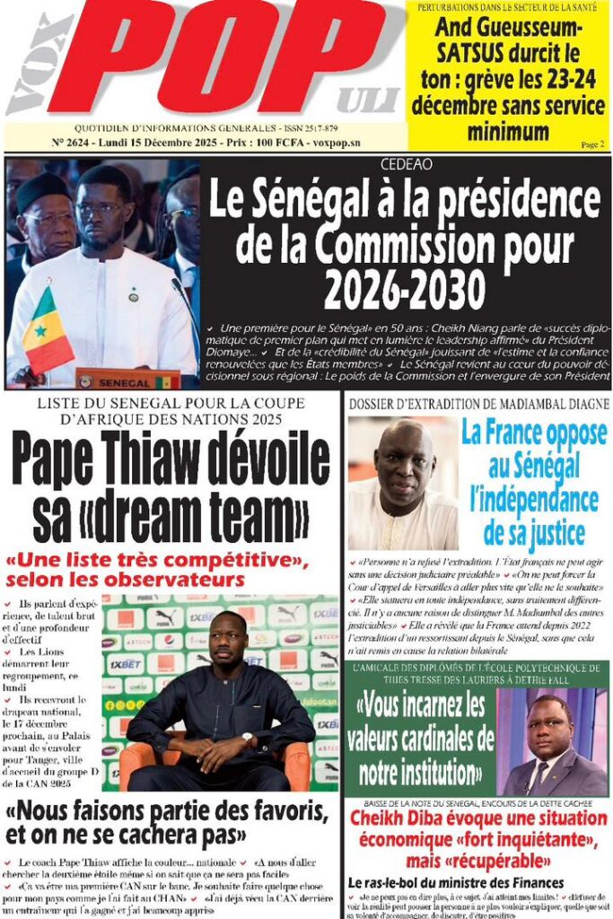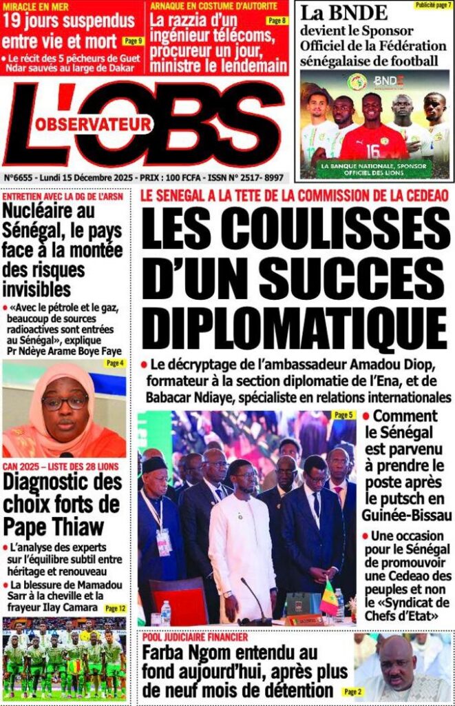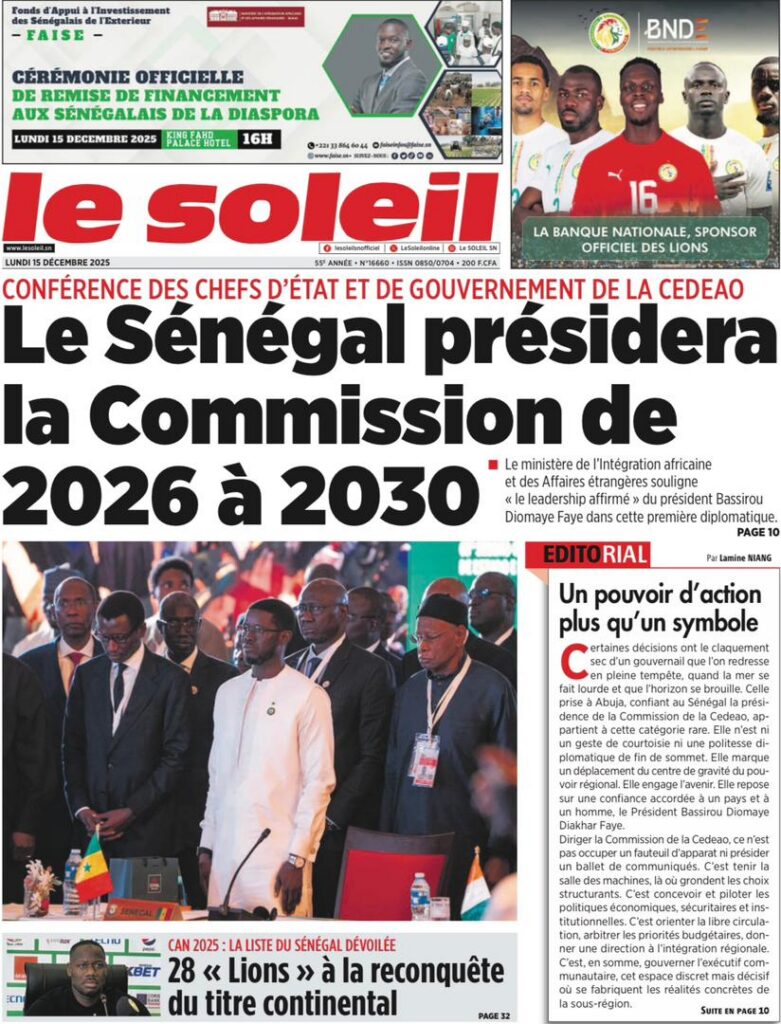 L’actualité sénégalaise de ce lundi 15 décembre 2025 est dominée par les questions de leadership diplomatique, de gestion des finances publiques, de tensions politiques et judiciaires, sans oublier les enjeux sportifs à l’approche des grandes échéances continentales