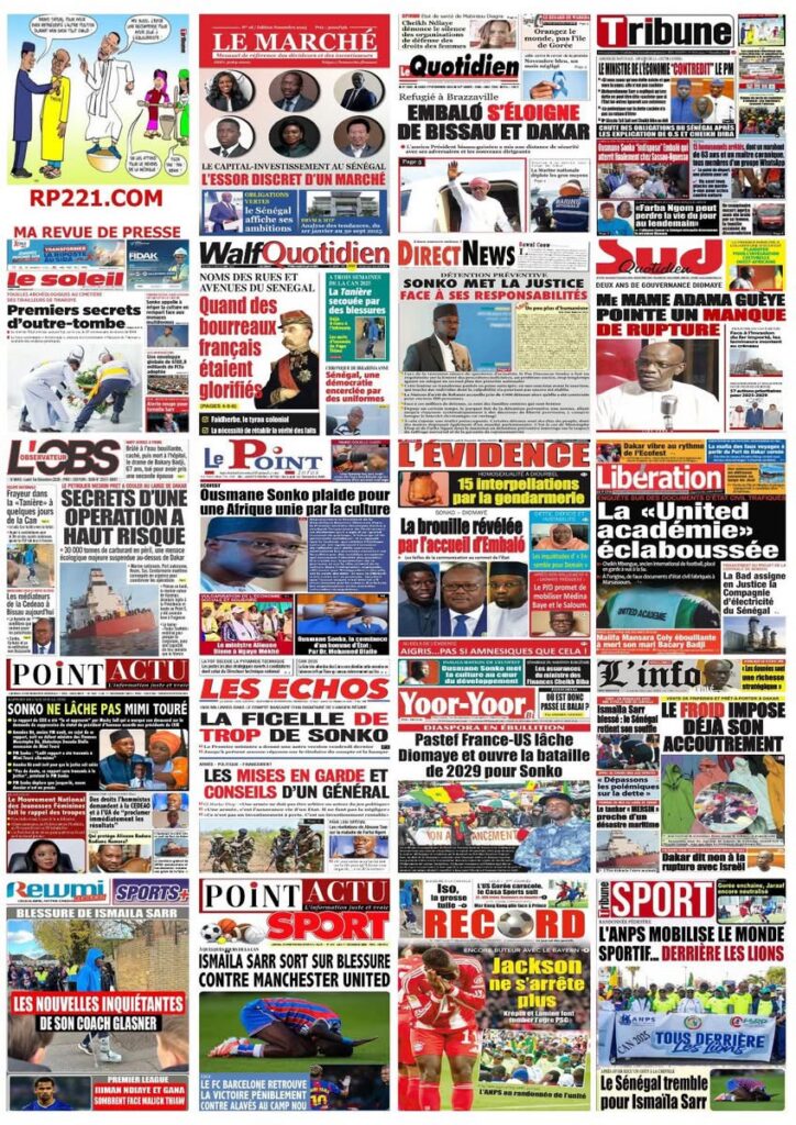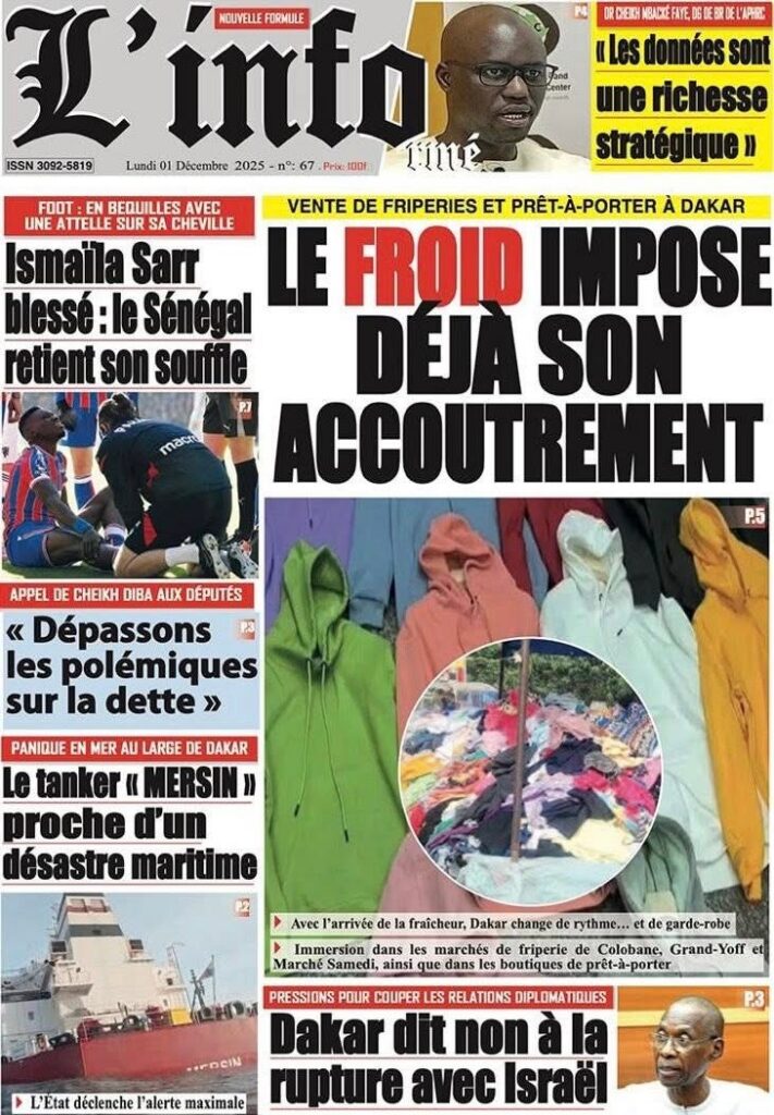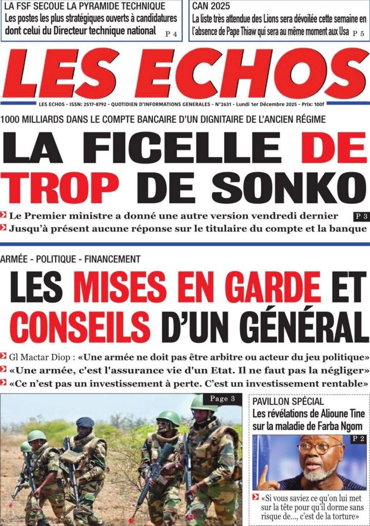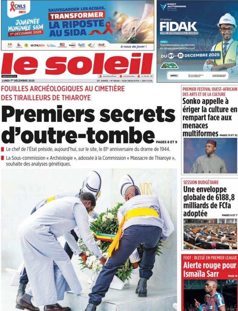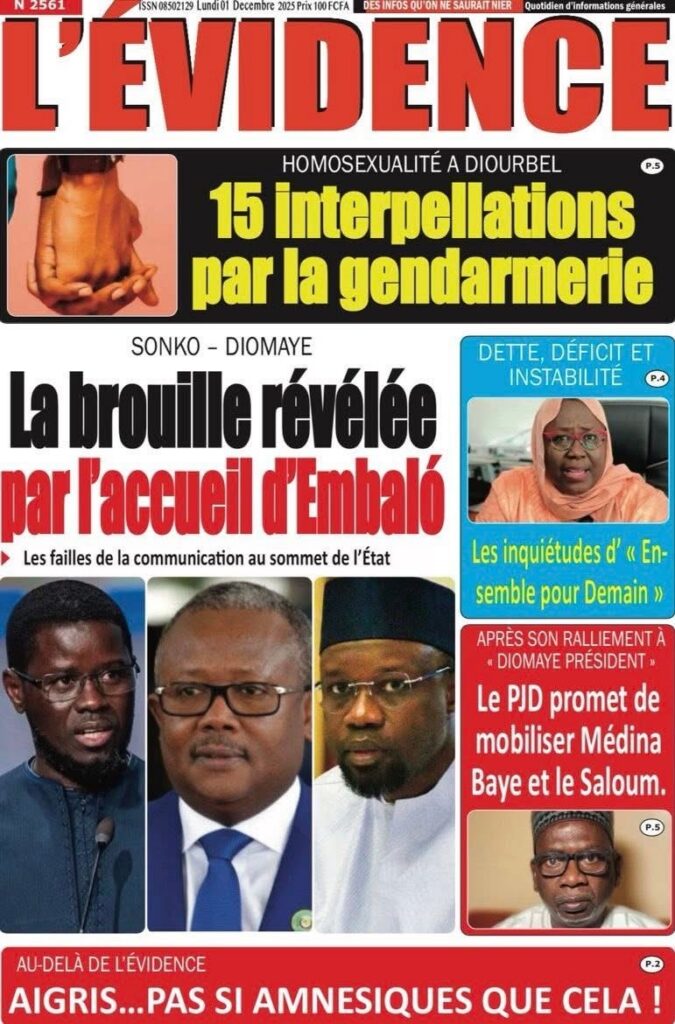 En ce lundi 1er décembre 2025, la presse sénégalaise ouvre le dernier mois de l’année avec une actualité dense : politique, justice, tensions diplomatiques, révélations sécuritaires, et inquiétudes sportives rythment les manchettes. Voici l’essentiel à retenir.