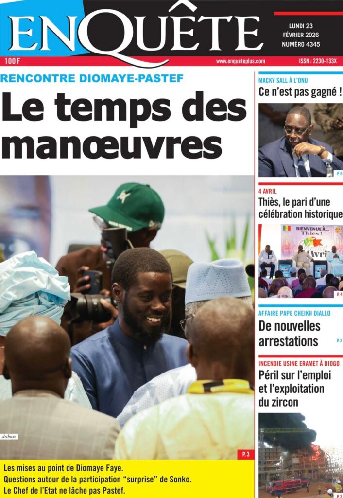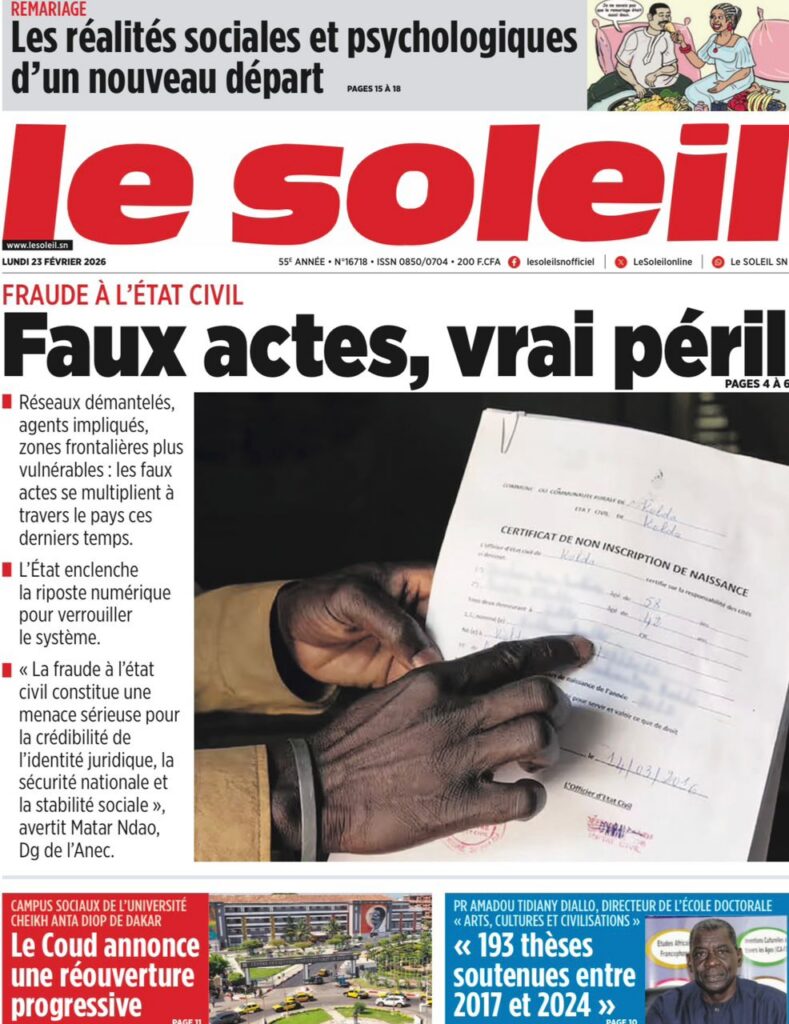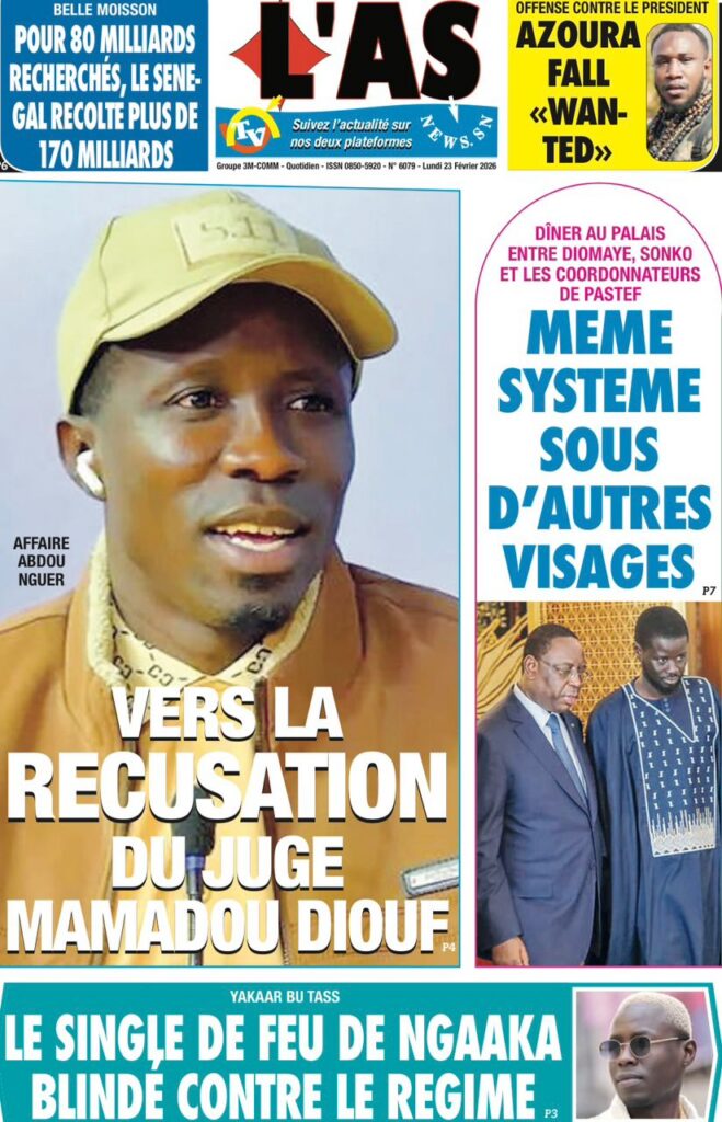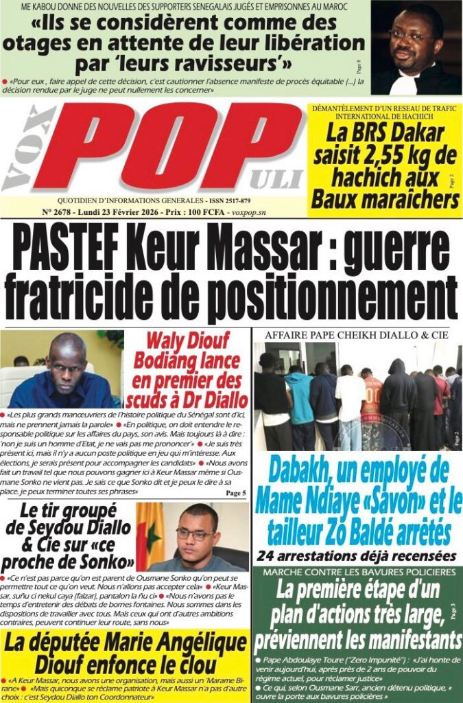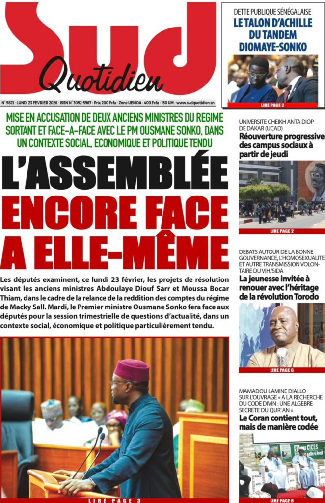 La presse nationale de ce lundi 23 février 2026 est largement dominée par des affaires judiciaires à fort retentissement, des tensions politiques persistantes et plusieurs dossiers sociaux sensibles. Tour d’horizon des principaux titres.