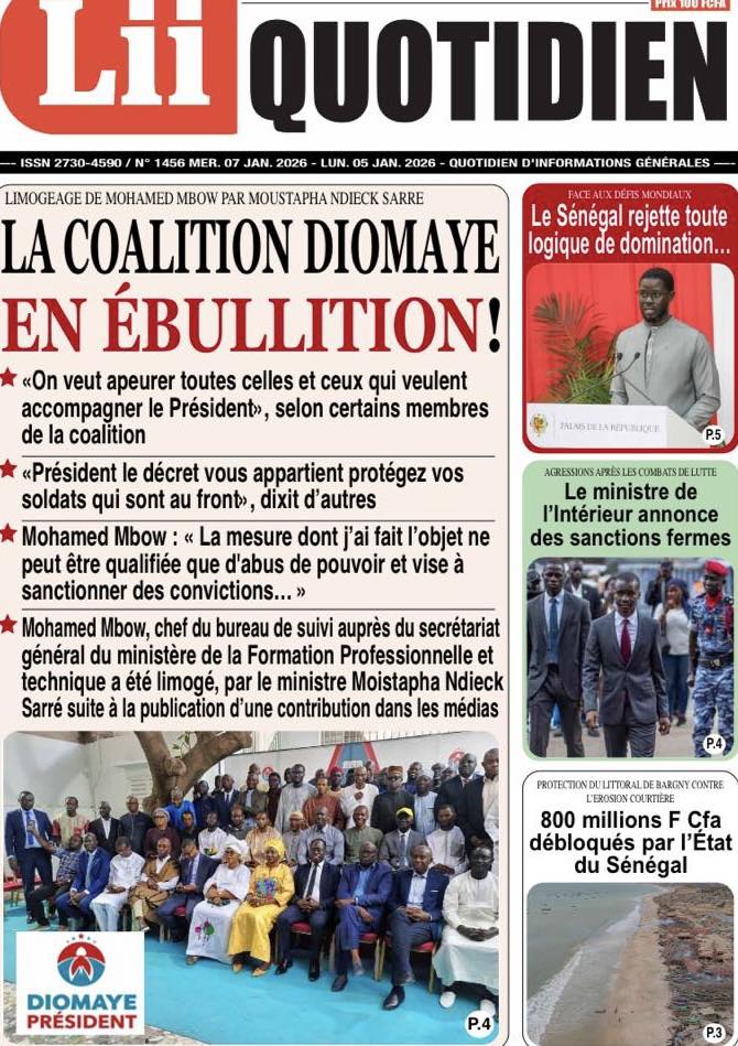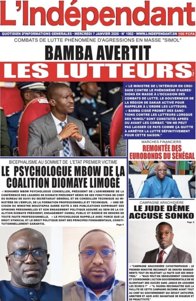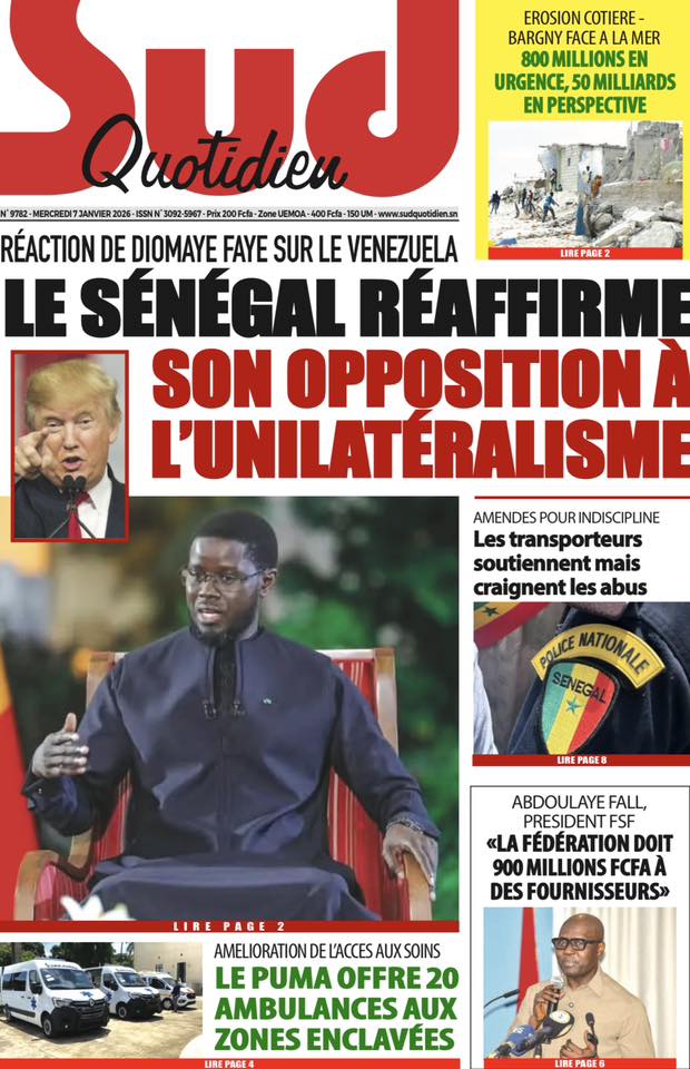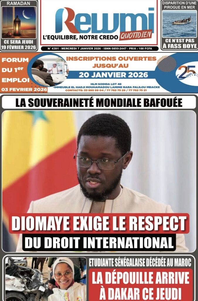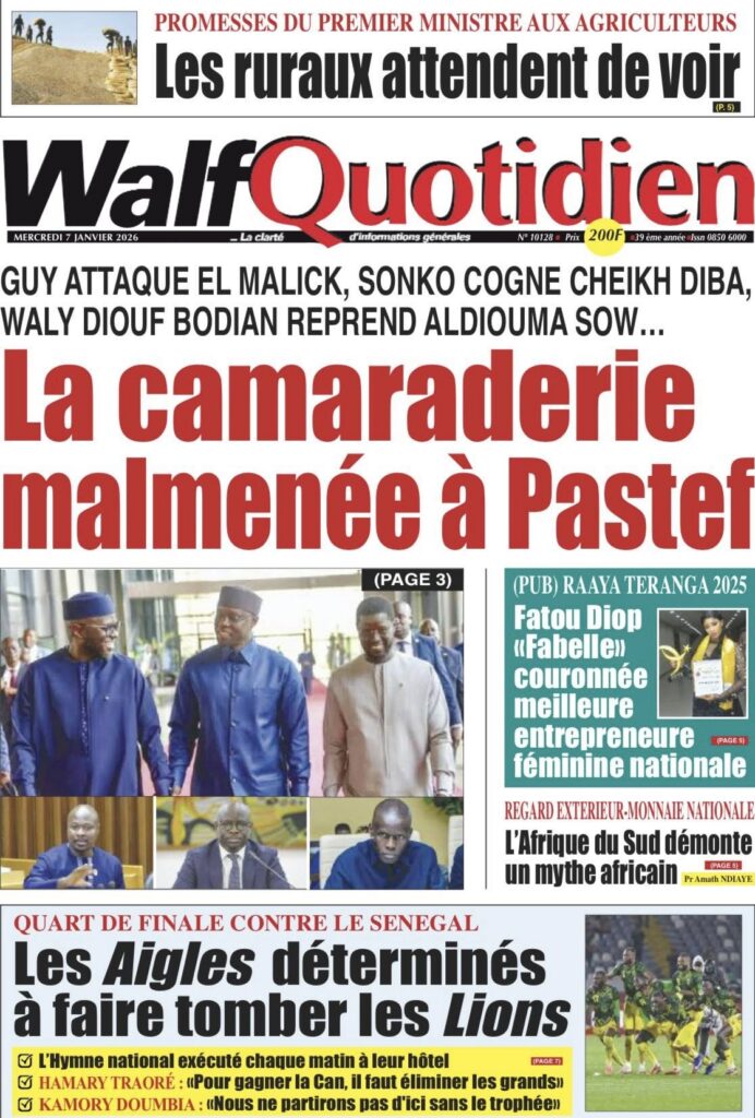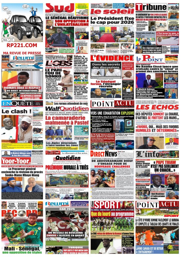 La presse sénégalaise de ce mercredi 07 janvier 2026 met en exergue trois grands centres d’intérêt : l’affirmation de la posture diplomatique du Sénégal sur la scène internationale, les recompositions en cours des équilibres politiques internes, et la montée en intensité de la Coupe d’Afrique des Nations 2025, marquée par des affiches de prestige et de fortes attentes autour des Lions.