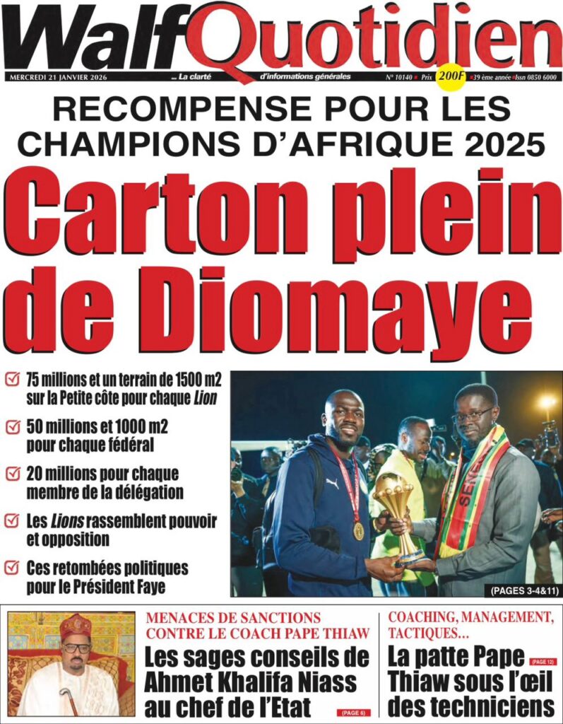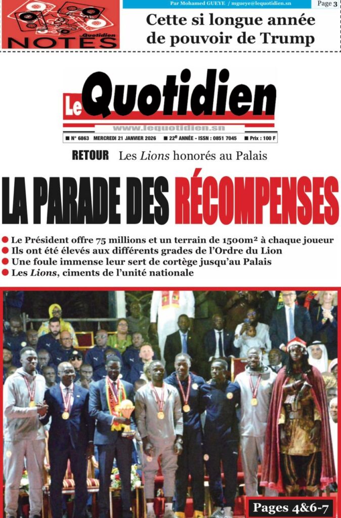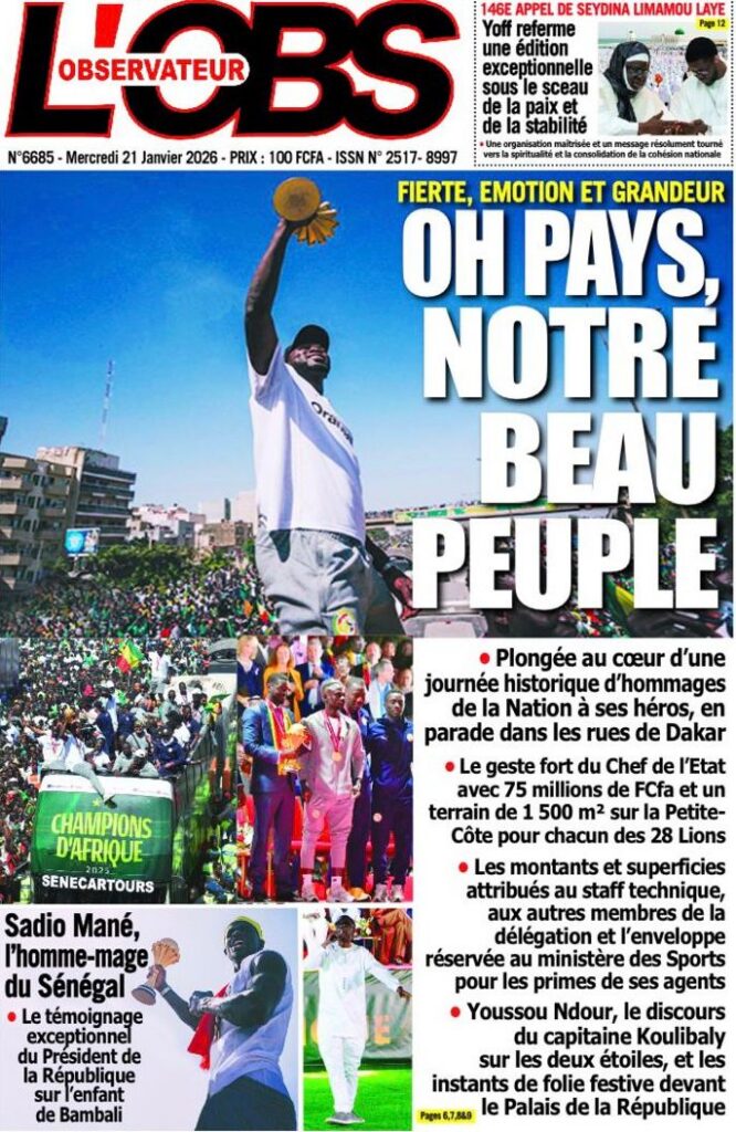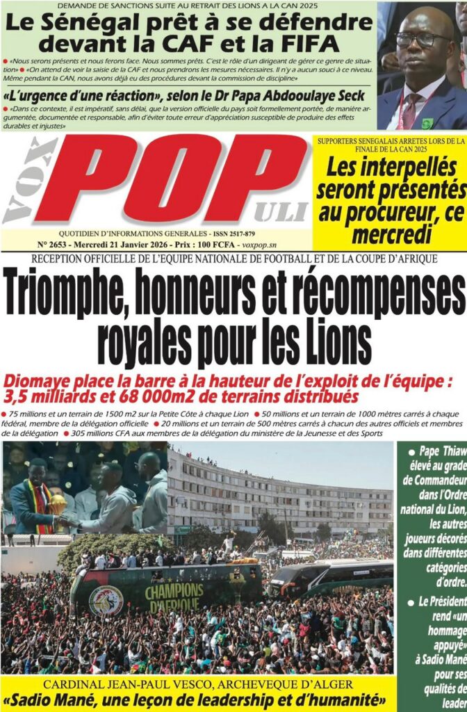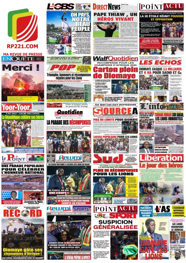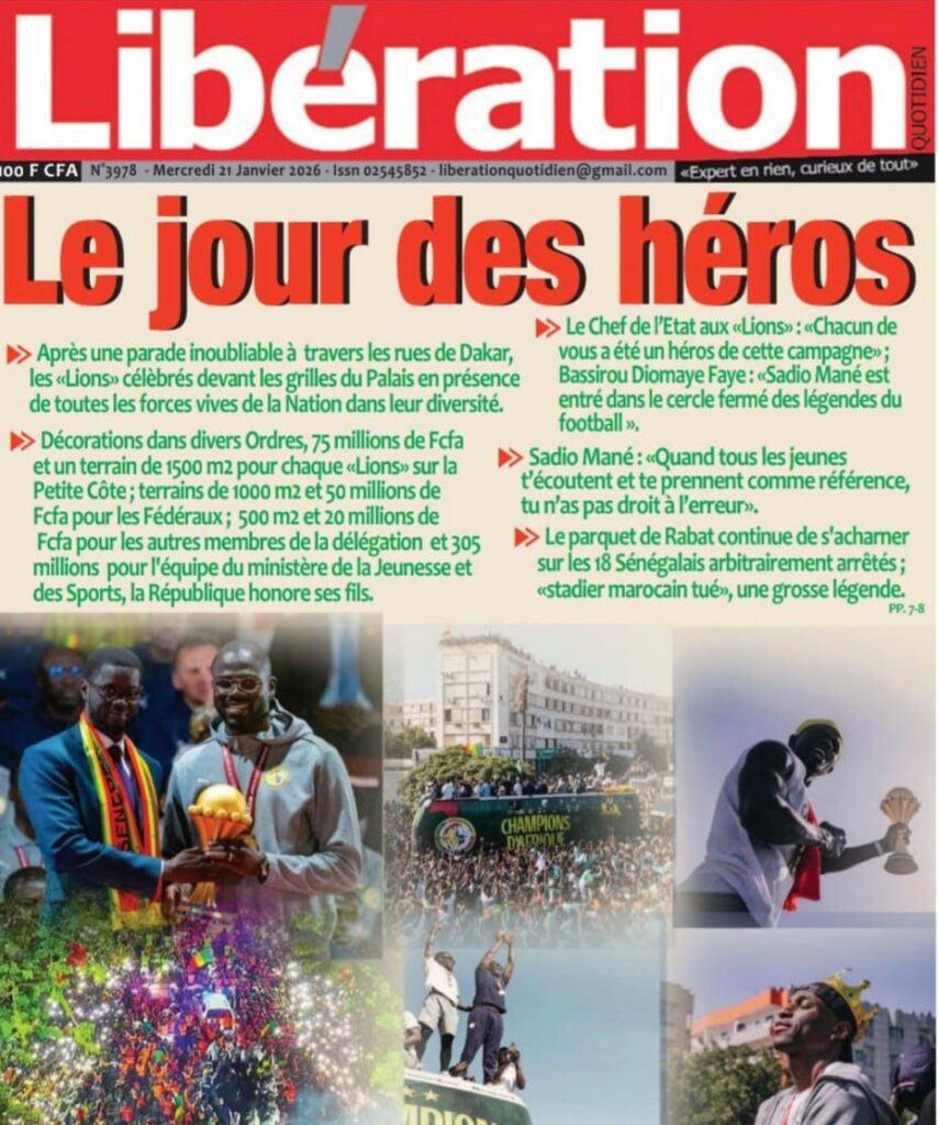 La presse sénégalaise de ce mercredi 21 janvier 2026 est largement dominée par un seul événement : la consécration nationale des Lions du Sénégal, sacrés champions d’Afrique, et la grande parade populaire organisée en leur honneur. Les journaux saluent unanimement une journée historique, marquée par la ferveur populaire, la reconnaissance de l’État et l’image d’un pays uni derrière ses champions.