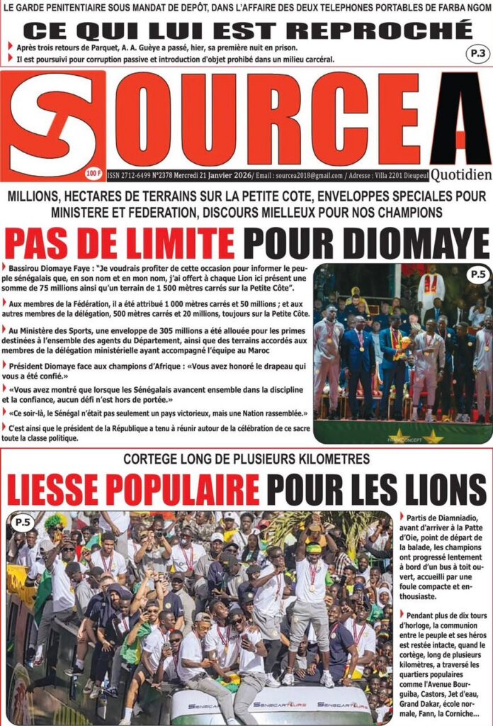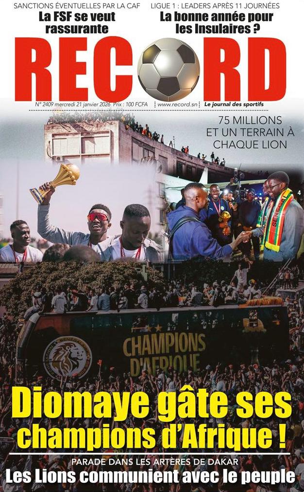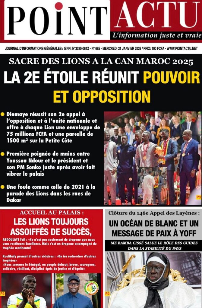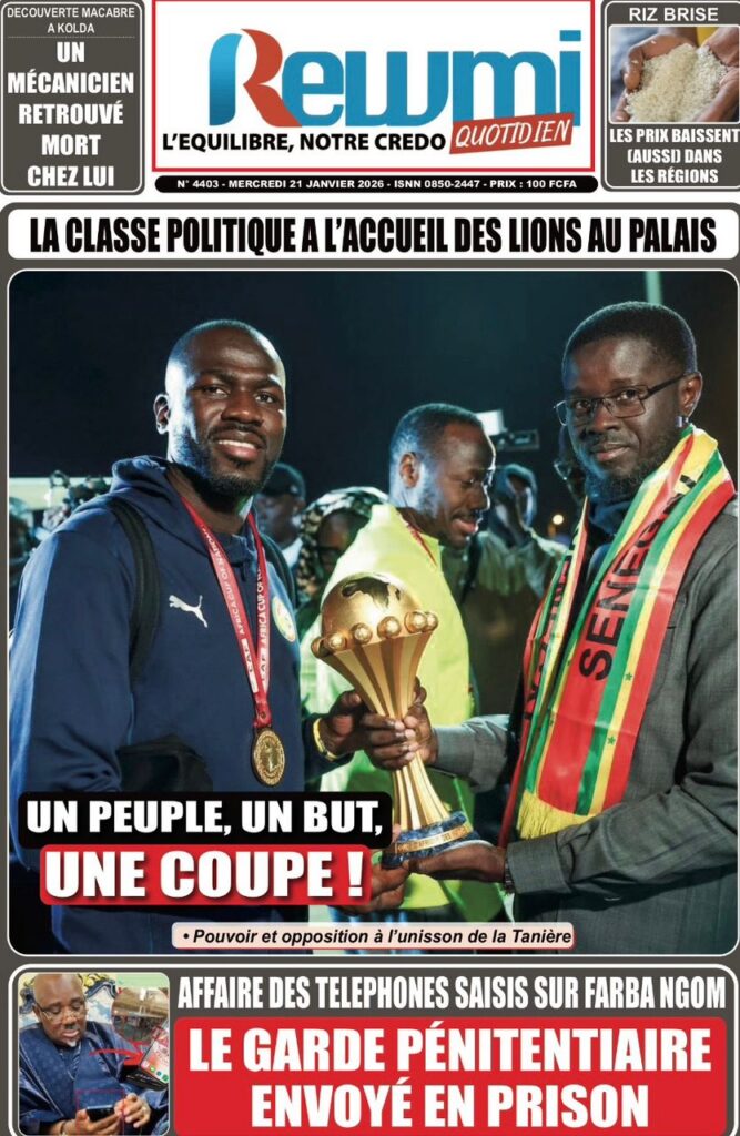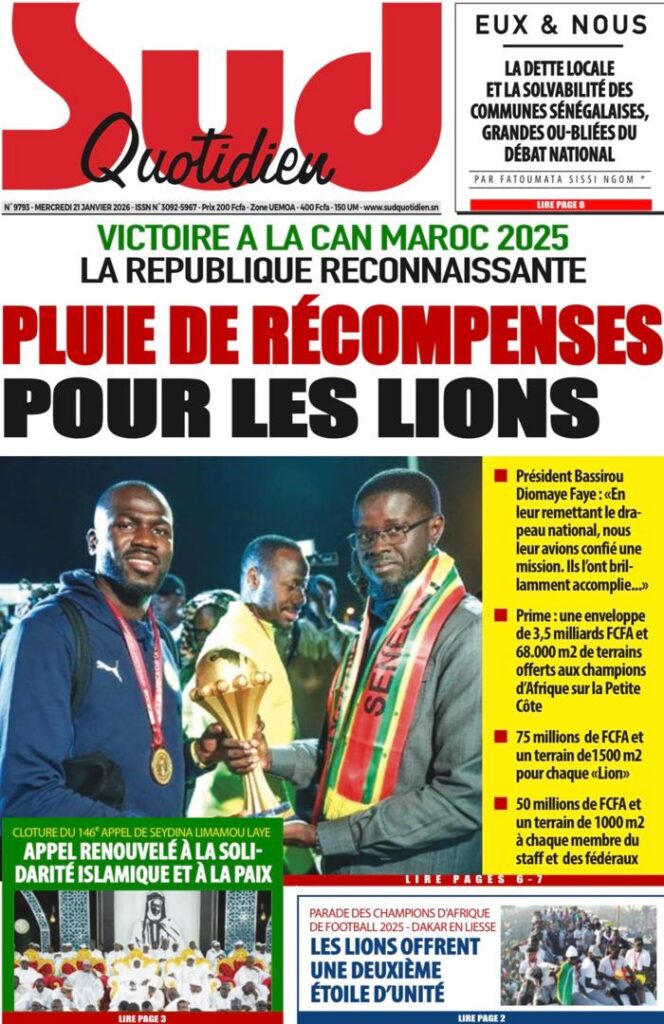 La presse sénégalaise de ce mercredi 21 janvier 2026 est largement dominée par un seul événement : la consécration nationale des Lions du Sénégal, sacrés champions d’Afrique, et la grande parade populaire organisée en leur honneur. Les journaux saluent unanimement une journée historique, marquée par la ferveur populaire, la reconnaissance de l’État et l’image d’un pays uni derrière ses champions.