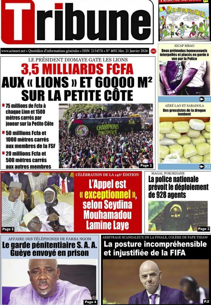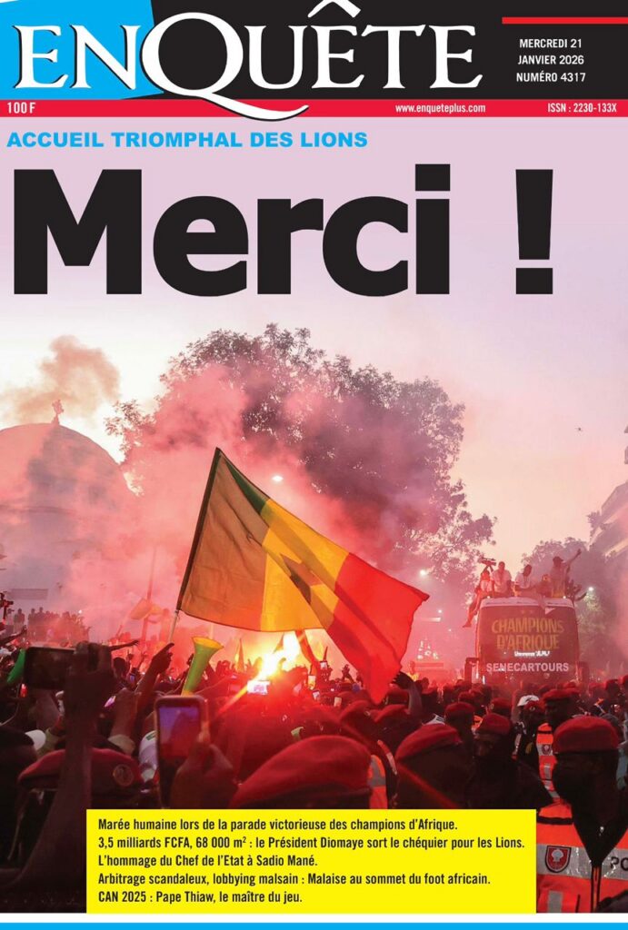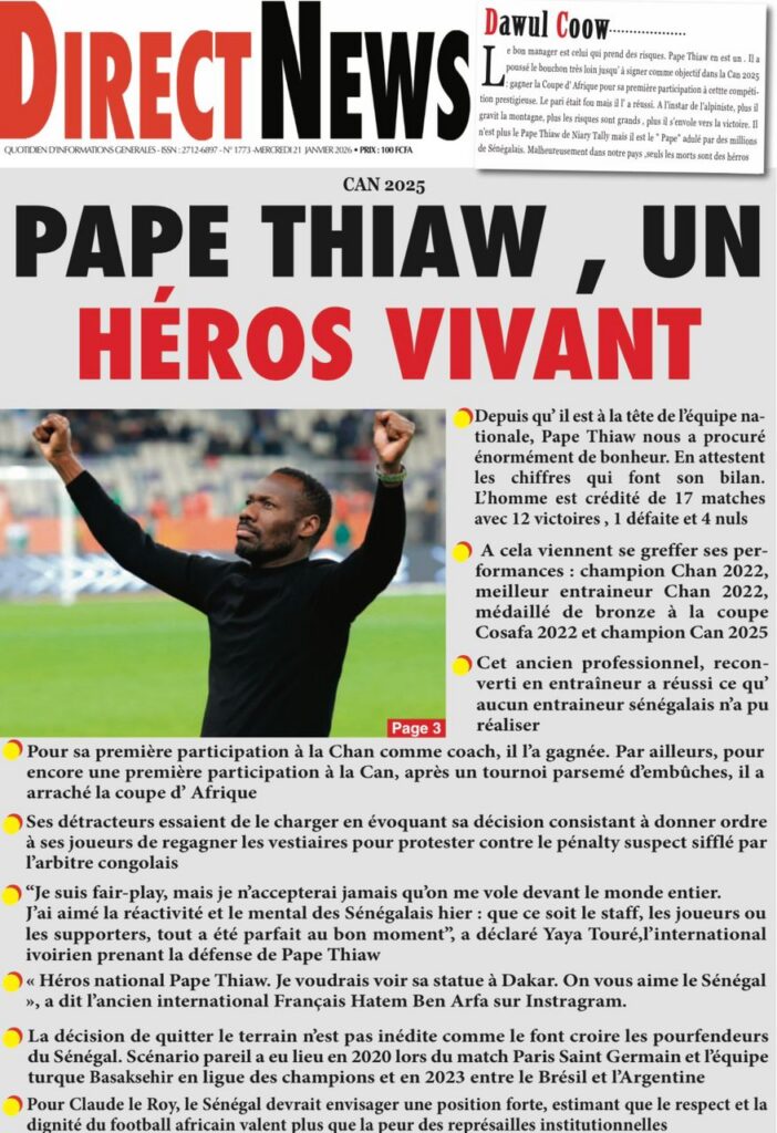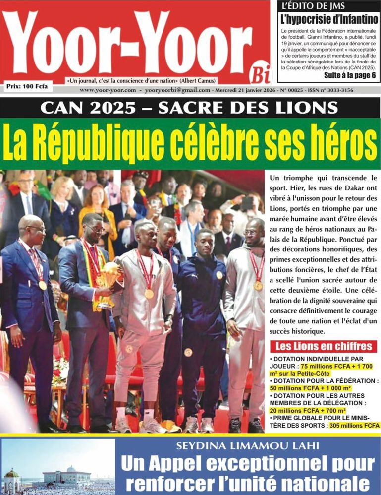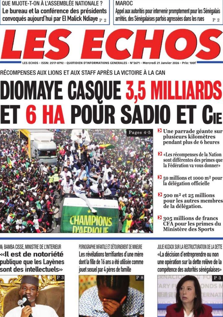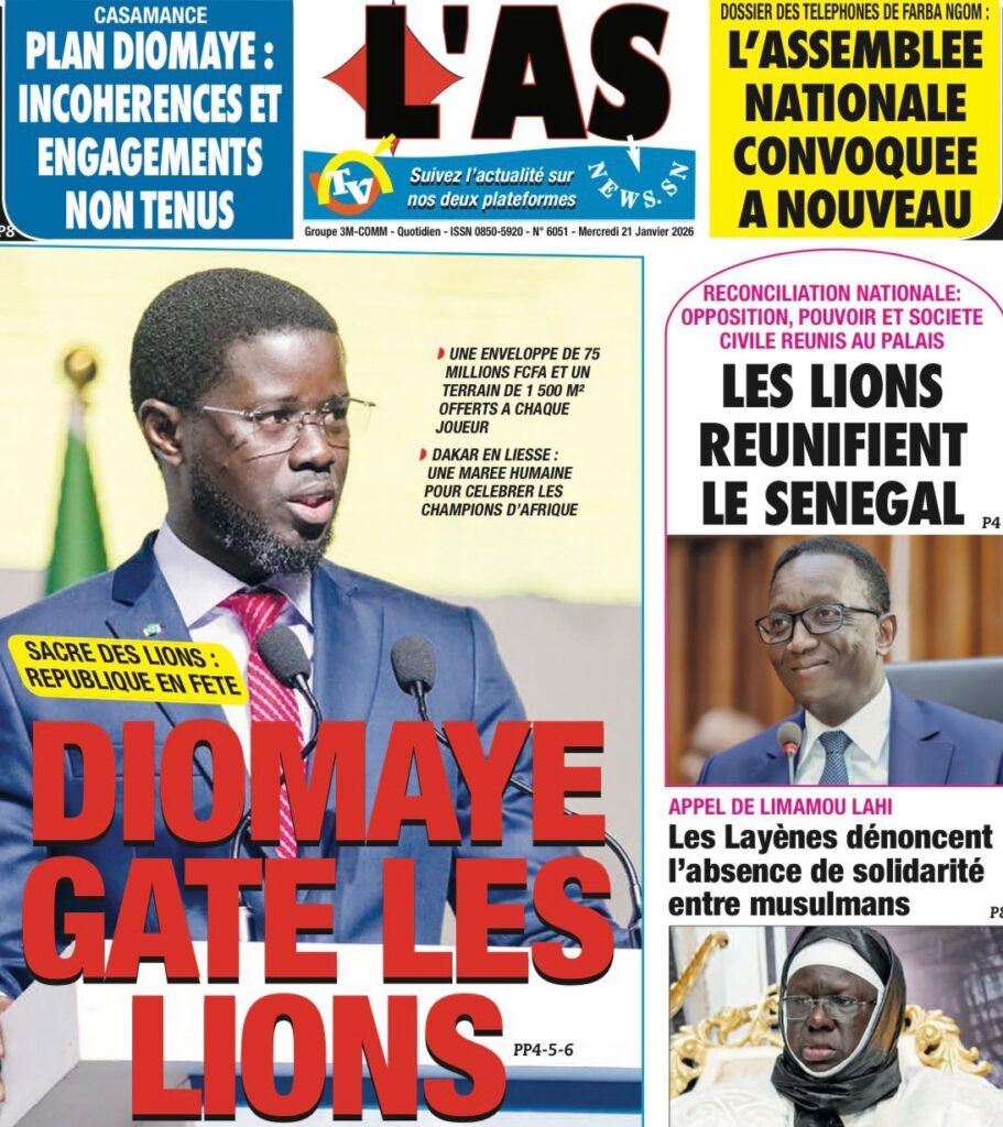 La presse sénégalaise de ce mercredi 21 janvier 2026 est largement dominée par un seul événement : la consécration nationale des Lions du Sénégal, sacrés champions d’Afrique, et la grande parade populaire organisée en leur honneur. Les journaux saluent unanimement une journée historique, marquée par la ferveur populaire, la reconnaissance de l’État et l’image d’un pays uni derrière ses champions.