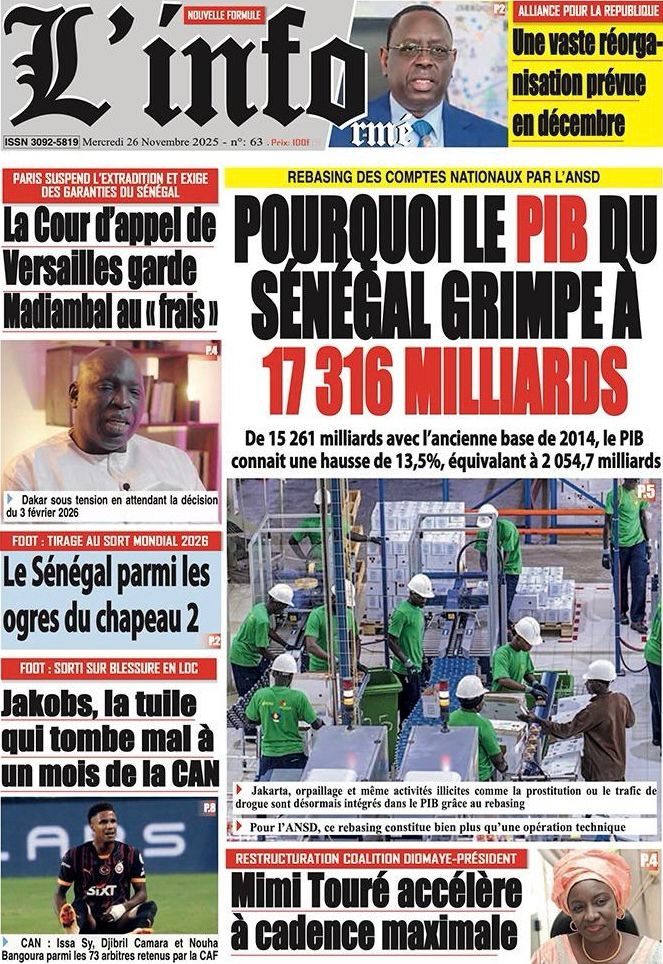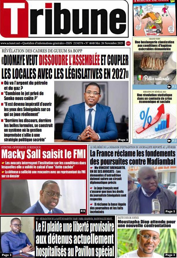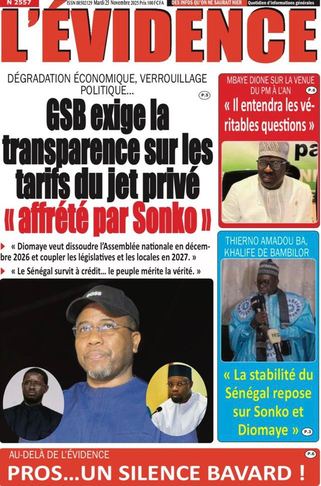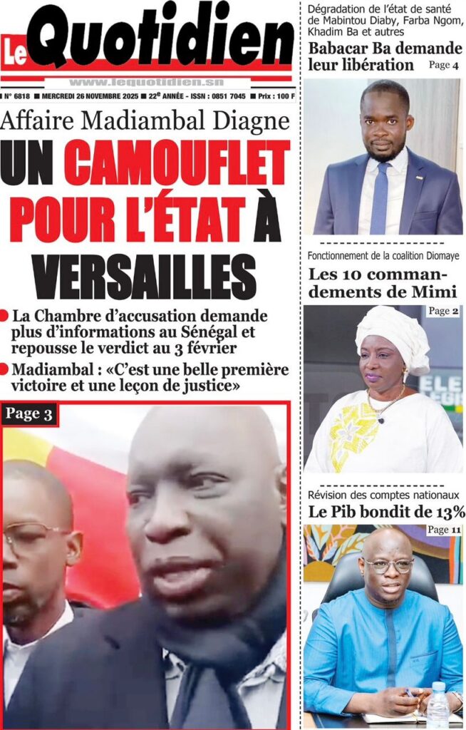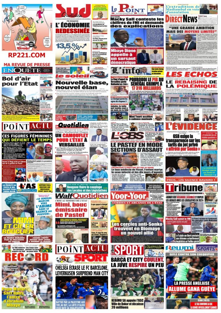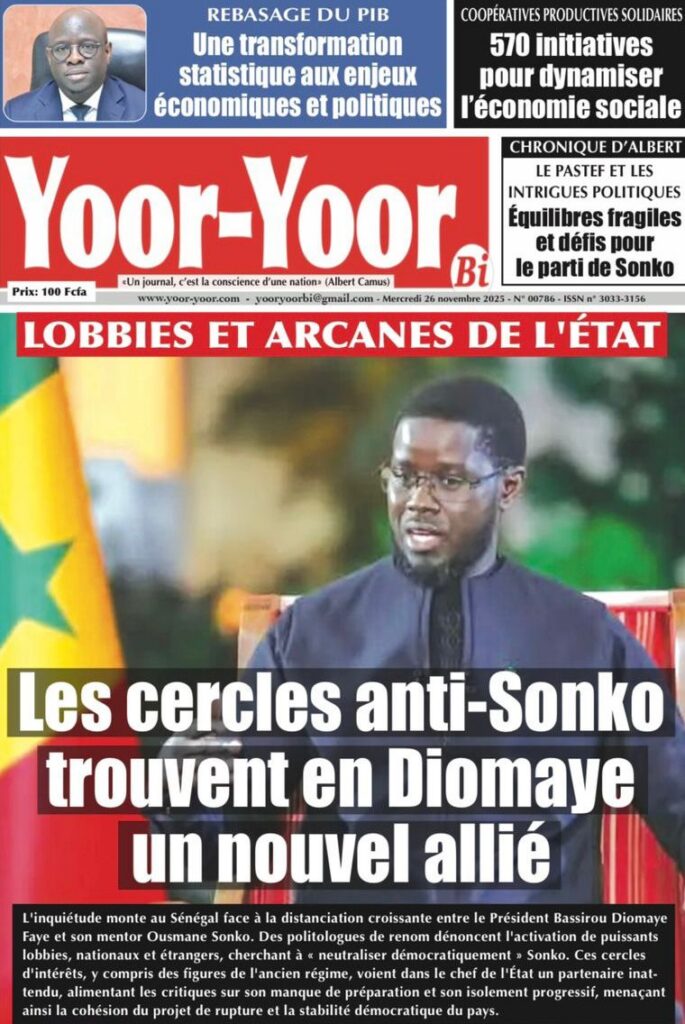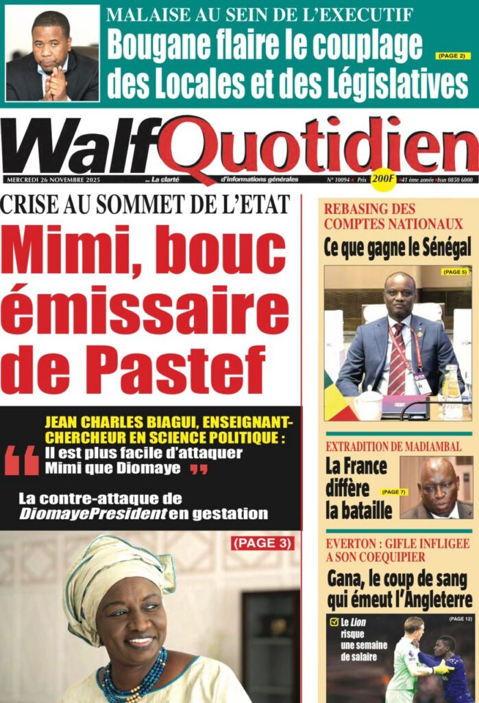 En ce mercredi 26 novembre, les quotidiens sénégalais reviennent largement sur la situation économique du pays, les turbulences politiques, les dossiers judiciaires sensibles, ainsi que sur les tensions autour du PDS, du Pastef et du gouvernement. Le sport n’est pas en reste, notamment avec les performances de Pape Matar Sarr et la presse anglaise qui encense Gana Gueye.