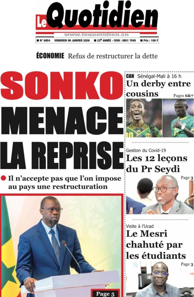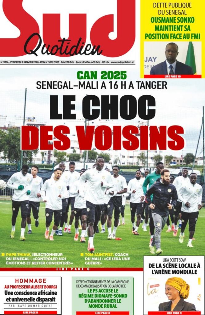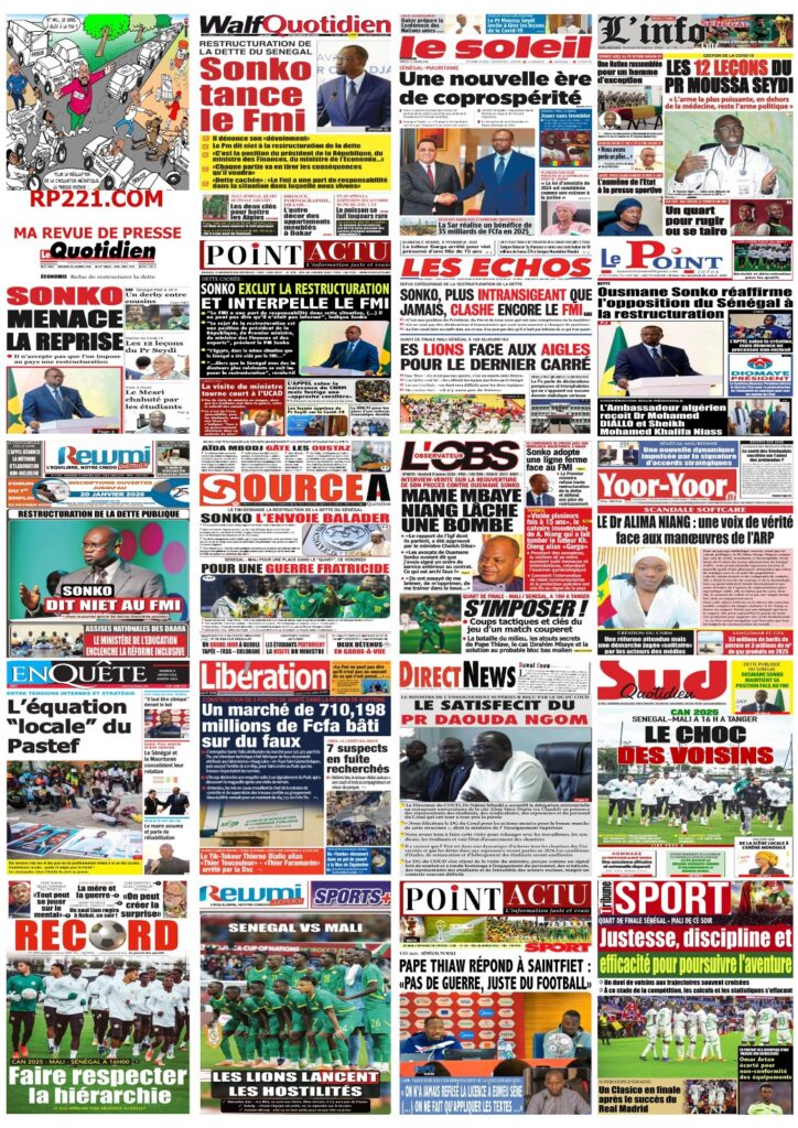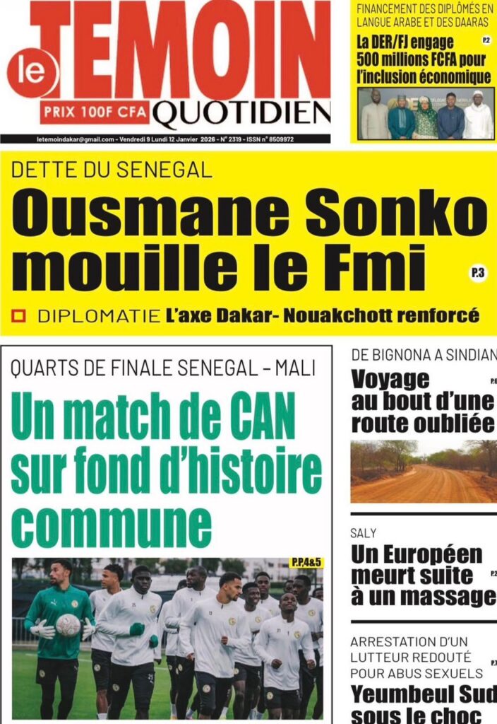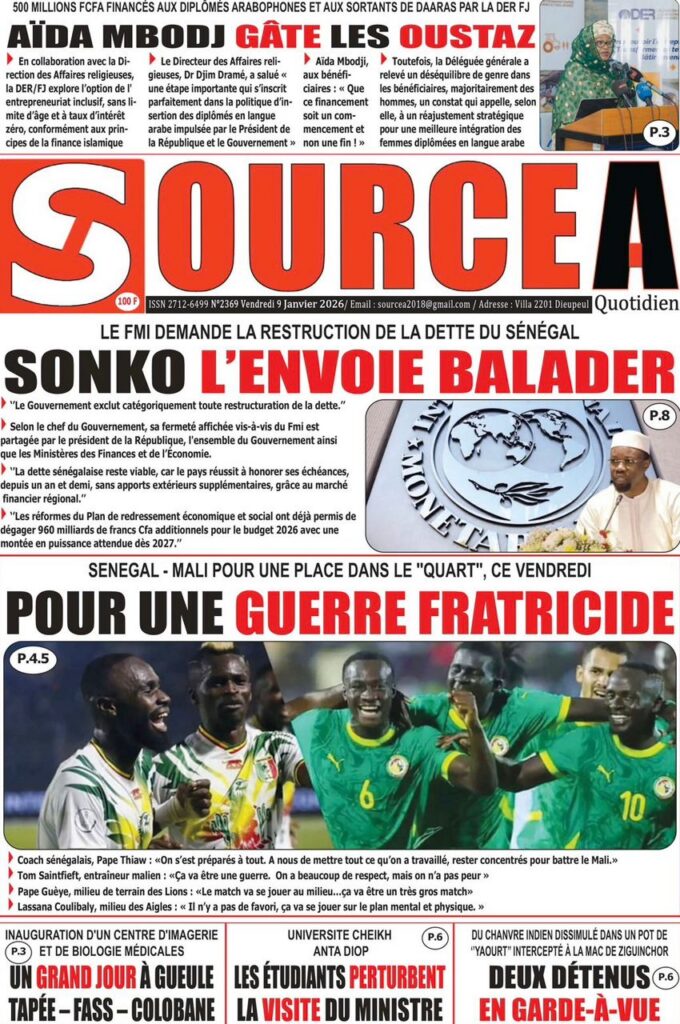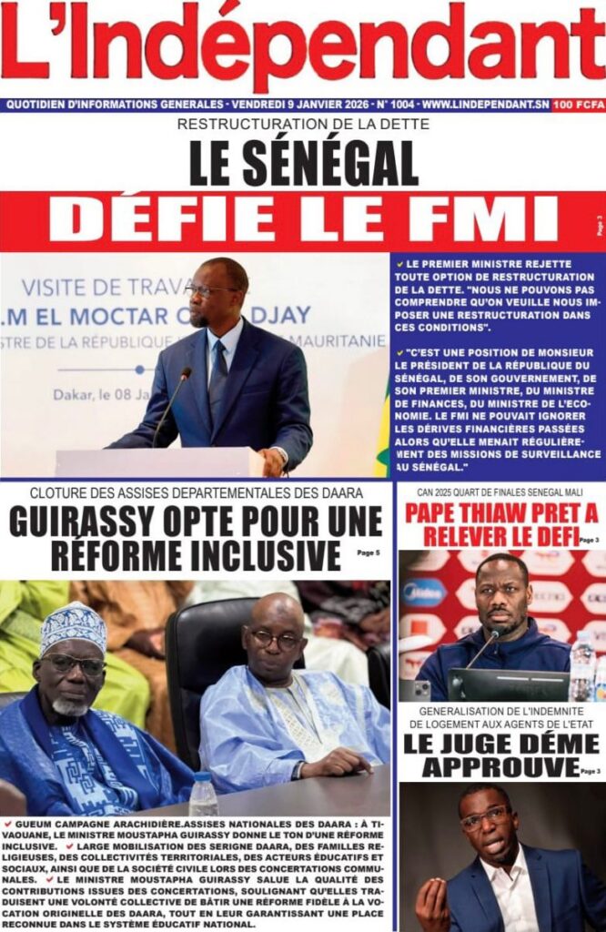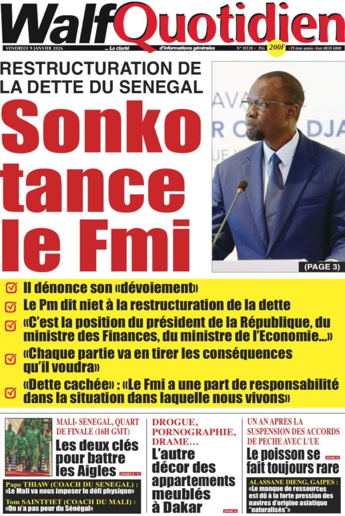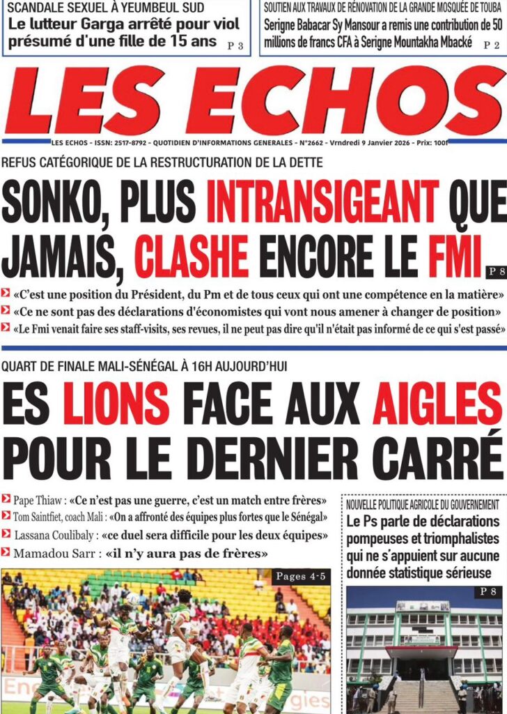 L’actualité sénégalaise de ce vendredi 09 janvier 2026 est largement dominée par le bras de fer entre le gouvernement d’Ousmane Sonko et le Fonds monétaire international (FMI), sur fond de restructuration de la dette publique. Dans le même temps, la CAN 2025 s’invite en une avec un quart de finale explosif entre le Sénégal et le Mali, tandis que d’autres sujets majeurs touchant la gouvernance, la justice et la société occupent l’espace médiatique.