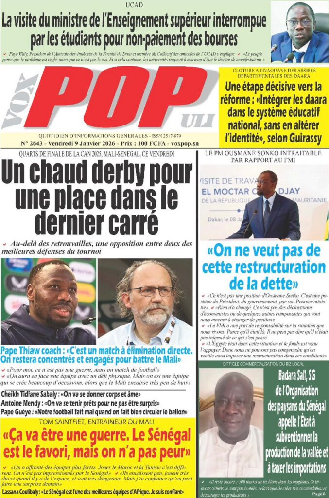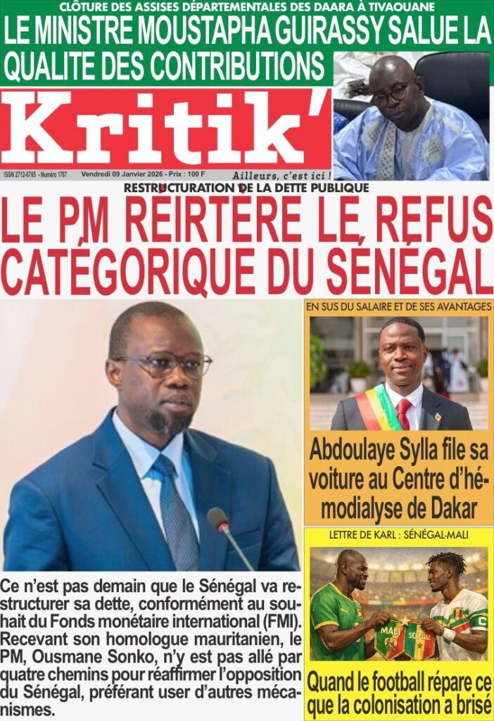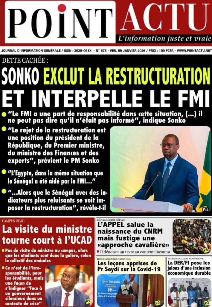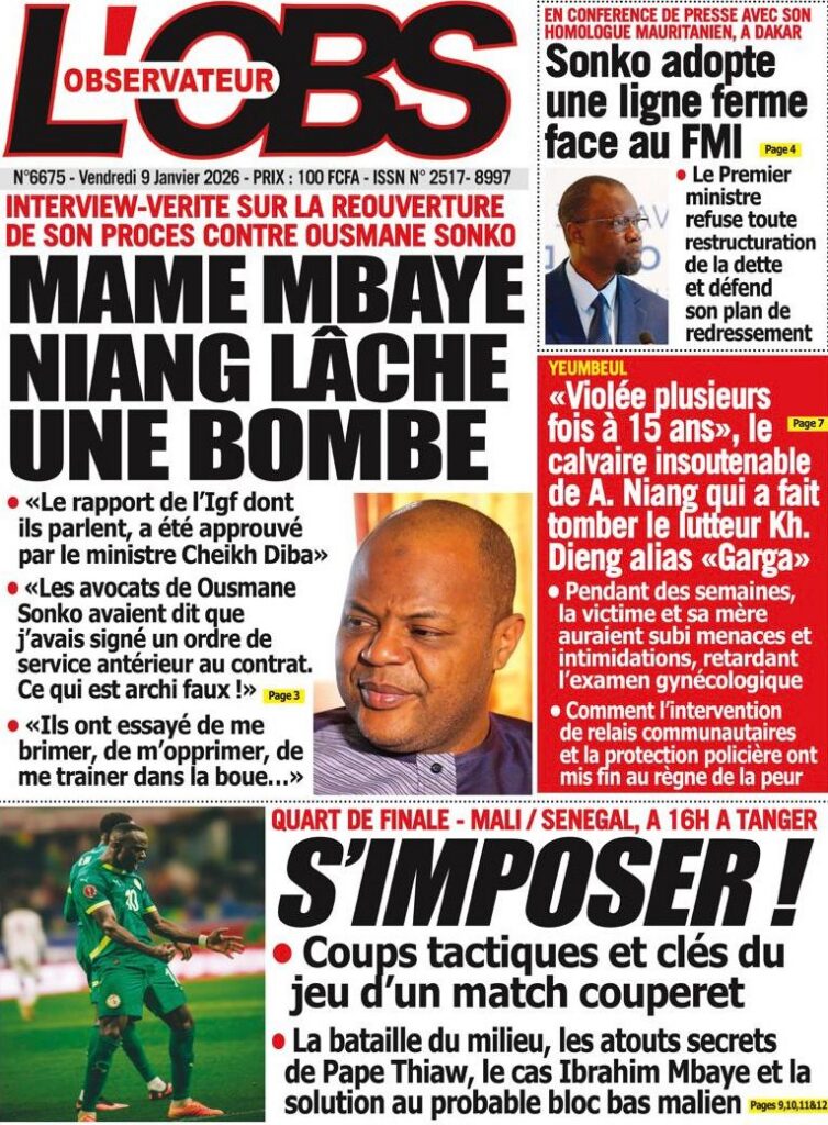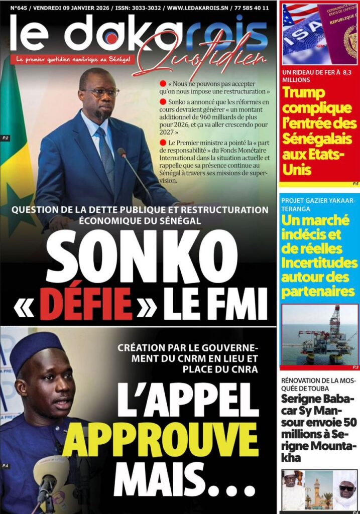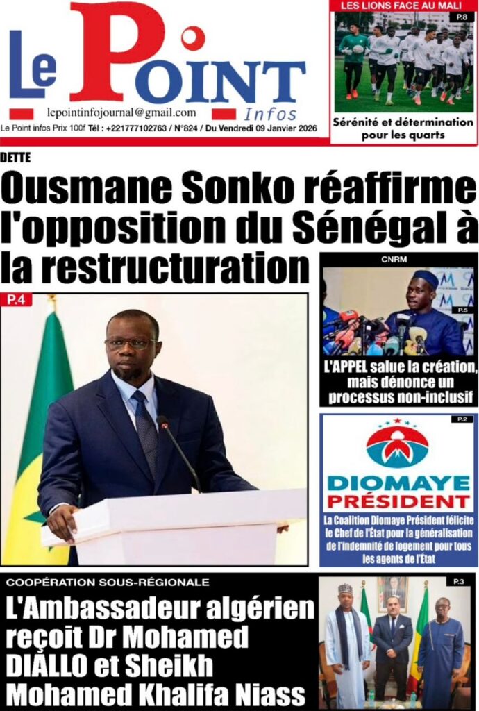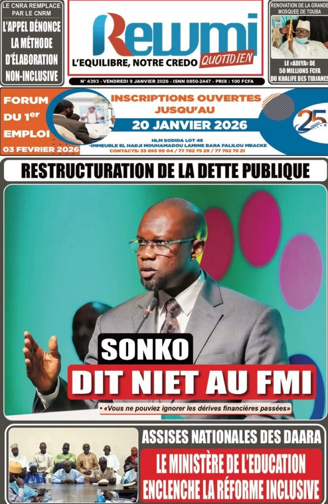 L’actualité sénégalaise de ce vendredi 09 janvier 2026 est largement dominée par le bras de fer entre le gouvernement d’Ousmane Sonko et le Fonds monétaire international (FMI), sur fond de restructuration de la dette publique. Dans le même temps, la CAN 2025 s’invite en une avec un quart de finale explosif entre le Sénégal et le Mali, tandis que d’autres sujets majeurs touchant la gouvernance, la justice et la société occupent l’espace médiatique.