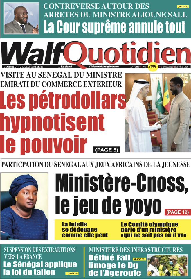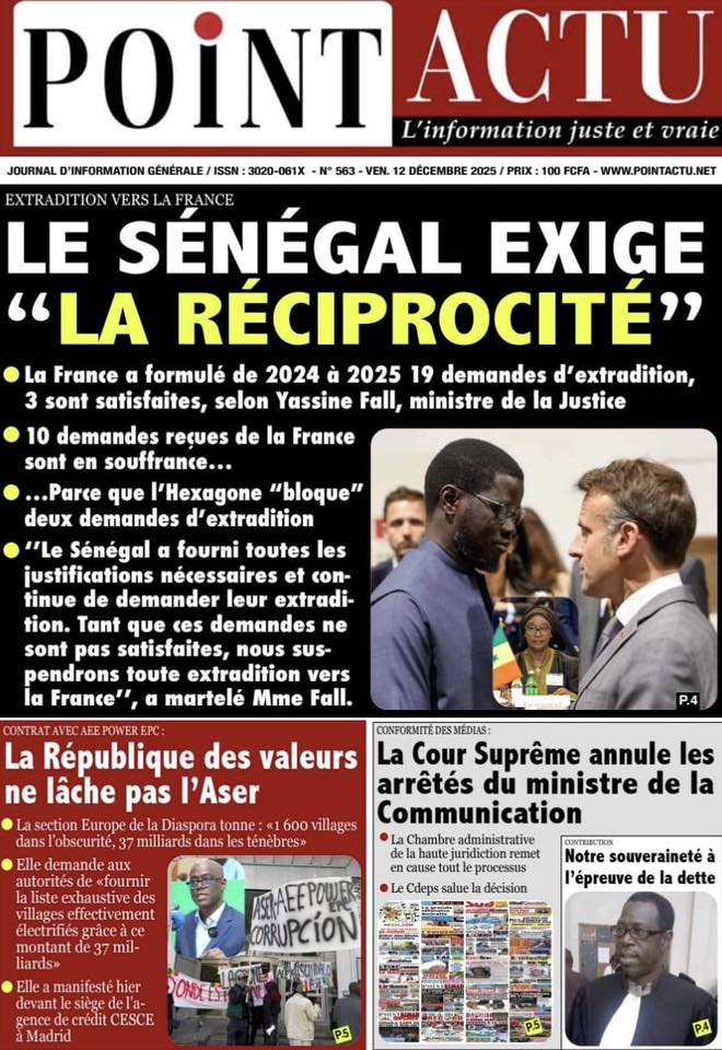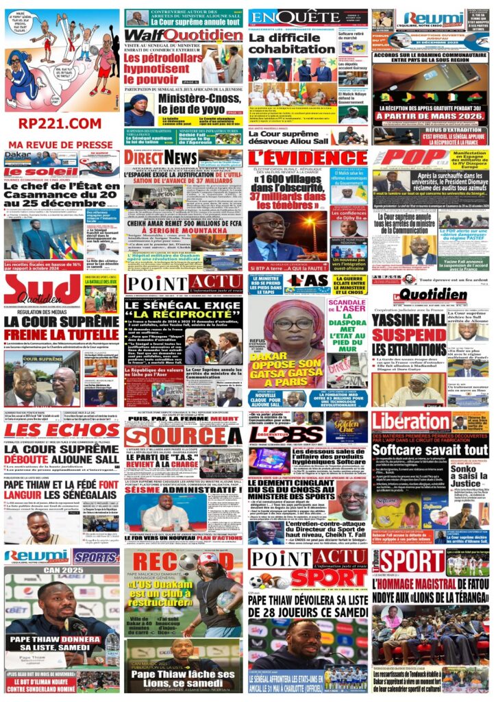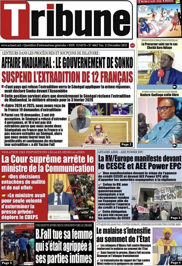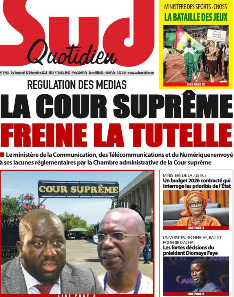 Ce vendredi 12 décembre 2025, les quotidiens sénégalais reviennent largement sur les secousses judiciaires et administratives qui rythment la vie publique. Entre décisions fortes de la Cour suprême, exigences diplomatiques, polémiques dans le secteur de la communication et annonces sportives, l’actualité nationale se décline en tensions, verdicts et attentes.