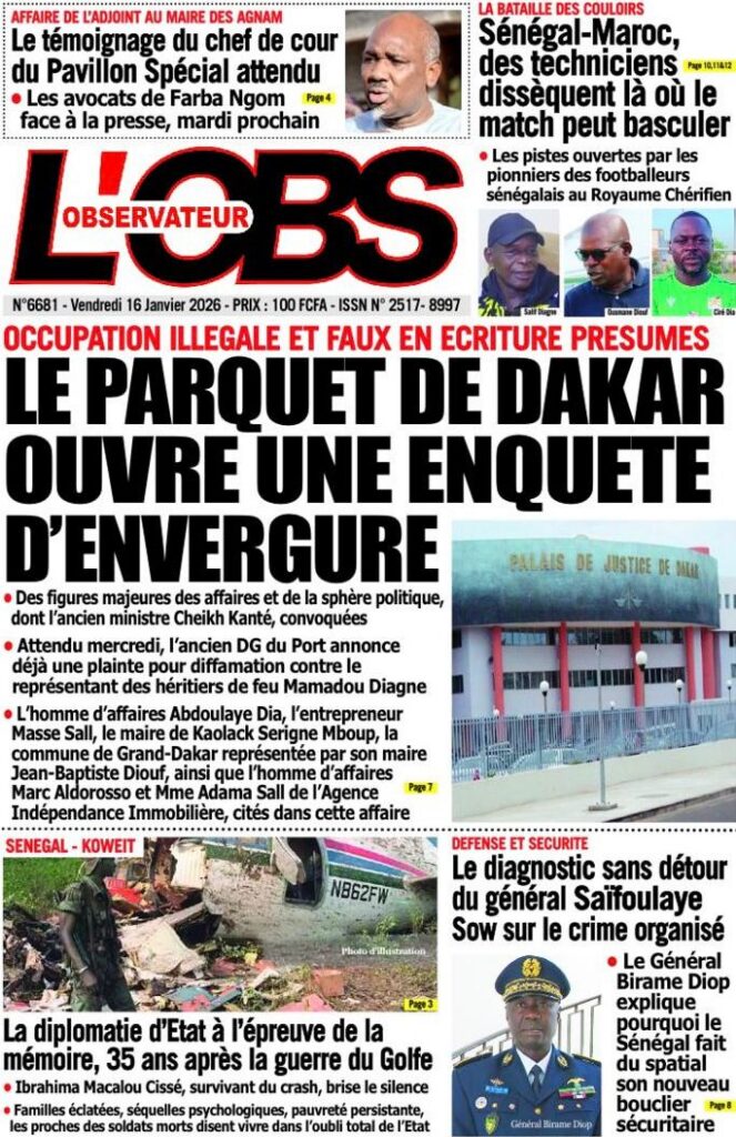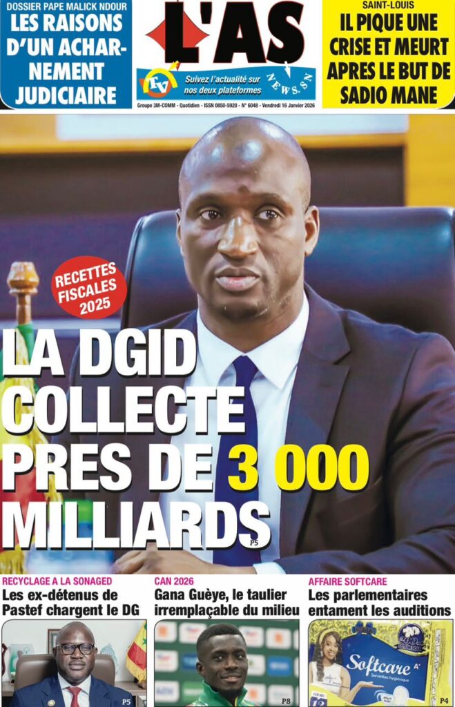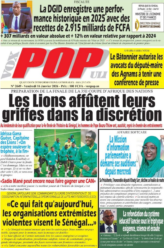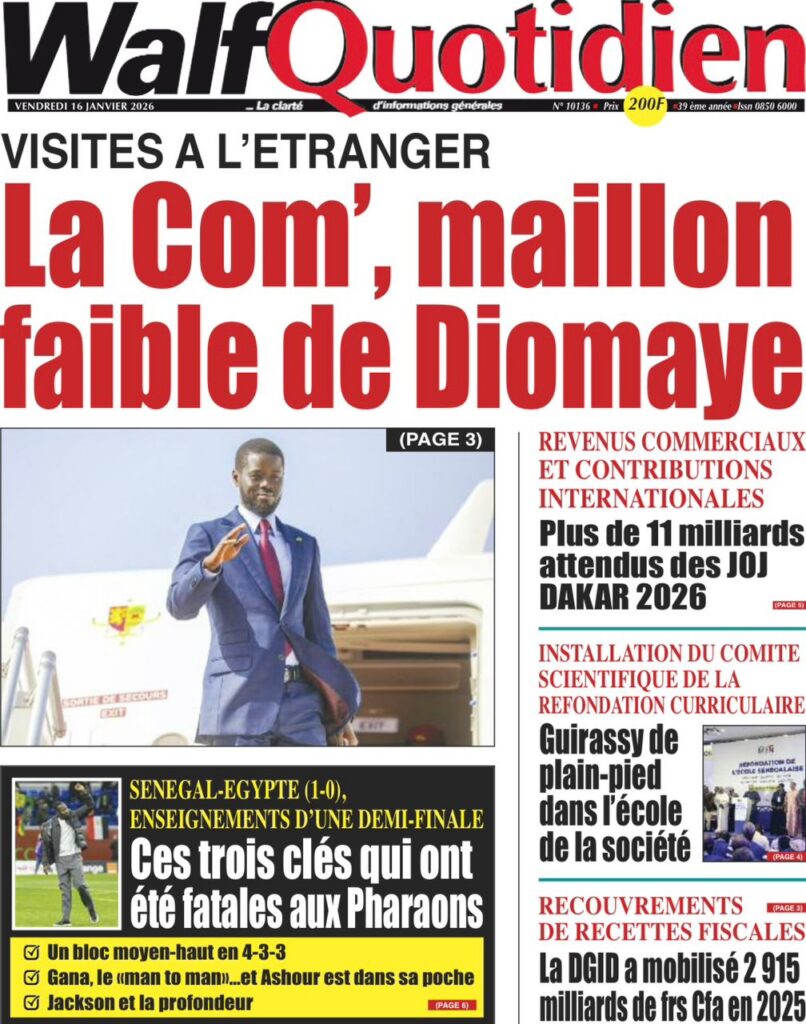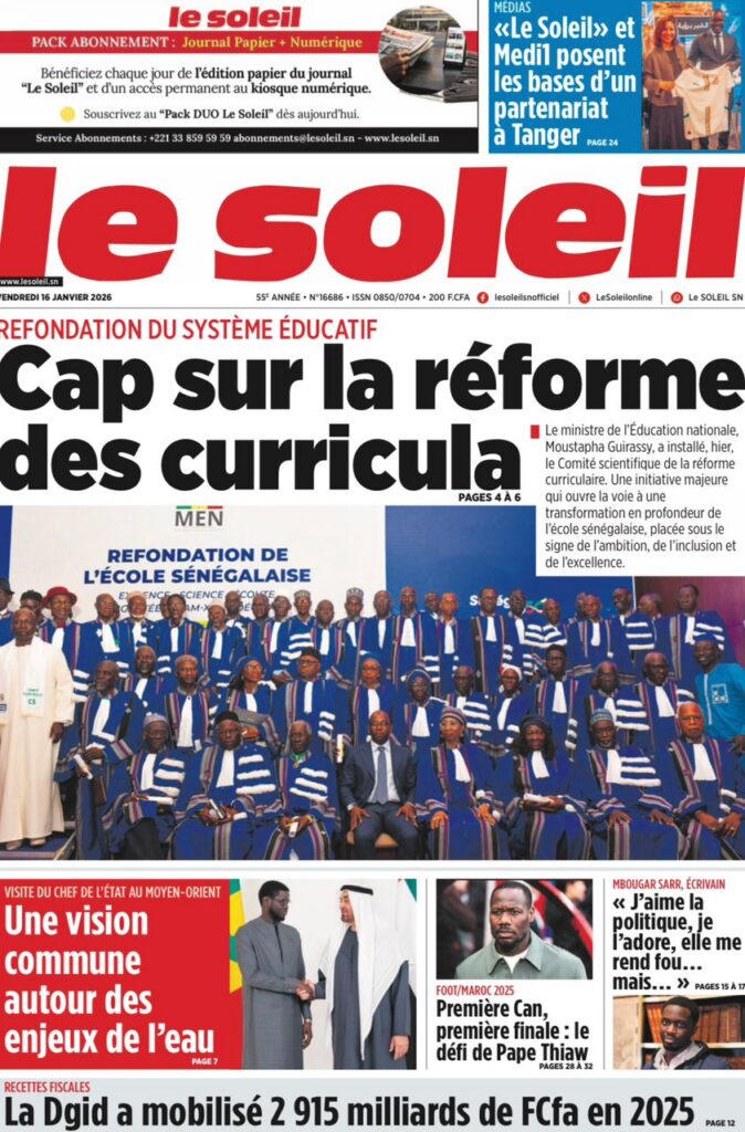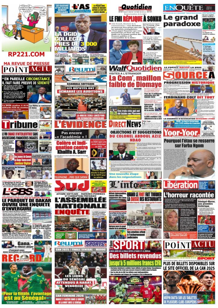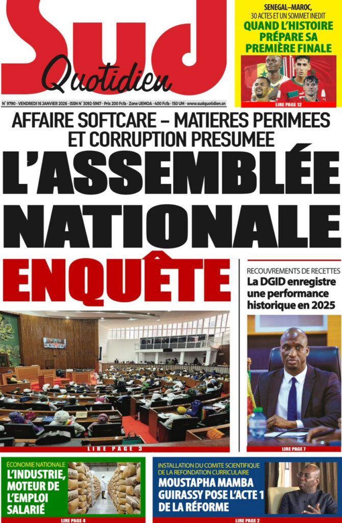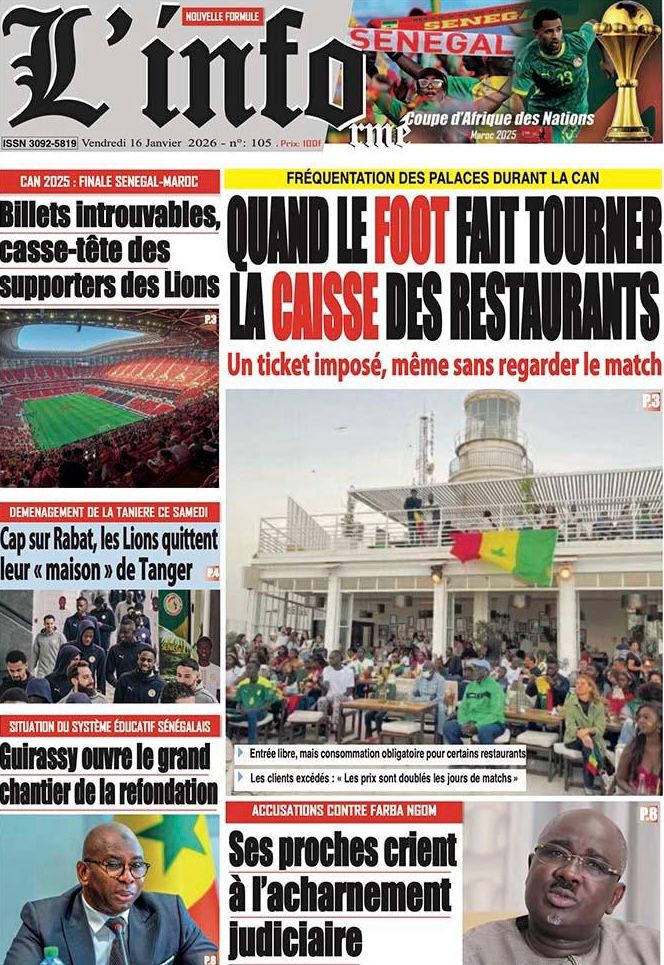 La presse sénégalaise de ce vendredi 16 janvier 2026 est dominée par quatre grands axes : la situation des finances publiques, les dossiers judiciaires et la reddition des comptes, les tensions politico-institutionnelles, et l’effervescence autour de la CAN 2025, avec la finale très attendue entre le Sénégal et le Maroc.