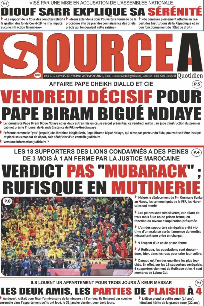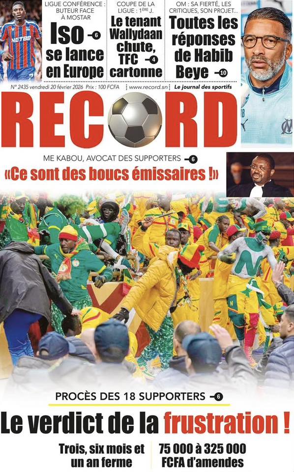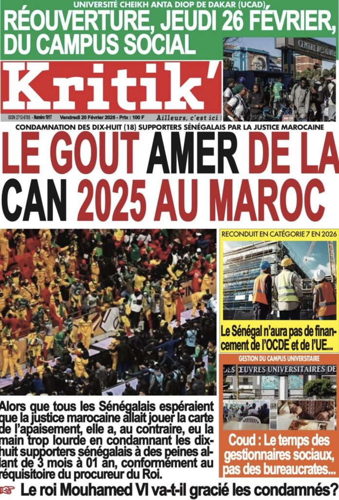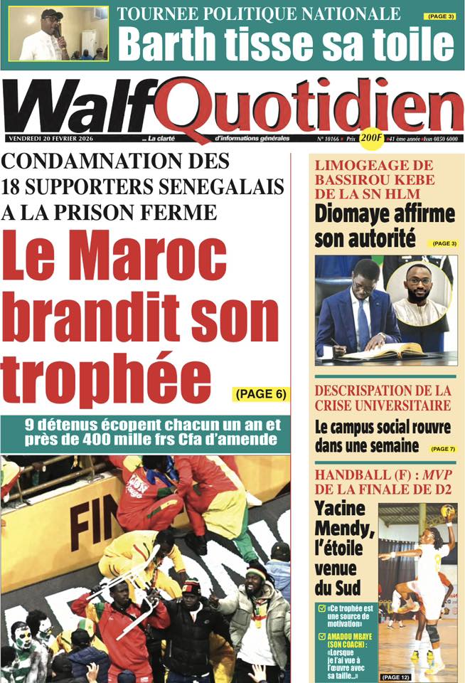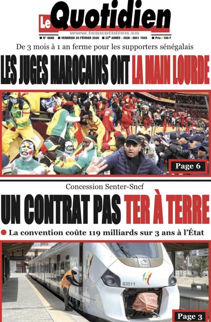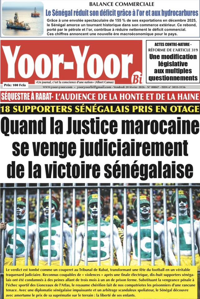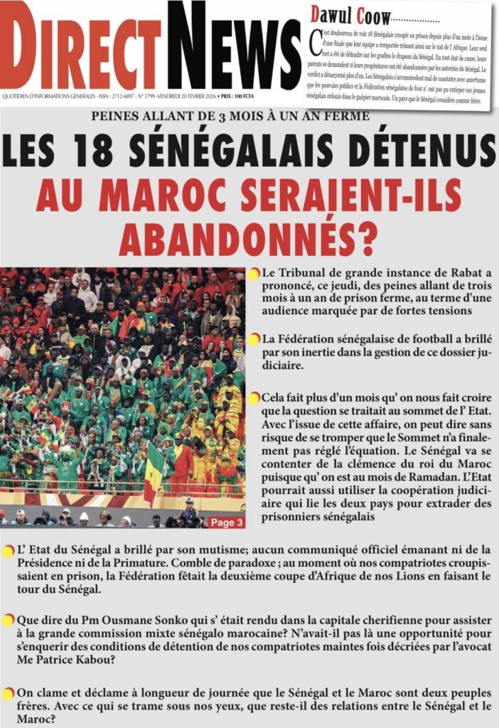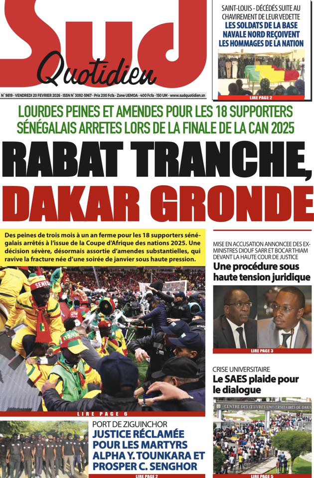 Les quotidiens sénégalais de ce vendredi 20 février 2026 sont dominés par le verdict tombé au Maroc concernant les 18 supporters sénégalais détenus depuis plusieurs semaines. Entre condamnations lourdes, solidarité nationale et autres sujets brûlants, la presse offre un panorama contrasté de l’actualité.