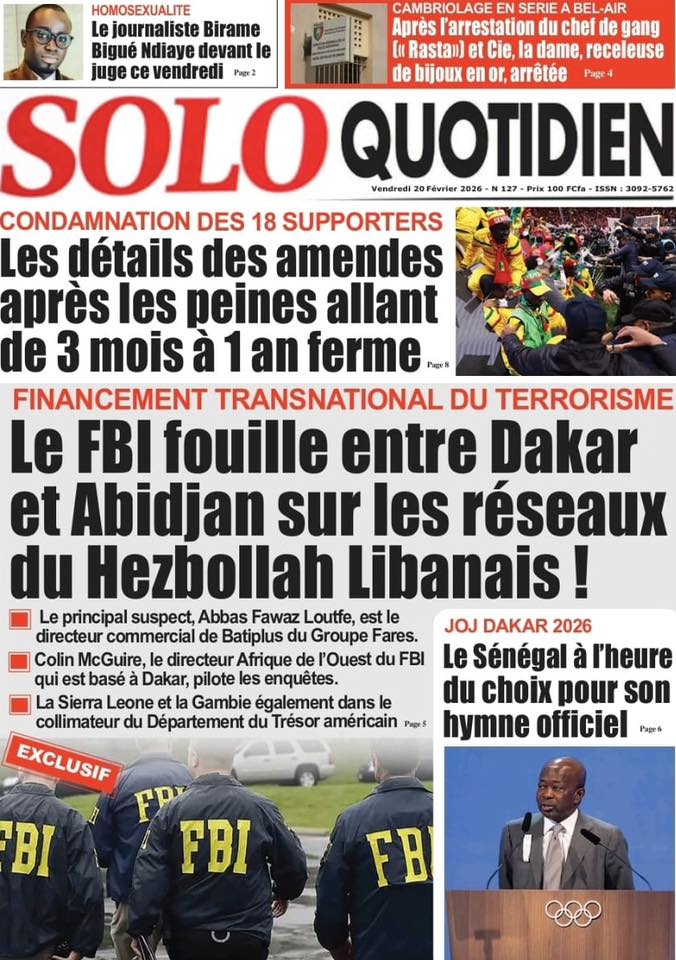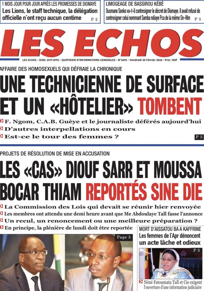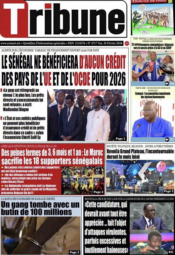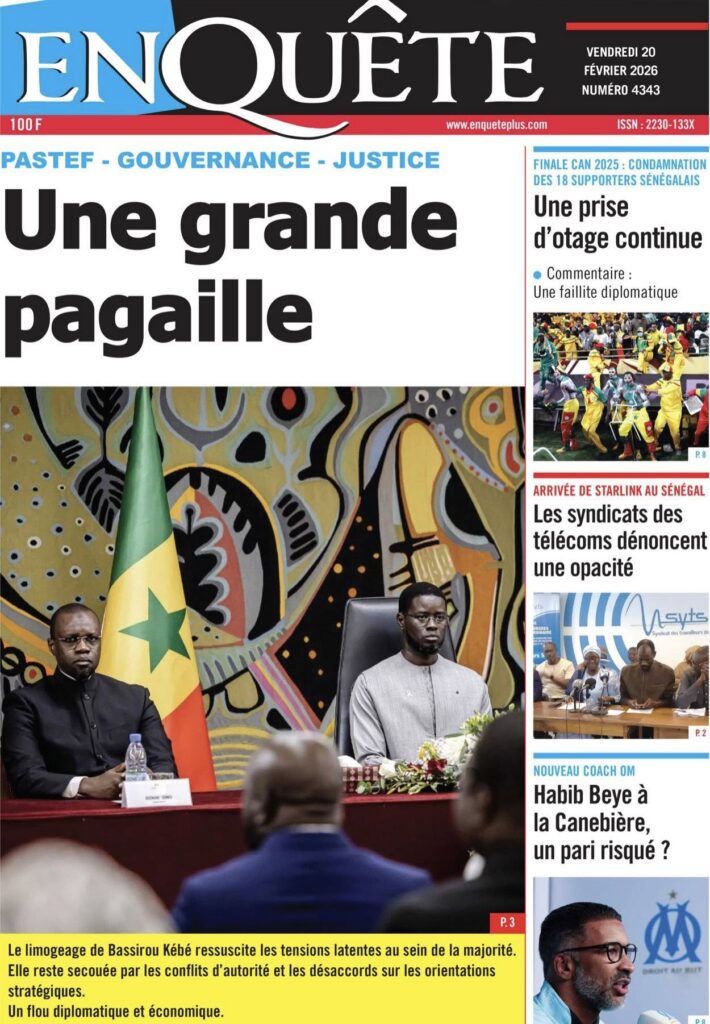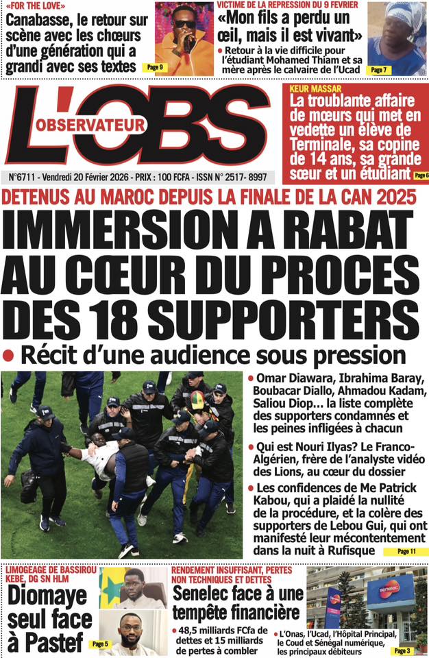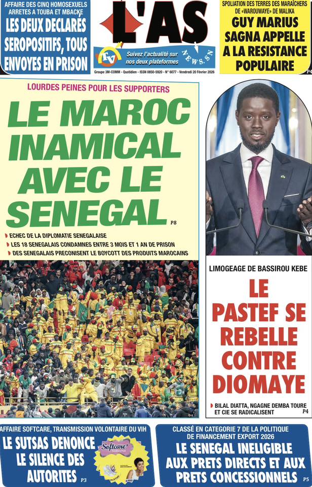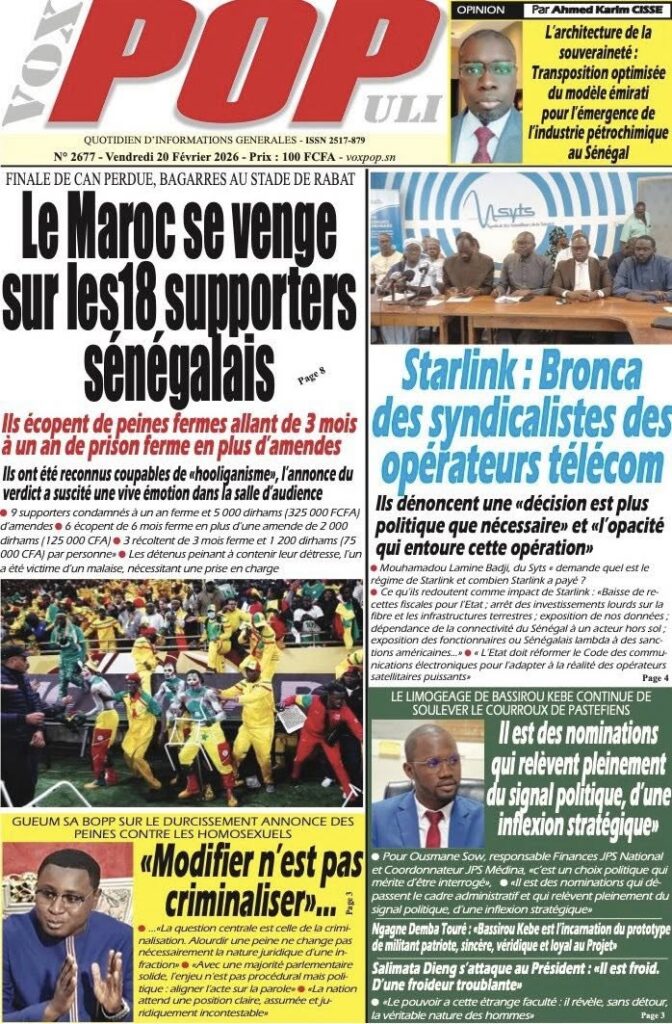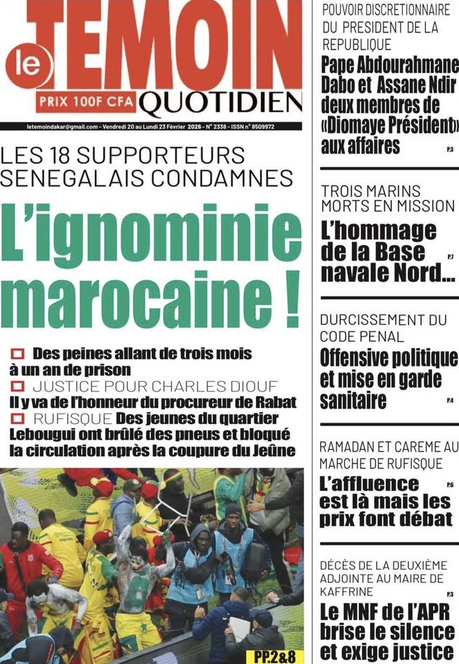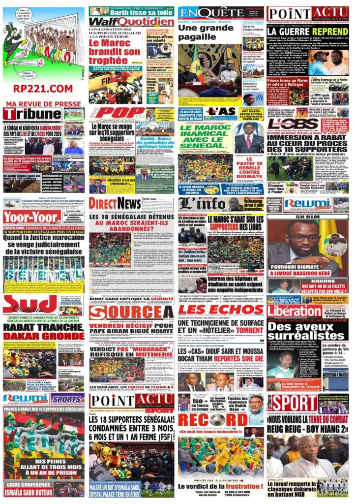 Les quotidiens sénégalais de ce vendredi 20 février 2026 sont dominés par le verdict tombé au Maroc concernant les 18 supporters sénégalais détenus depuis plusieurs semaines. Entre condamnations lourdes, solidarité nationale et autres sujets brûlants, la presse offre un panorama contrasté de l’actualité.