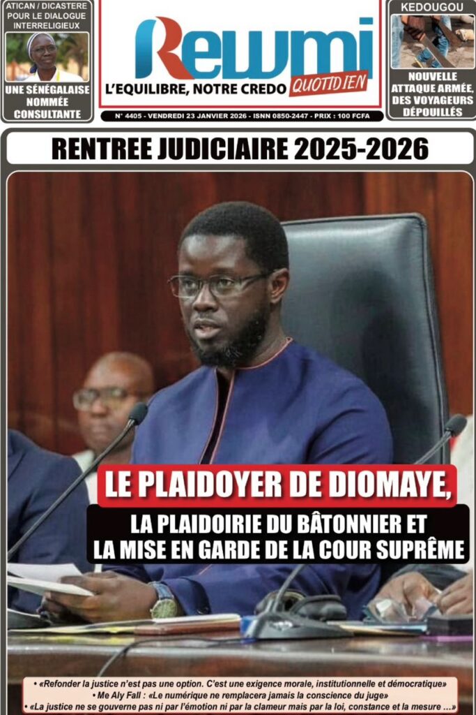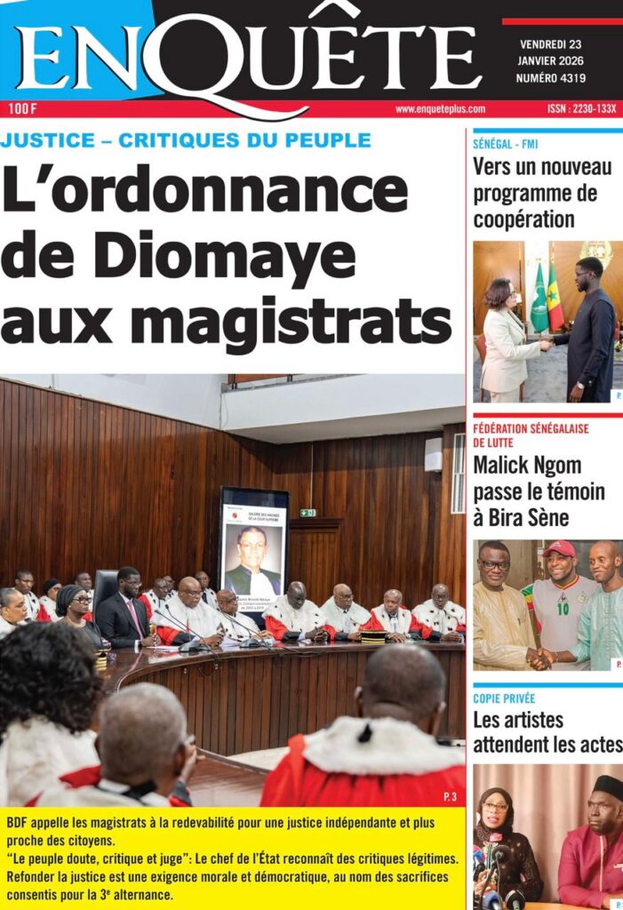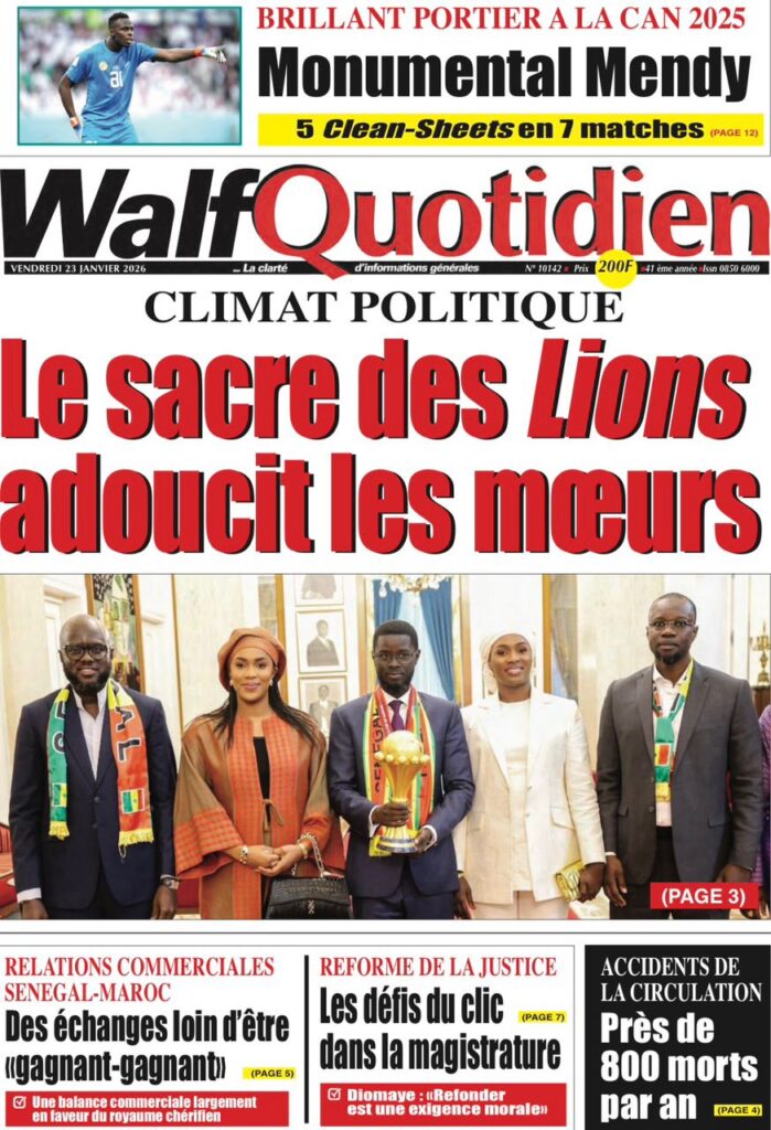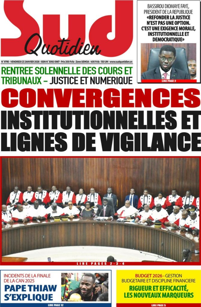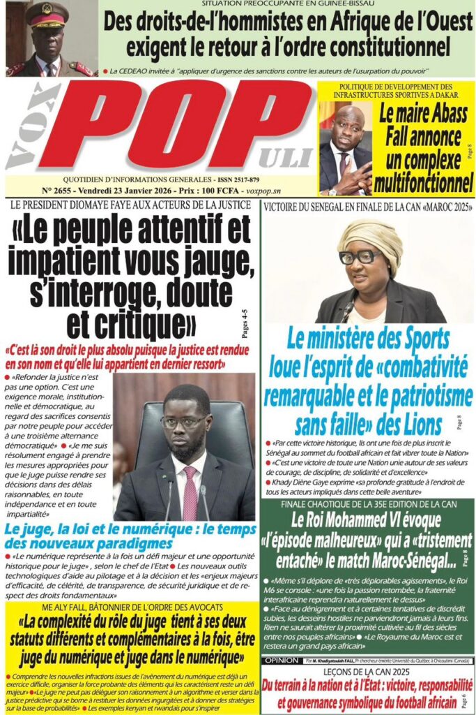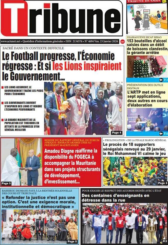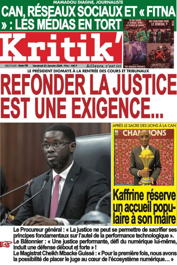 La presse sénégalaise de ce vendredi 23 janvier 2026 est largement dominée par trois grands axes : la justice et ses réformes, le rôle du président Bassirou Diomaye Faye, et le sacre historique des Lions à la CAN 2025. À cela s’ajoutent des dossiers sensibles sur l’économie, la gouvernance et des affaires judiciaires à fort impact social.