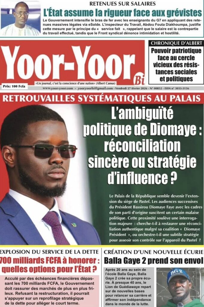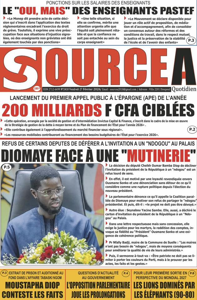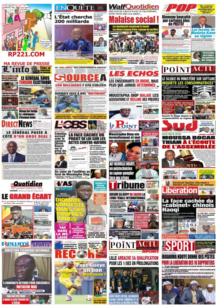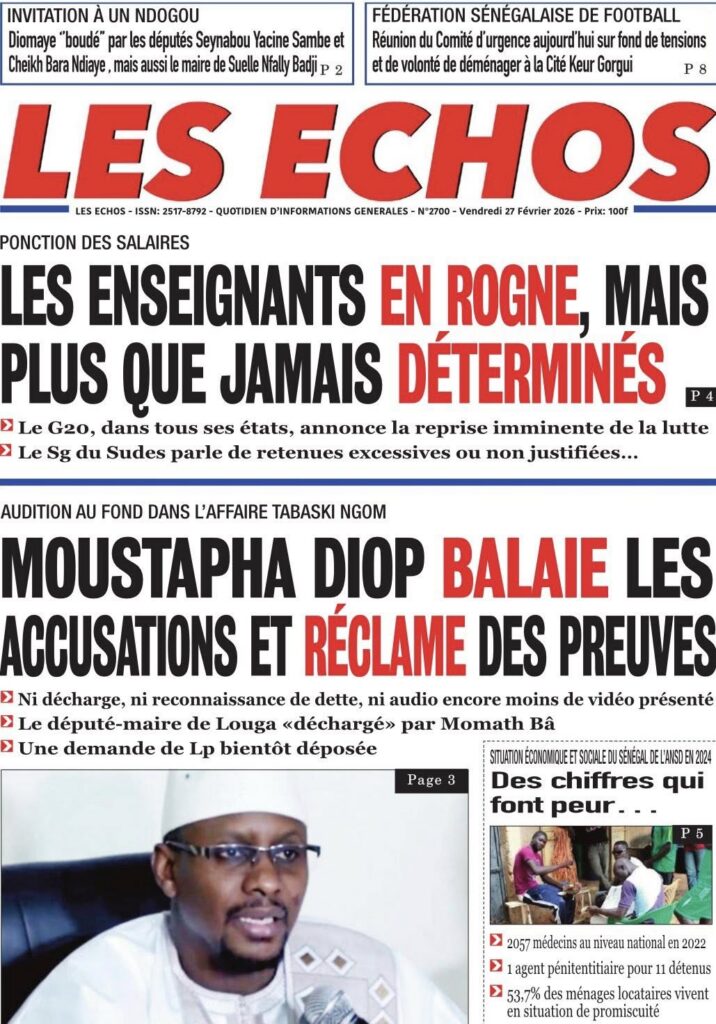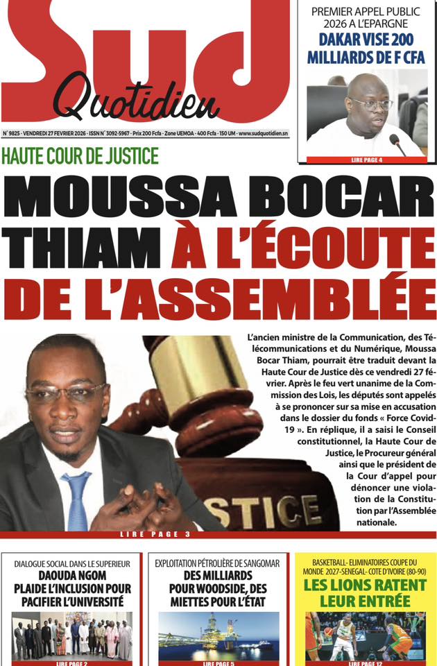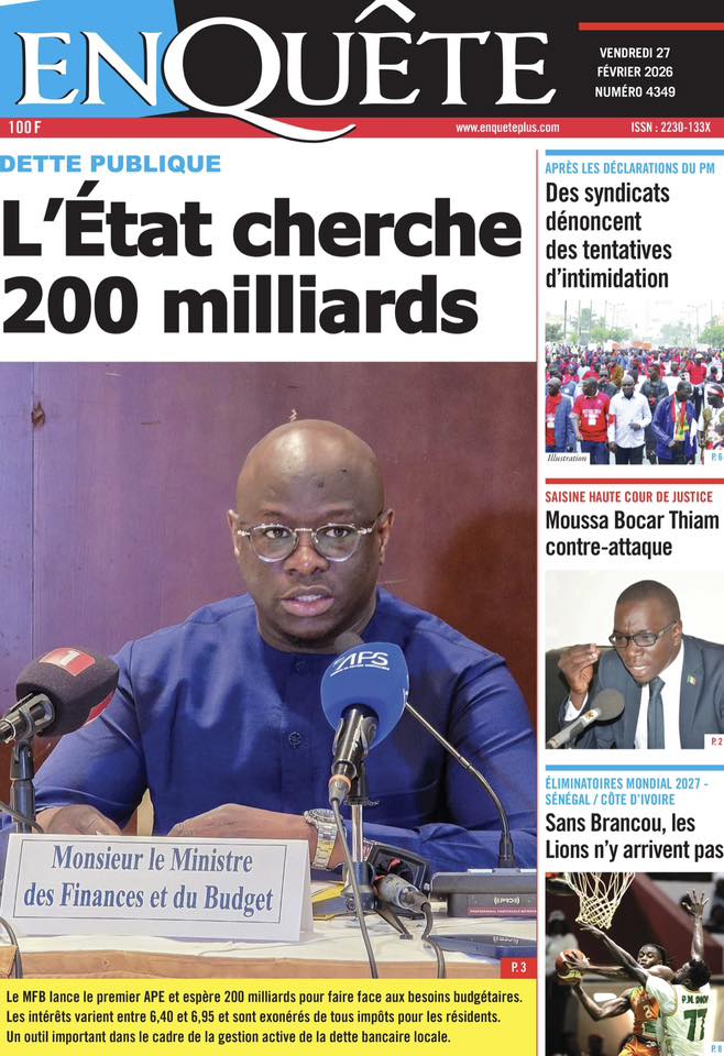 Les quotidiens sénégalais de ce vendredi 27 février 2026 sont dominés par les difficultés financières du gouvernement qui cherche 200 milliards de FCFA, et par l’audition de l’ancien ministre Moustapha Diop devant la Haute Cour de Justice. Entre crise sociale avec les enseignants, tensions avec la Côte d’Ivoire et malaise au sein du Pastef, la presse offre un panorama inquiétant de la situation nationale.