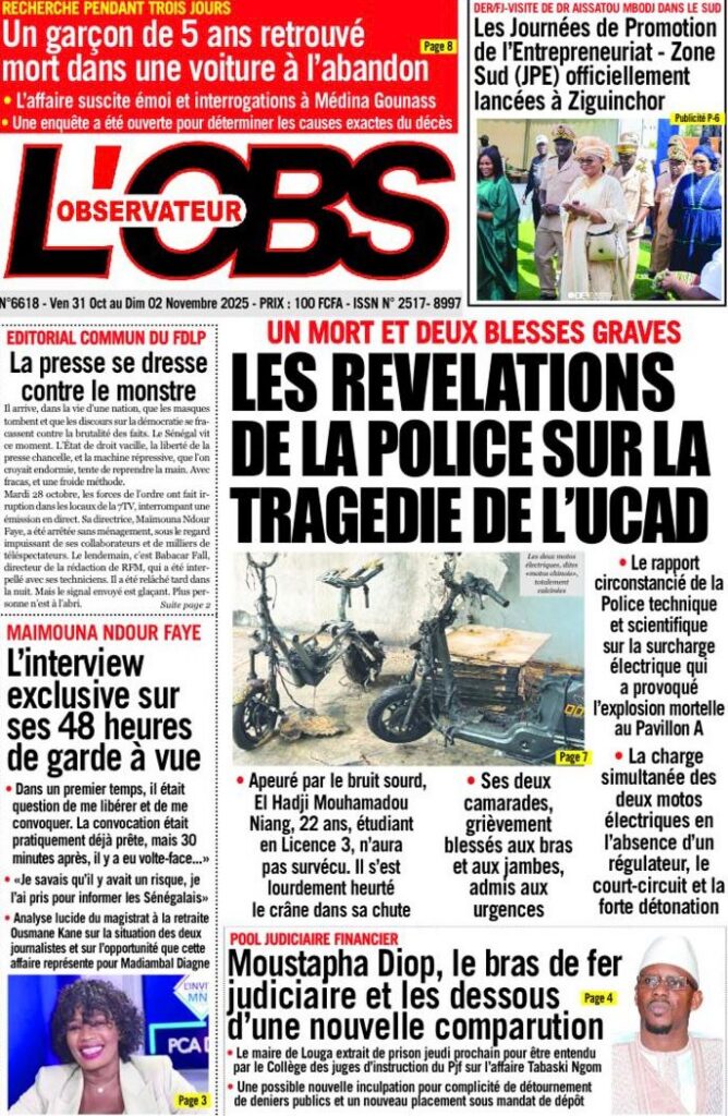 L’Observateur (L’Obs) titre : « Les révélations de la police sur la tragédie de l’UCAD », revenant sur les enquêtes en cours après les récents événements tragiques survenus à l’université.