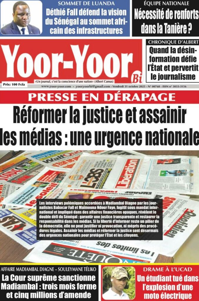 Yoor-Yoor titre : « Réformer la justice et assainir les médias : une urgence nationale », insistant sur la nécessité de redonner confiance aux citoyens dans les institutions.