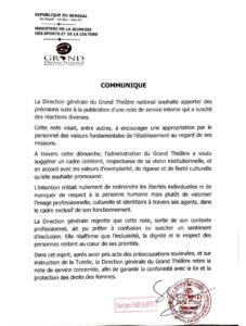 Face à la vive polémique suscitée ces derniers jours, la direction du Grand Théâtre national de Dakar a officiellement retiré la note de service interdisant à son personnel le port de perruques, de greffages ainsi que la pratique de la dépigmentation. Une décision annoncée ce mardi, à travers une nouvelle note interne.