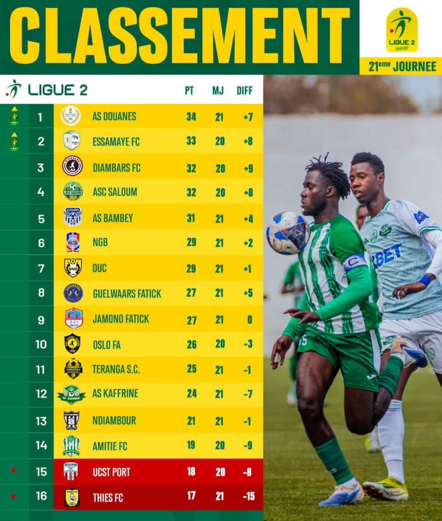 Au classement provisoire, l’AS Douanes occupe la tête (34 pts), suivie de Essamaye FC (33 pts) et Diambars FC (32 pts). ASC Saloum (4e) et l’AS Bambey (5e) complètent le haut du tableau.