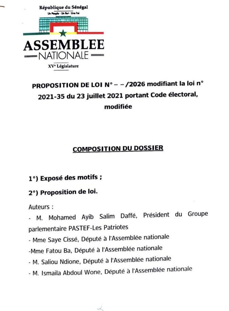 Une réforme du Code électoral est en gestation à l’Assemblée nationale du Sénégal. Les députés Mohamed Ayib Salim Daffé, Saye Cissé, Fatou Ba, Saliou Ndione et Ismaila Abdoul Wone ont déposé une proposition de loi visant à modifier la loi n°2021-35 du 23 juillet 2021 portant Code électoral.