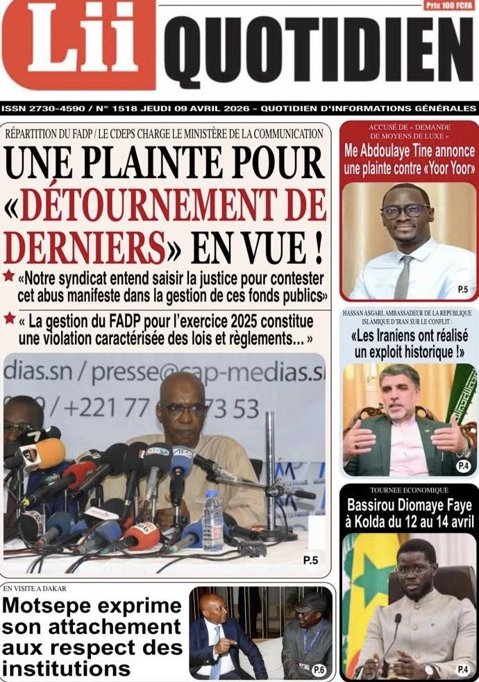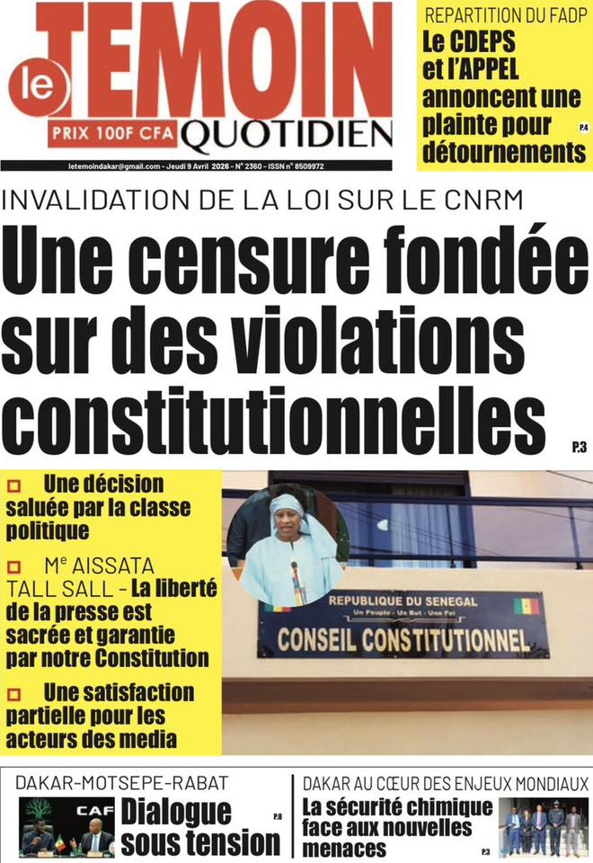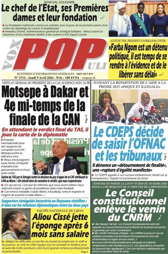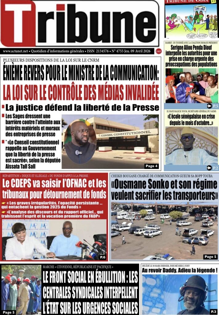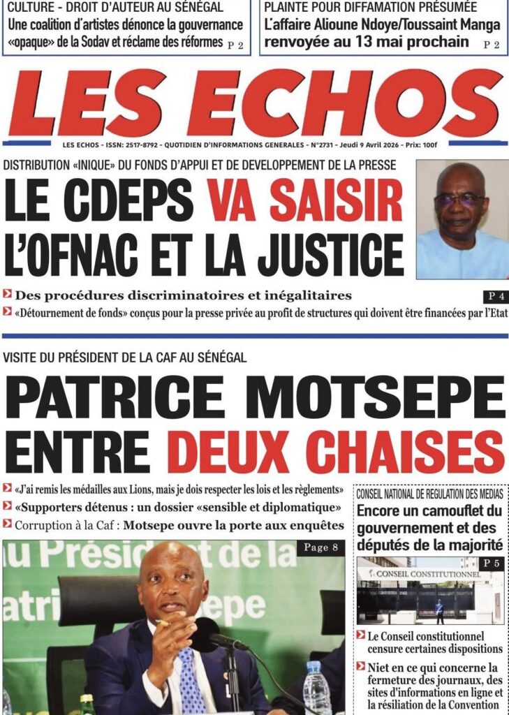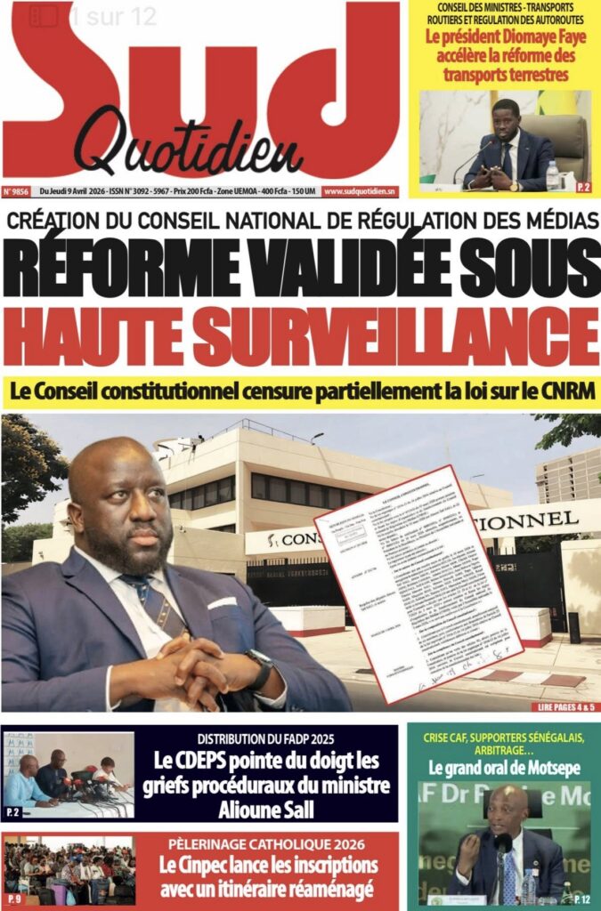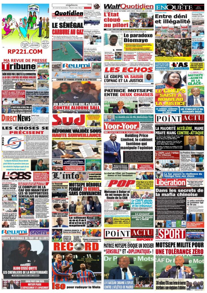 La presse sénégalaise de ce jeudi est dominée par trois sujets majeurs : la censure partielle par le Conseil constitutionnel de la loi portant création du Conseil national de régulation des médias, la visite à Dakar du président de la CAF Patrice Motsepe dans un contexte de crise post-CAN 2025, et la décision du patronat de la presse de saisir l’OFNAC et les tribunaux pour dénoncer la répartition jugée illégale du Fonds d’appui et de développement de la presse. En toile de fond : la grève des transporteurs qui s’éternise, la marche des syndicats de travailleurs et le feuilleton de l’éligibilité de Sonko.