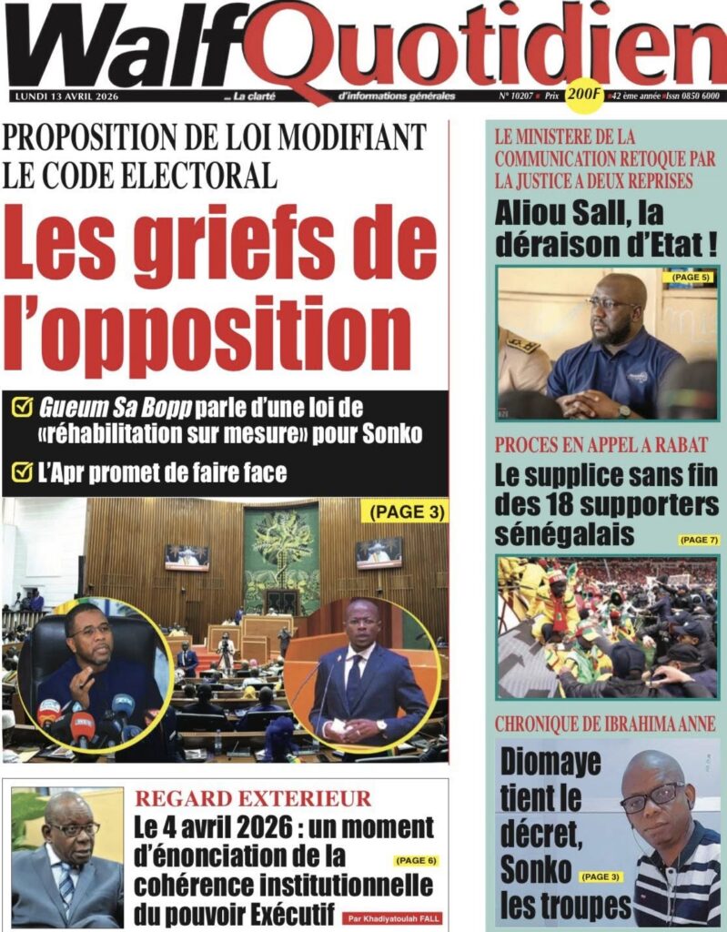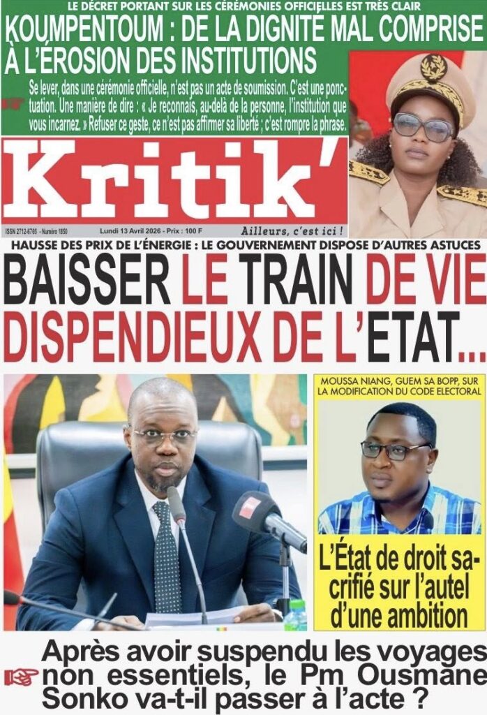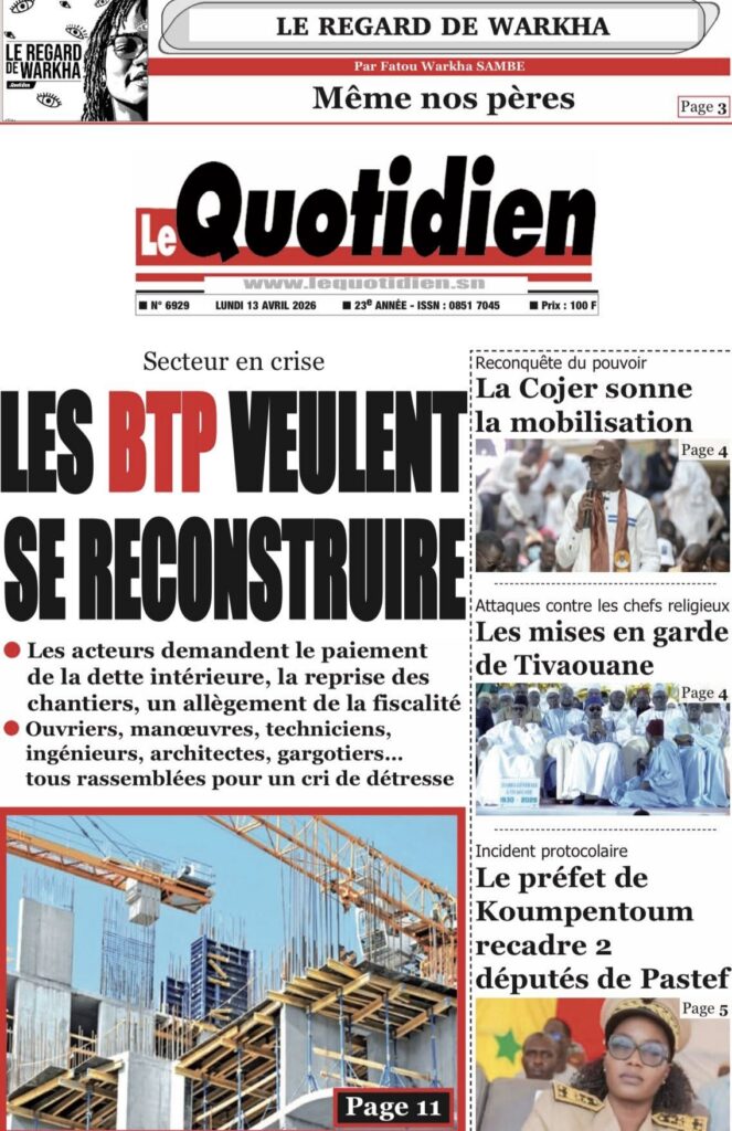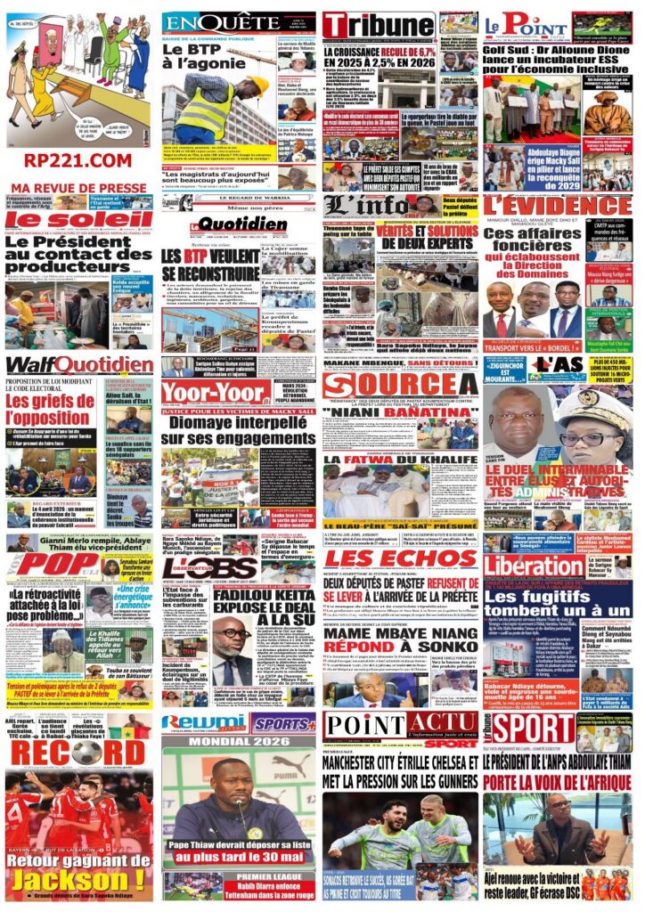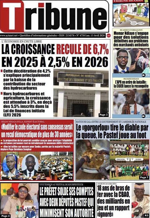 La presse sénégalaise de ce lundi s’ouvre sur un tableau économique sombre : la croissance du PIB s’effondre de 6,7% en 2025 à 2,5% en 2026, une crise énergétique se profile avec une hausse imminente des prix des carburants, et le secteur du BTP crie à l’agonie avec 30 000 à 100 000 emplois menacés. Sur le plan politique, la proposition de loi Pastef sur le Code électoral cristallise les tensions entre majorité et opposition, tandis qu’un incident protocolaire à Koumpentoum entre deux députés Pastef et la préfète alimente le débat sur les rapports entre élus et administration. En toile de fond, la Ziarra générale de Tivaouane et le geste humanitaire de Mouhamed Dieng pour des jumelles siamoises.