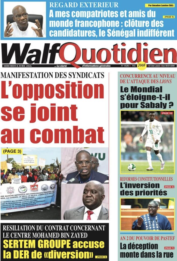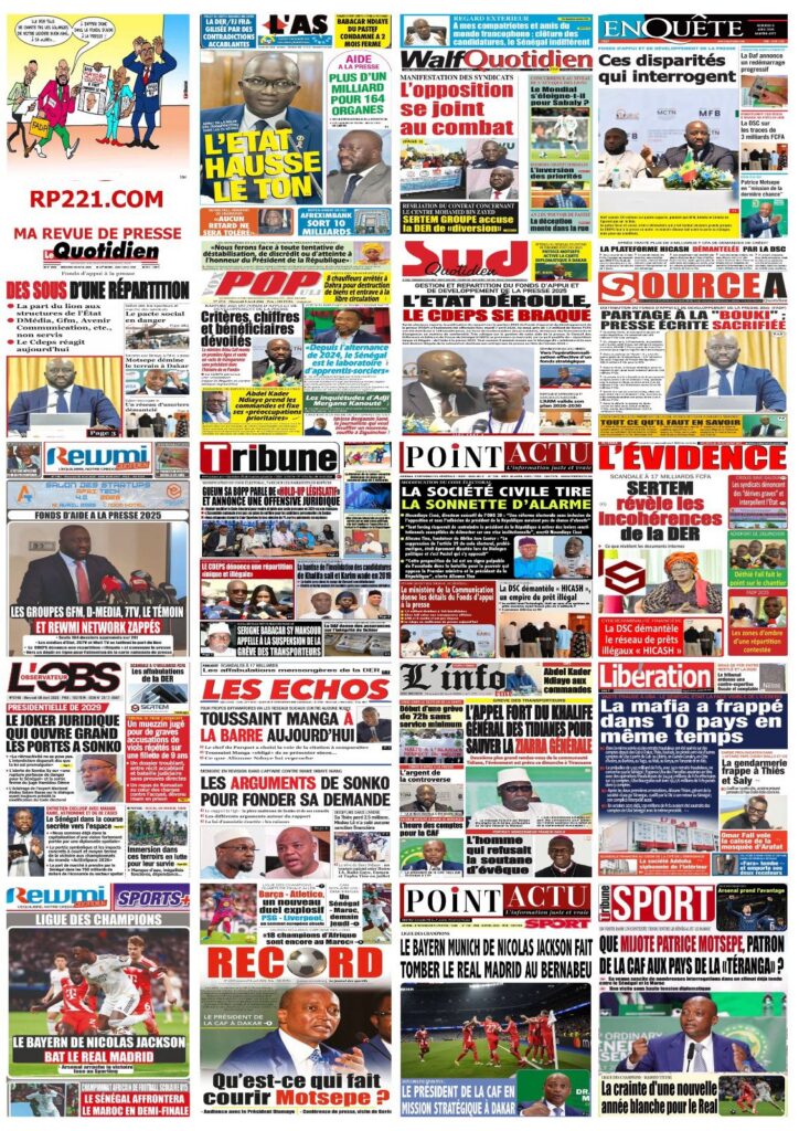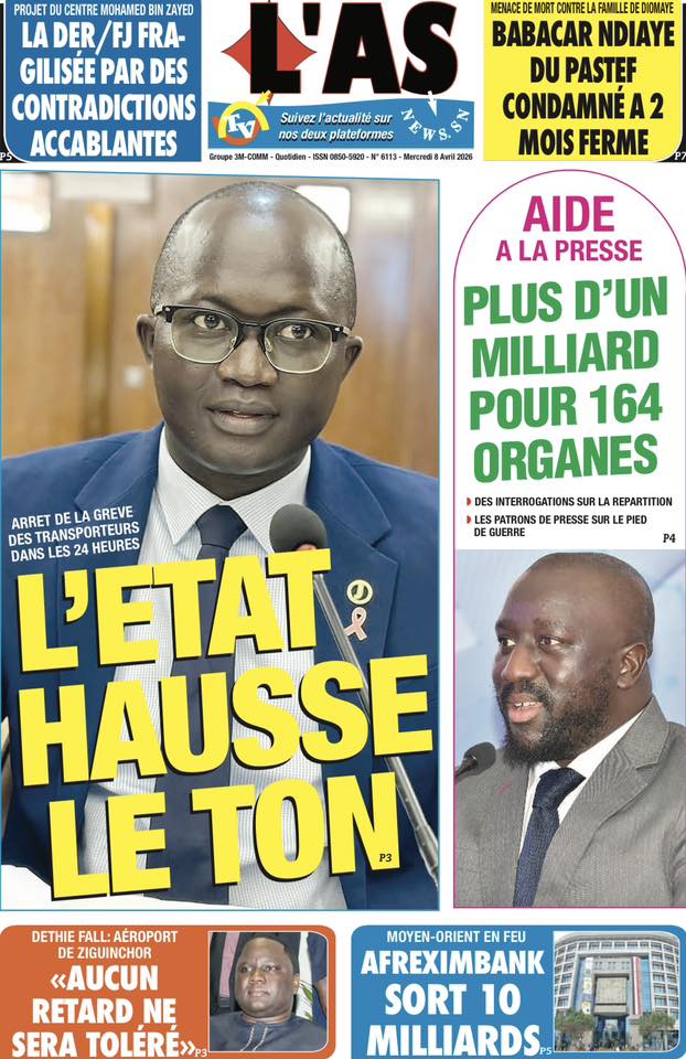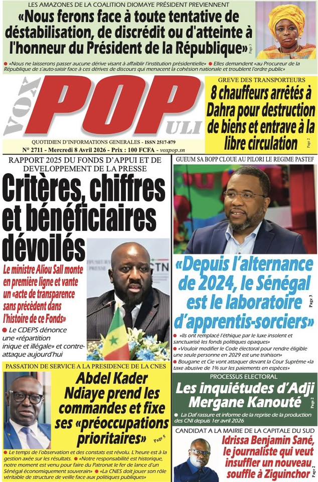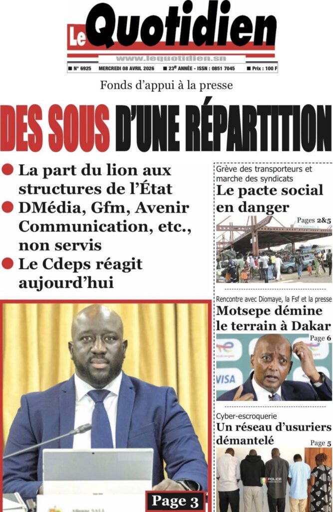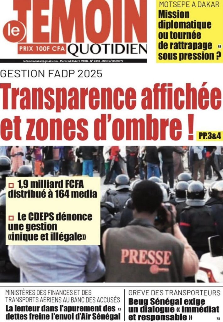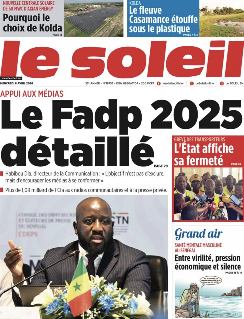 Les quotidiens sénégalais de ce mercredi 8 avril 2026 sont largement dominés par la publication du rapport sur le Fonds d’appui et de développement de la presse (FADP) 2025. Entre révélations sur la répartition controversée, scandales financiers multiples (DER, UBA, HICASH), tensions politiques et crises judiciaires, la presse offre un tableau dense d’un pays en ébullition quatre jours après les célébrations de l’indépendance.