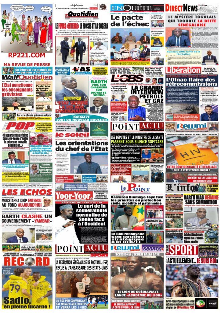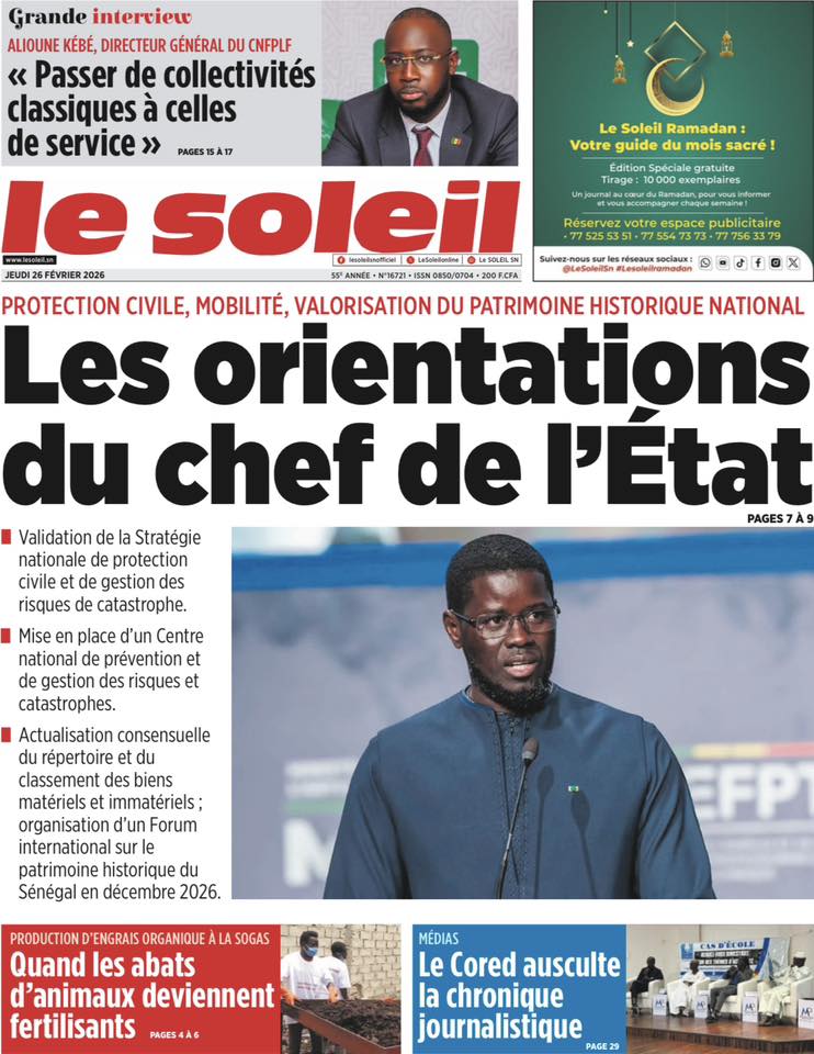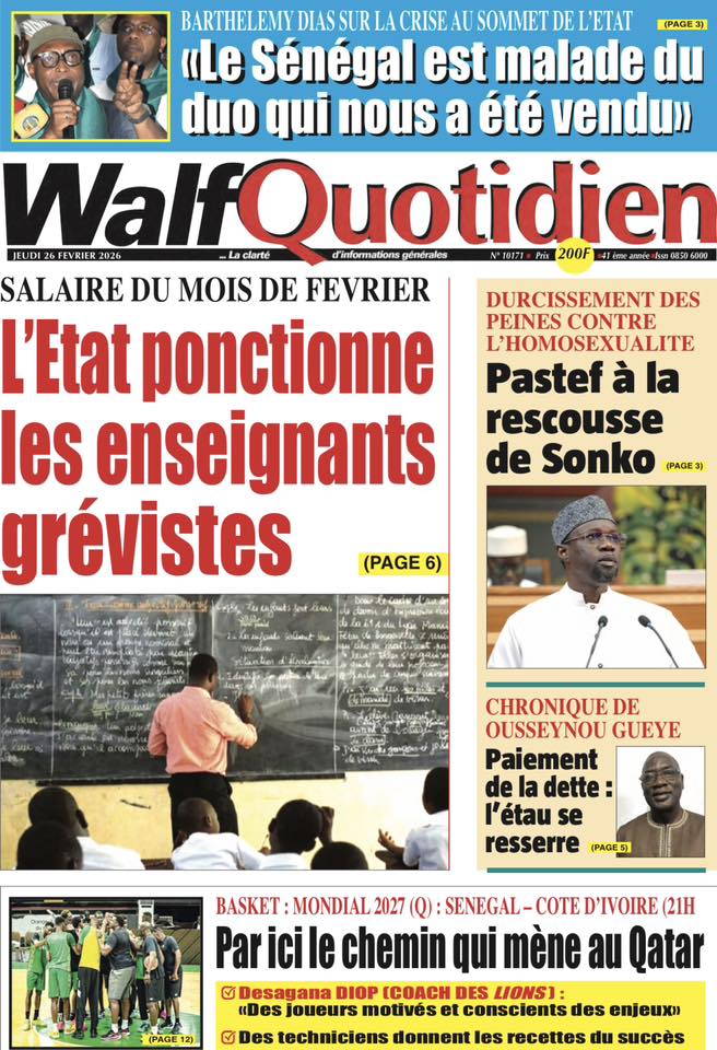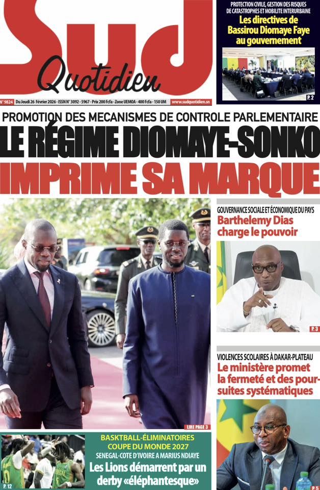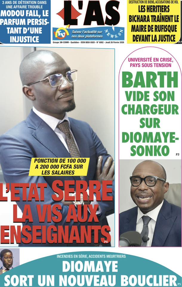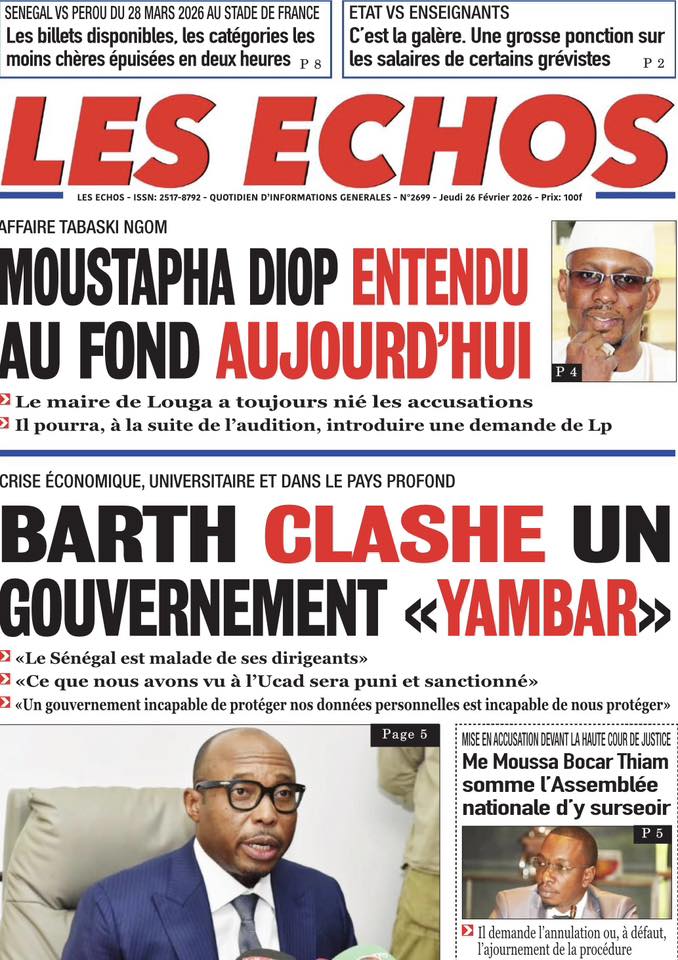 Les quotidiens sénégalais de ce jeudi 26 février 2026 sont dominés par les orientations du Chef de l’État Bassirou Diomaye Faye et les tensions internes au sein du pouvoir, avec Barthélémy Dias qui clashe ouvertement le gouvernement « Yambar ». Entre priorités présidentielles, grèves enseignantes, découverte d’hydrocarbures et polémiques diverses, la presse offre un panorama contrasté de l’actualité nationale.