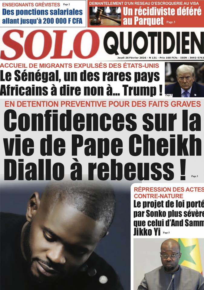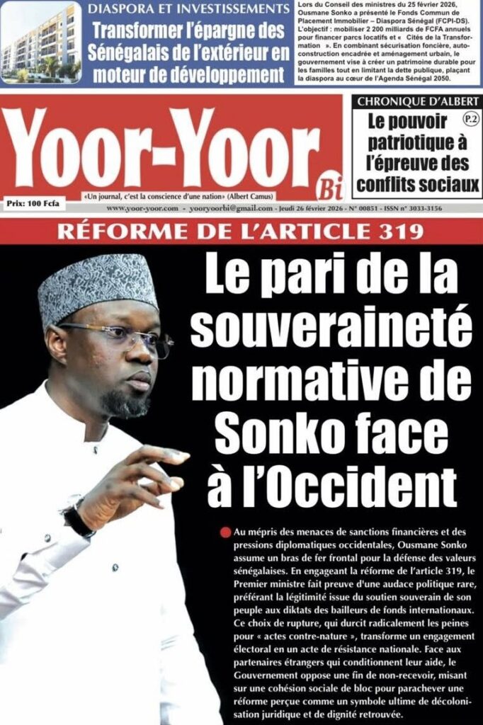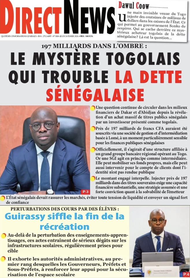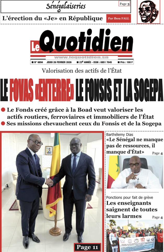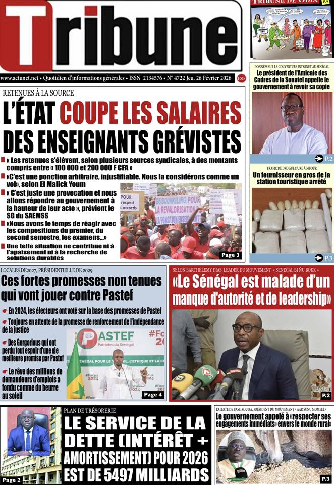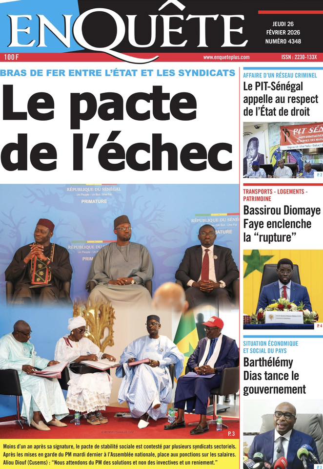 Les quotidiens sénégalais de ce jeudi 26 février 2026 sont dominés par les orientations du Chef de l’État Bassirou Diomaye Faye et les tensions internes au sein du pouvoir, avec Barthélémy Dias qui clashe ouvertement le gouvernement « Yambar ». Entre priorités présidentielles, grèves enseignantes, découverte d’hydrocarbures et polémiques diverses, la presse offre un panorama contrasté de l’actualité nationale.