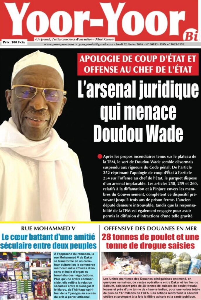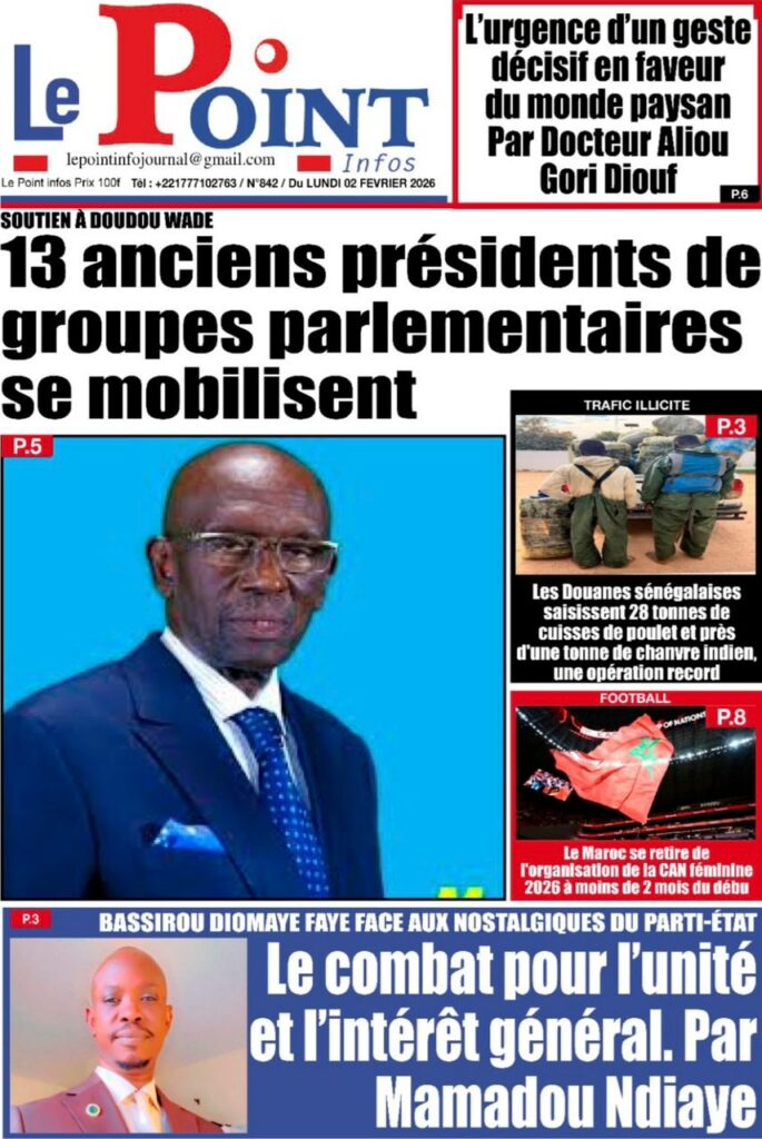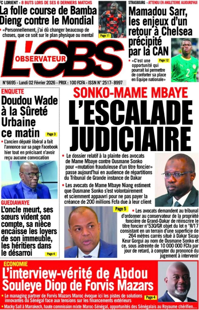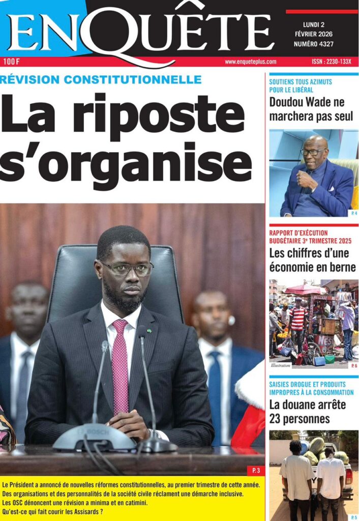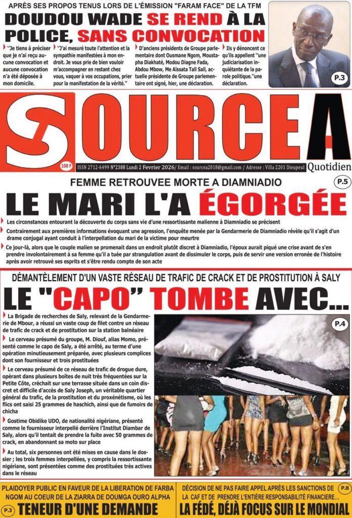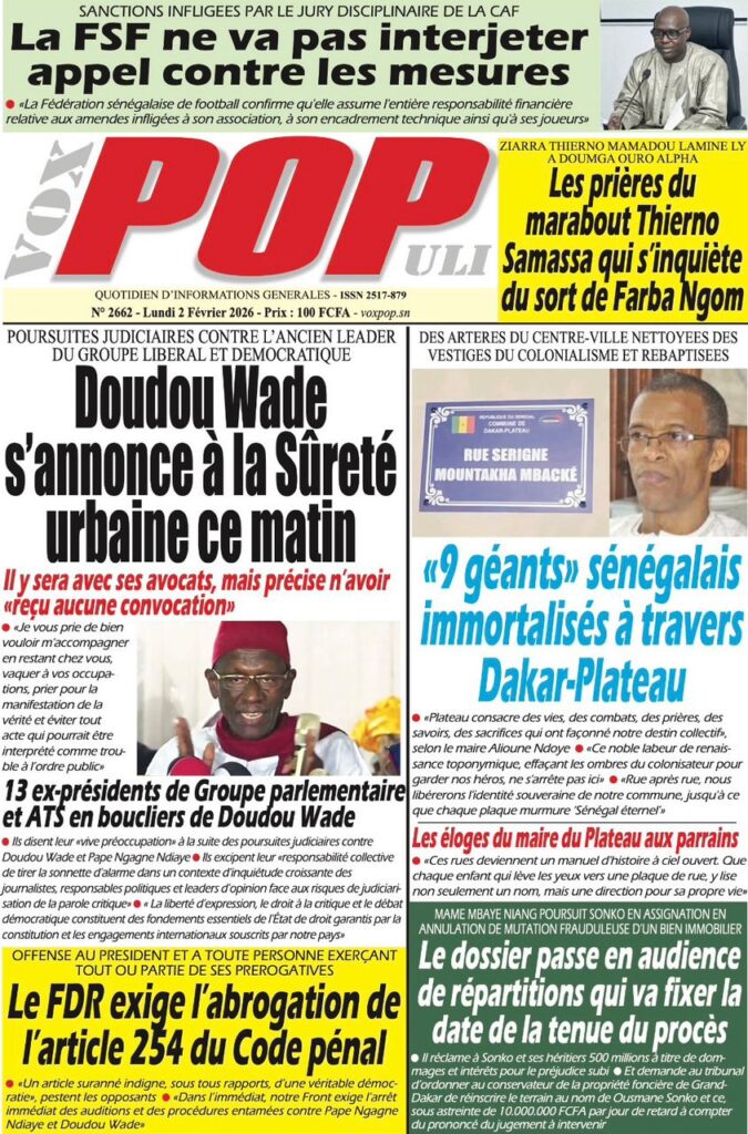 L’actualité nationale de ce lundi 02 février 2026 est dominée par une forte tension politico-judiciaire, marquée par le face-à-face annoncé entre Doudou Wade et la Sûreté urbaine, les débats autour de la révision constitutionnelle, ainsi que des faits divers dramatiques qui continuent de secouer l’opinion publique. Tour d’horizon des principaux titres parus ce matin dans la presse sénégalaise.