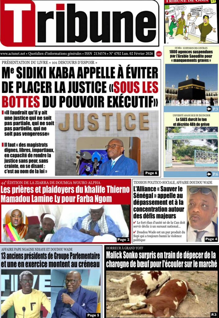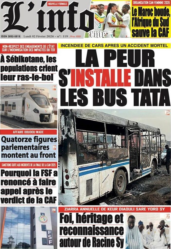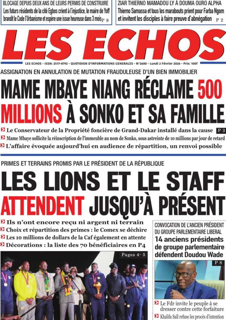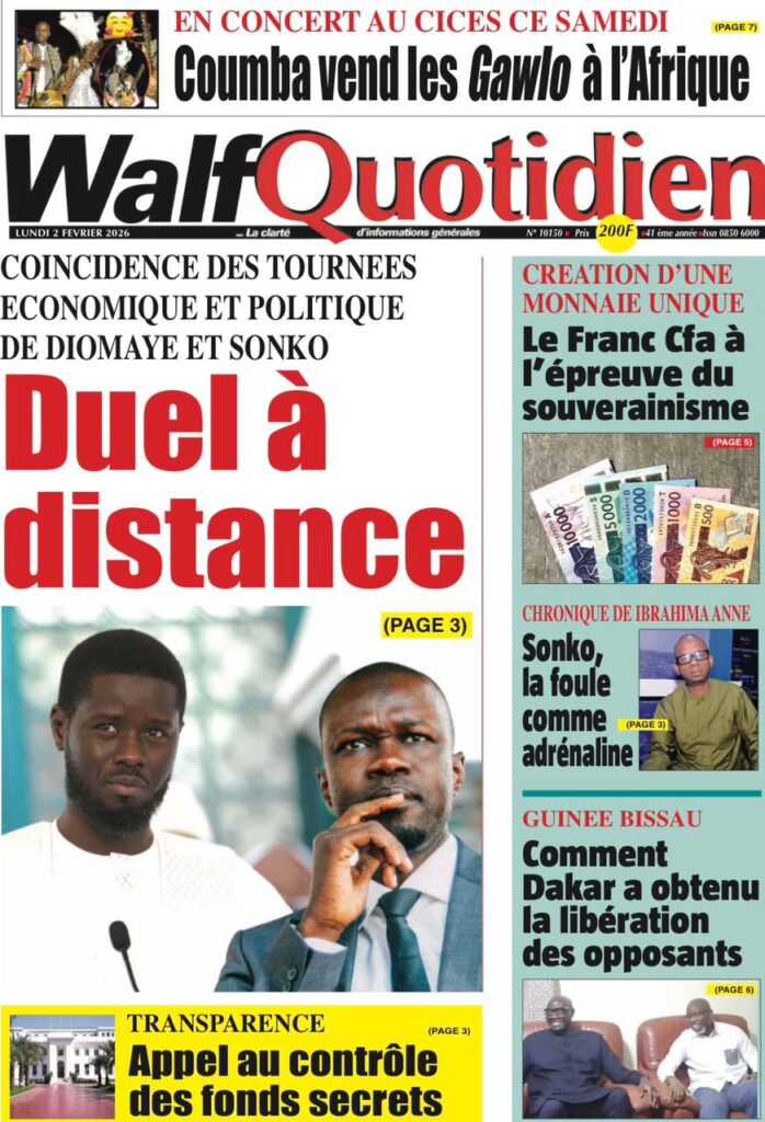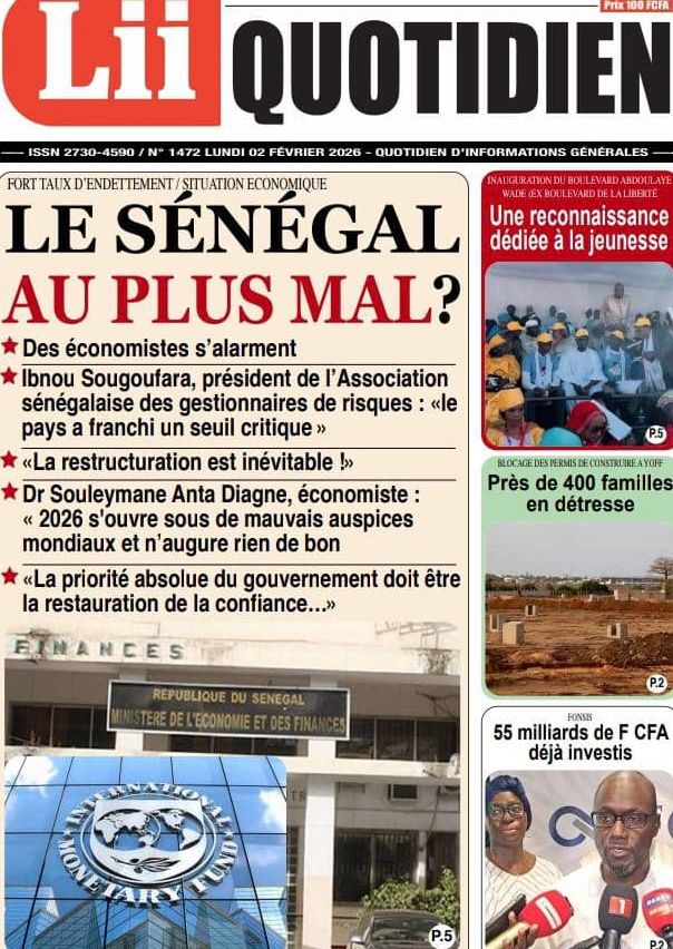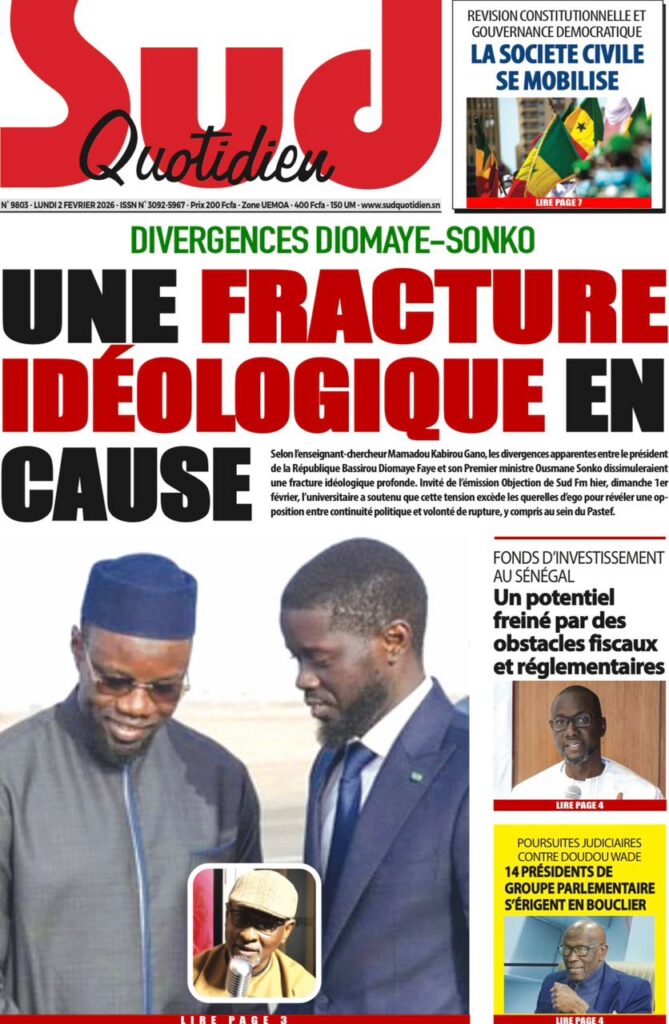 L’actualité nationale de ce lundi 02 février 2026 est dominée par une forte tension politico-judiciaire, marquée par le face-à-face annoncé entre Doudou Wade et la Sûreté urbaine, les débats autour de la révision constitutionnelle, ainsi que des faits divers dramatiques qui continuent de secouer l’opinion publique. Tour d’horizon des principaux titres parus ce matin dans la presse sénégalaise.