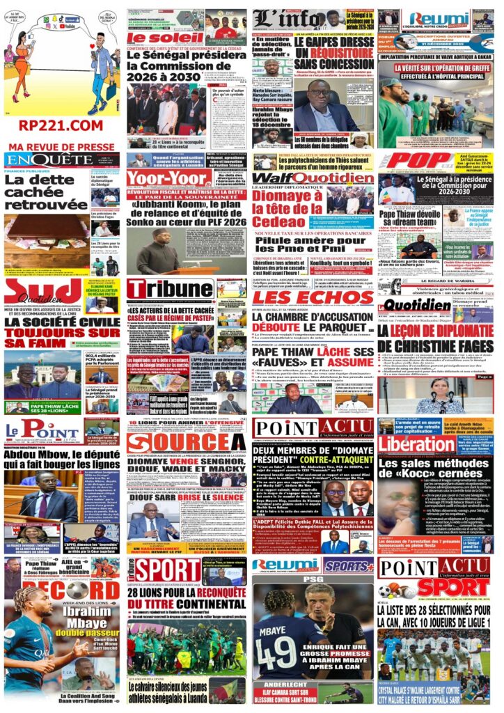 L’actualité sénégalaise de ce lundi 15 décembre 2025 est dominée par les questions de leadership diplomatique, de gestion des finances publiques, de tensions politiques et judiciaires, sans oublier les enjeux sportifs à l’approche des grandes échéances continentales