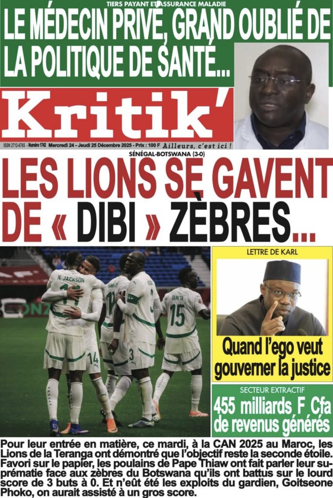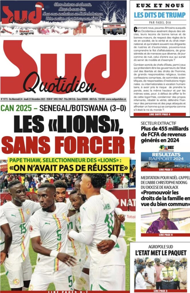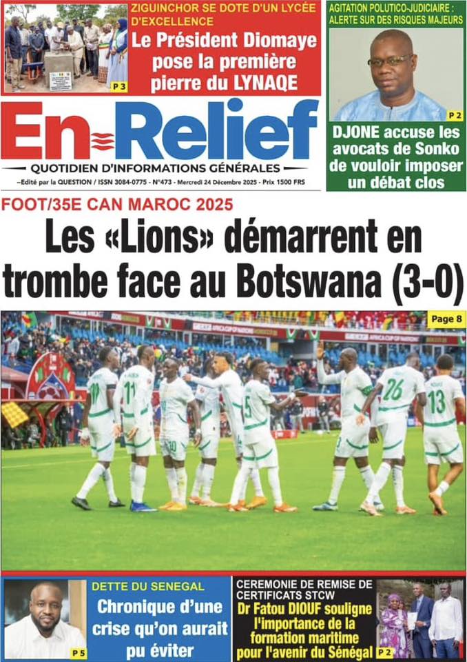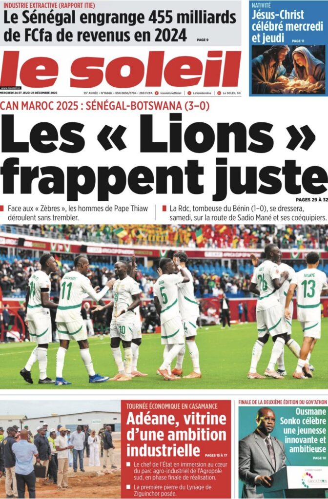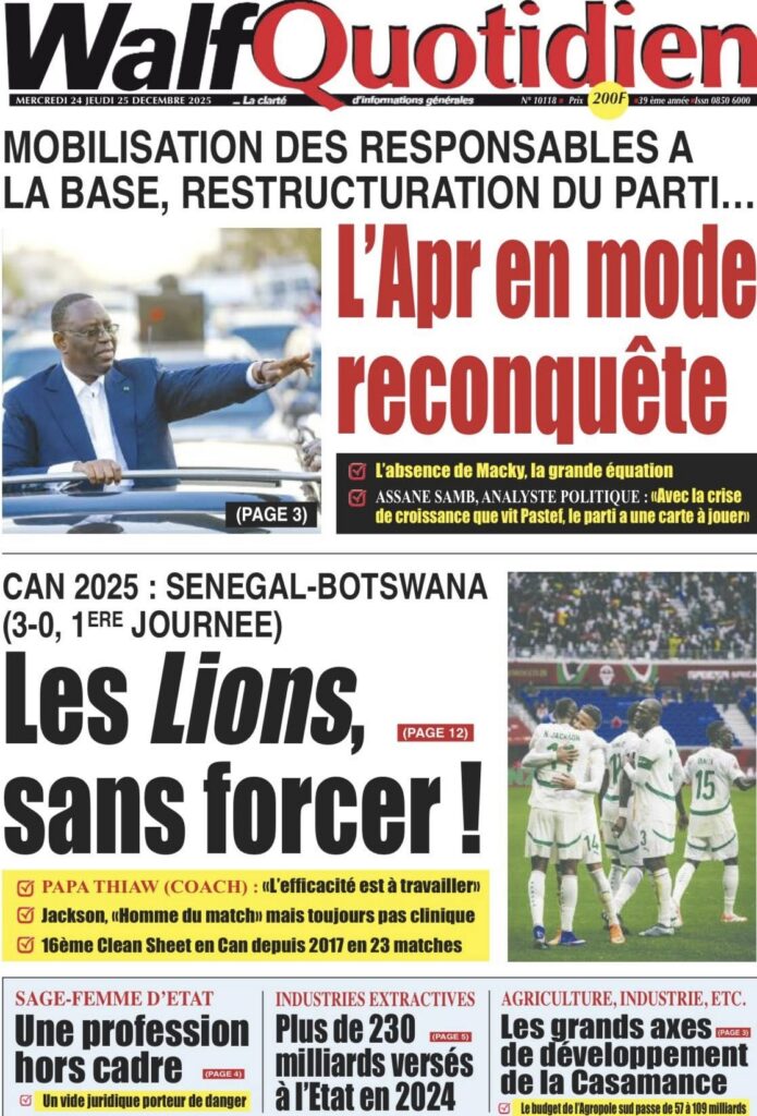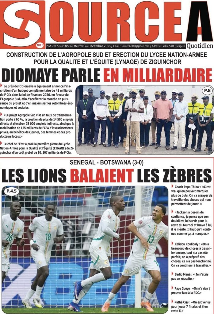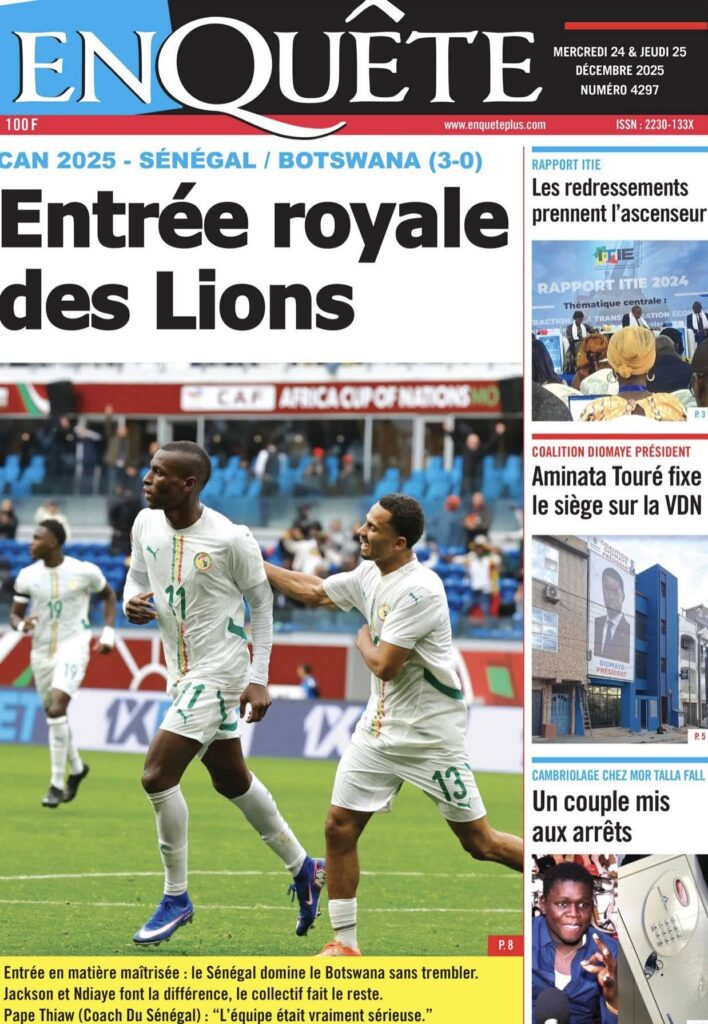 La presse sénégalaise de ce mercredi 24 décembre 2025 est largement dominée par la brillante entrée en lice des Lions de la Teranga à la CAN 2025, mais aussi par une actualité politique et économique dense, marquée par des débats sur la gouvernance, la justice et les finances publiques.