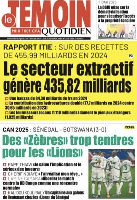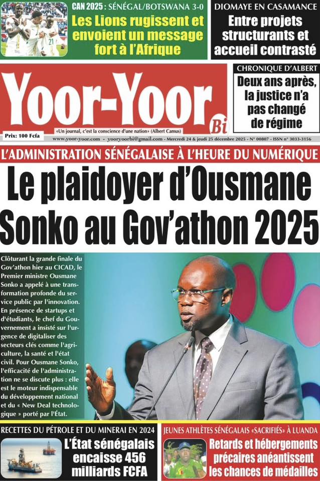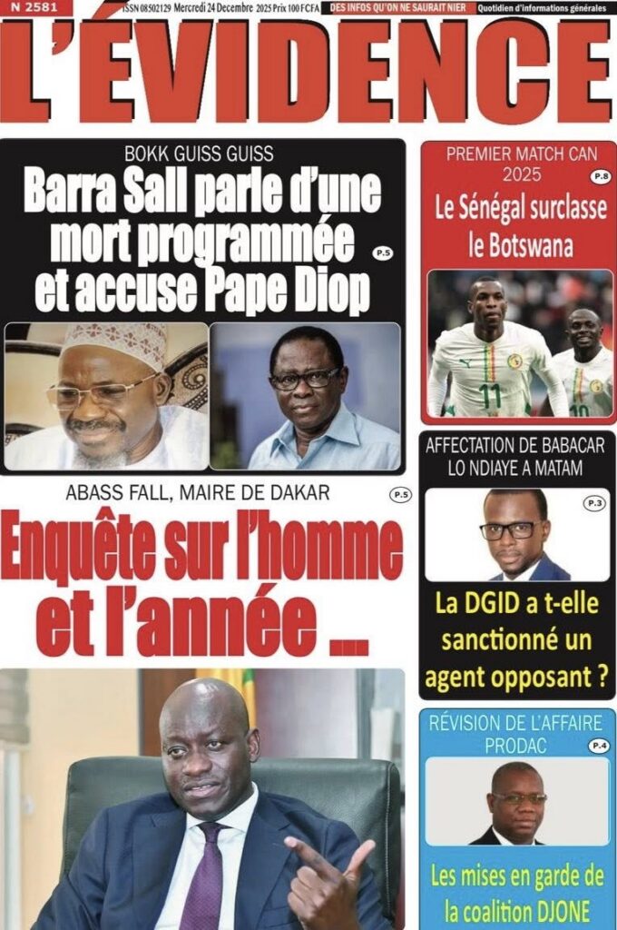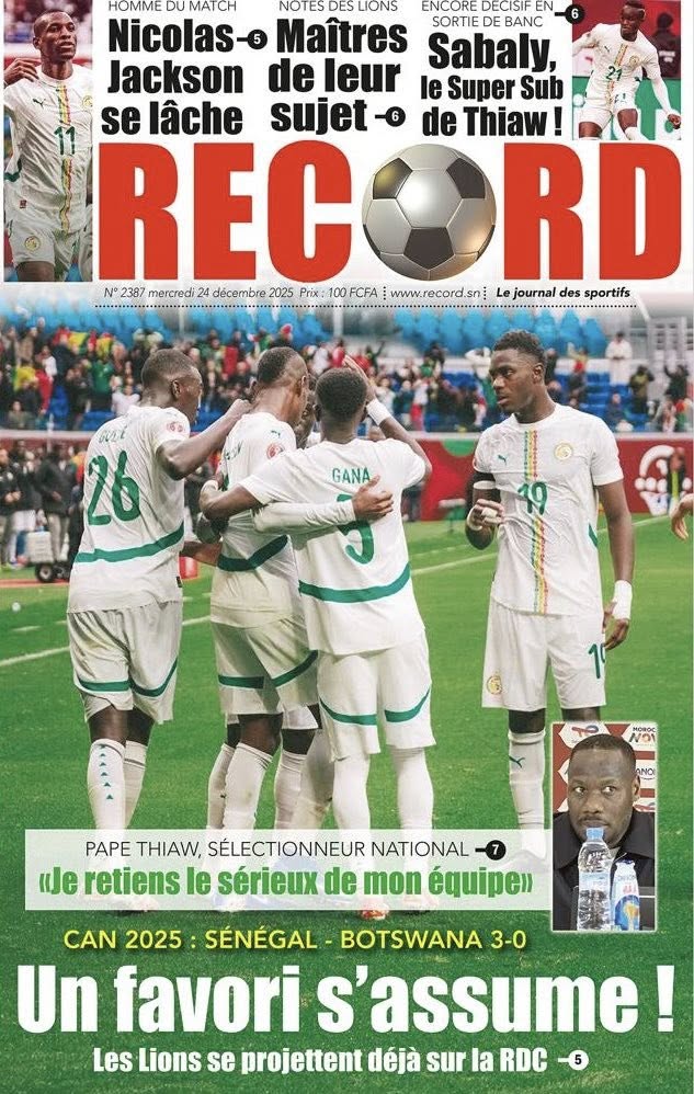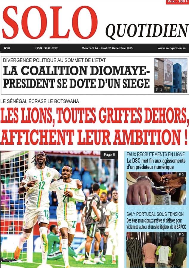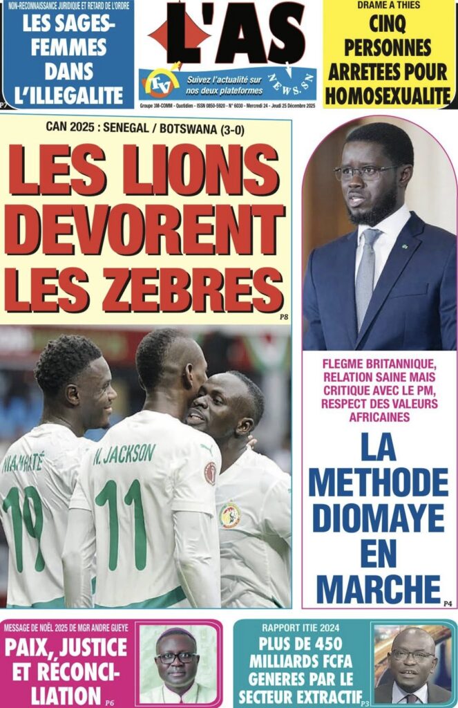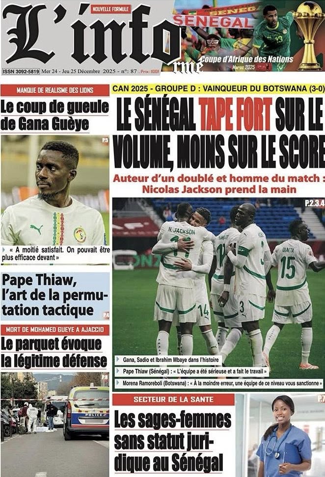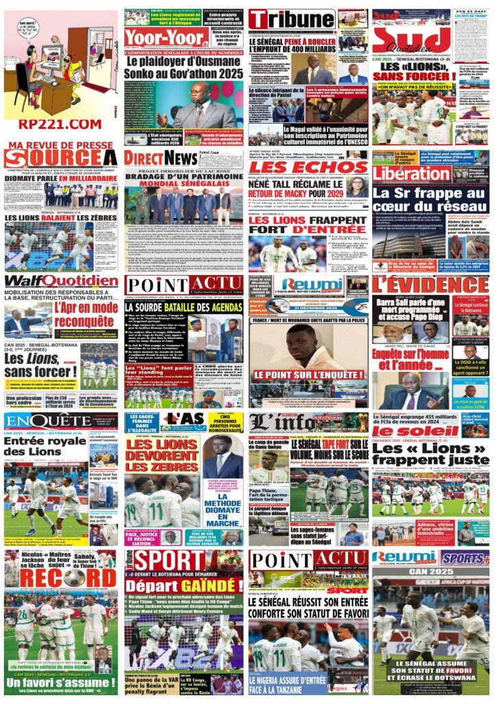La presse sénégalaise de ce mercredi 24 décembre 2025 est largement dominée par la brillante entrée en lice des Lions de la Teranga à la CAN 2025, mais aussi par une actualité politique et économique dense, marquée par des débats sur la gouvernance, la justice et les finances publiques.