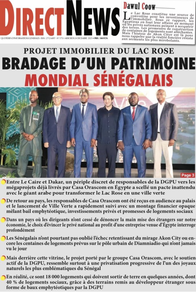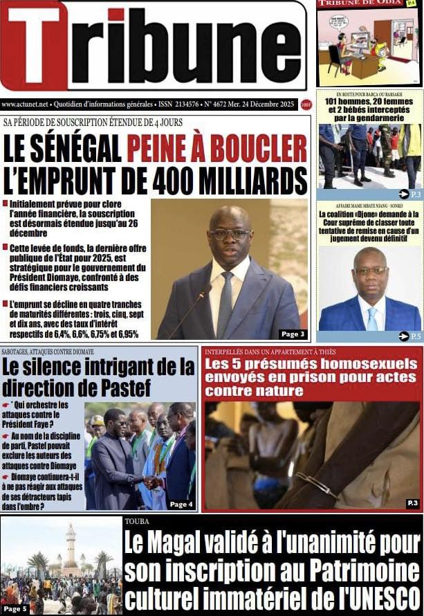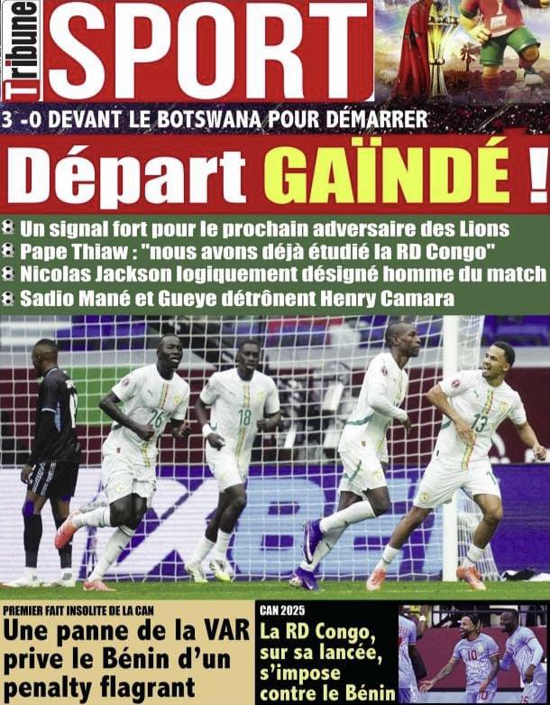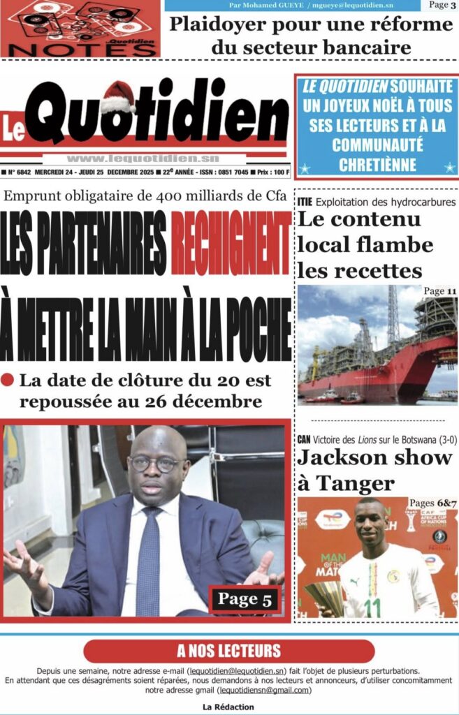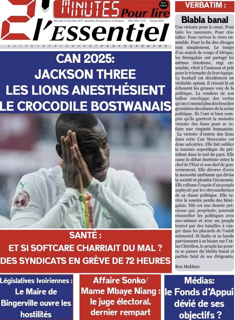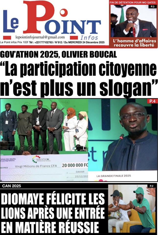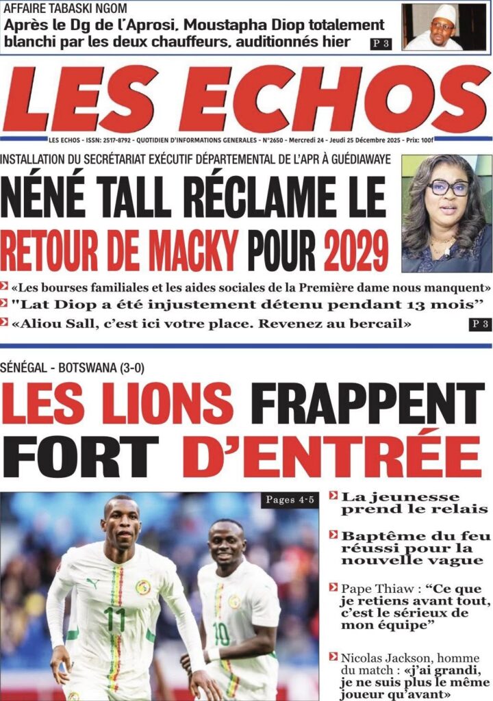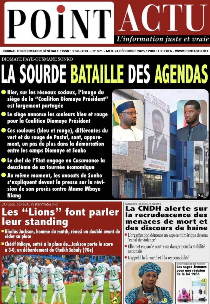 La presse sénégalaise de ce mercredi 24 décembre 2025 est largement dominée par la brillante entrée en lice des Lions de la Teranga à la CAN 2025, mais aussi par une actualité politique et économique dense, marquée par des débats sur la gouvernance, la justice et les finances publiques.