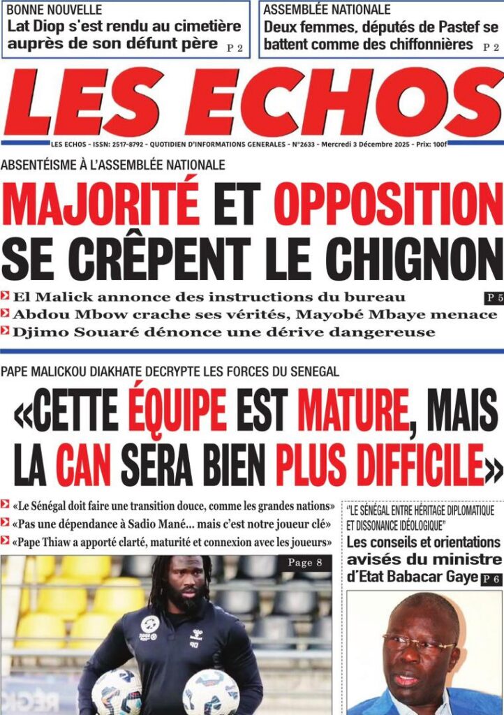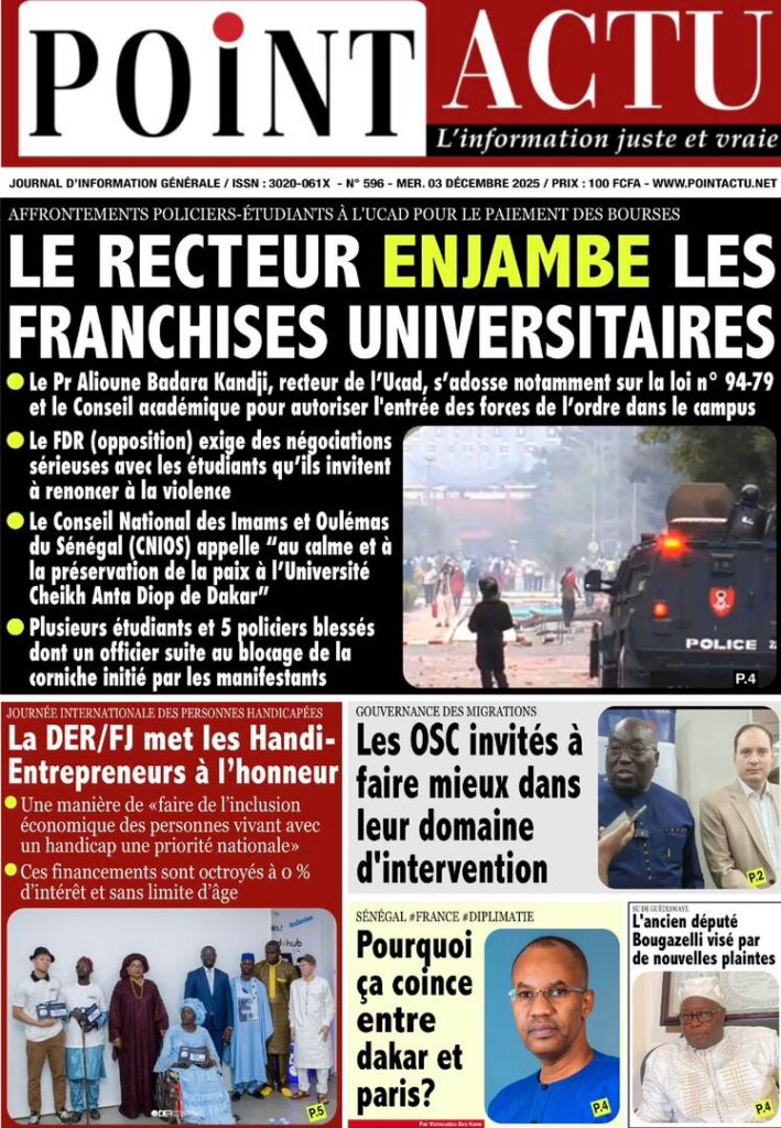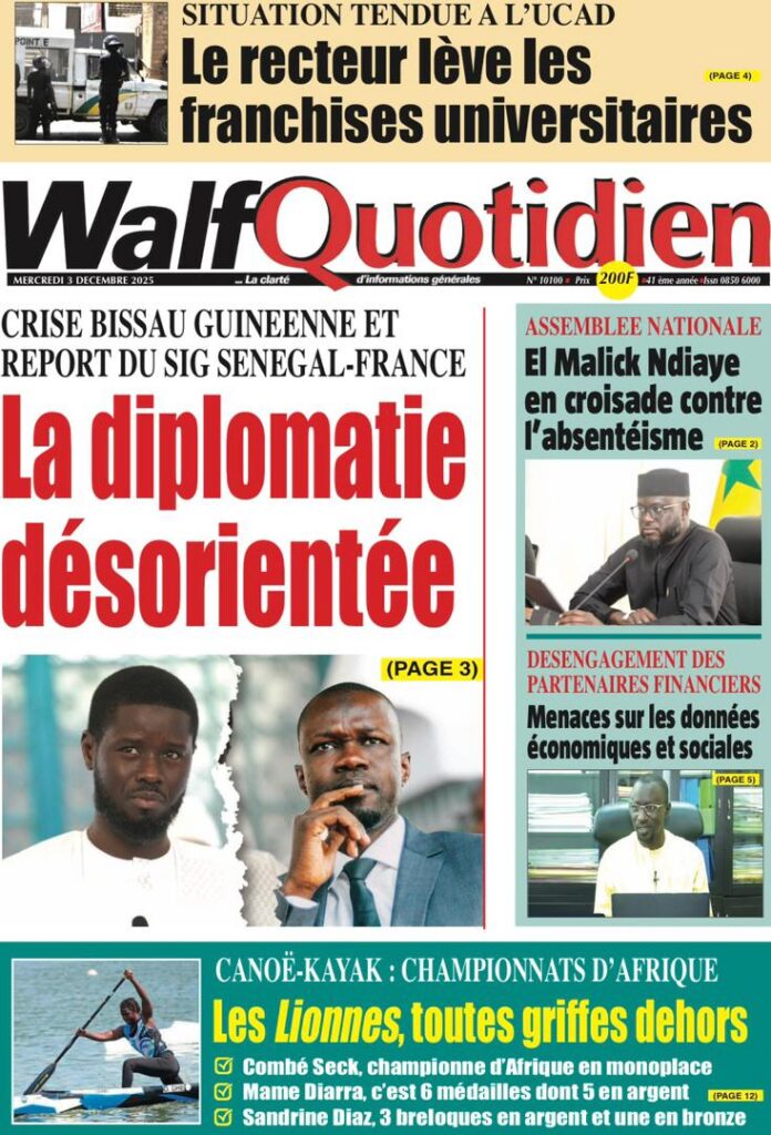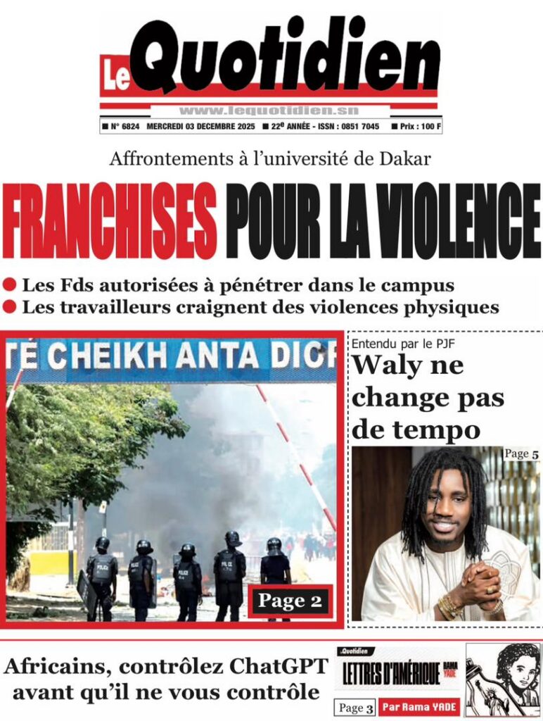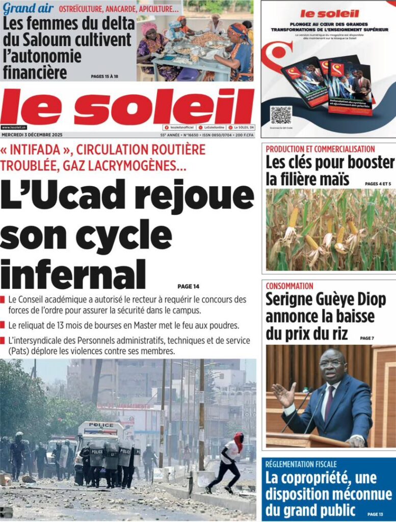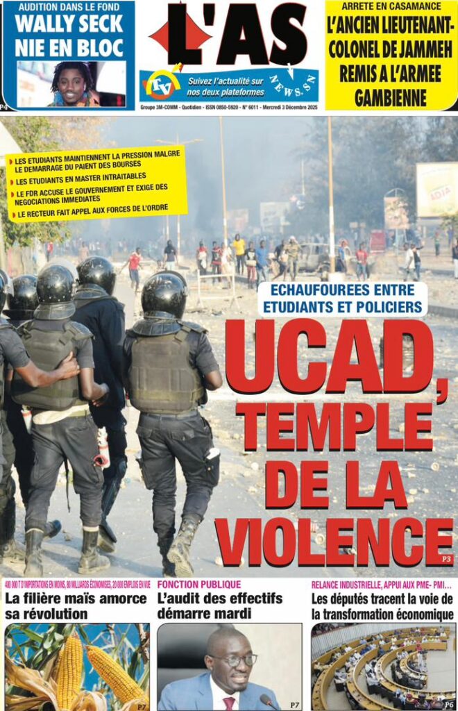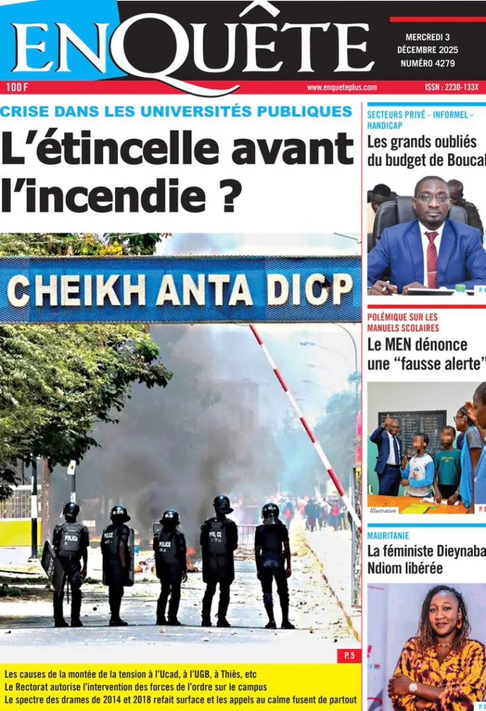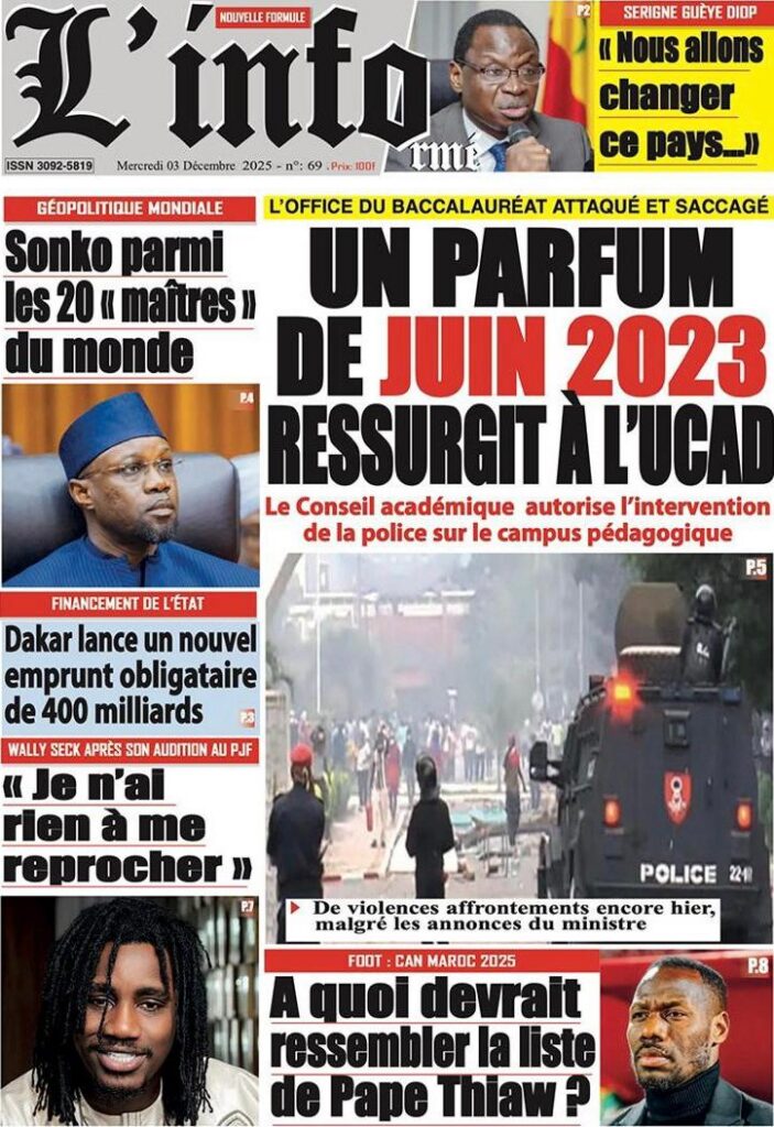 En ce mercredi 03 décembre 2025, la presse sénégalaise déroule une actualité dominée par la crise universitaire, les secousses diplomatiques, les manœuvres politiques et les tensions sociales. Entre fractures institutionnelles et débats nationaux, les Unes révèlent un pays en proie à des défis multiples, mais aussi à des dynamiques de résilience.