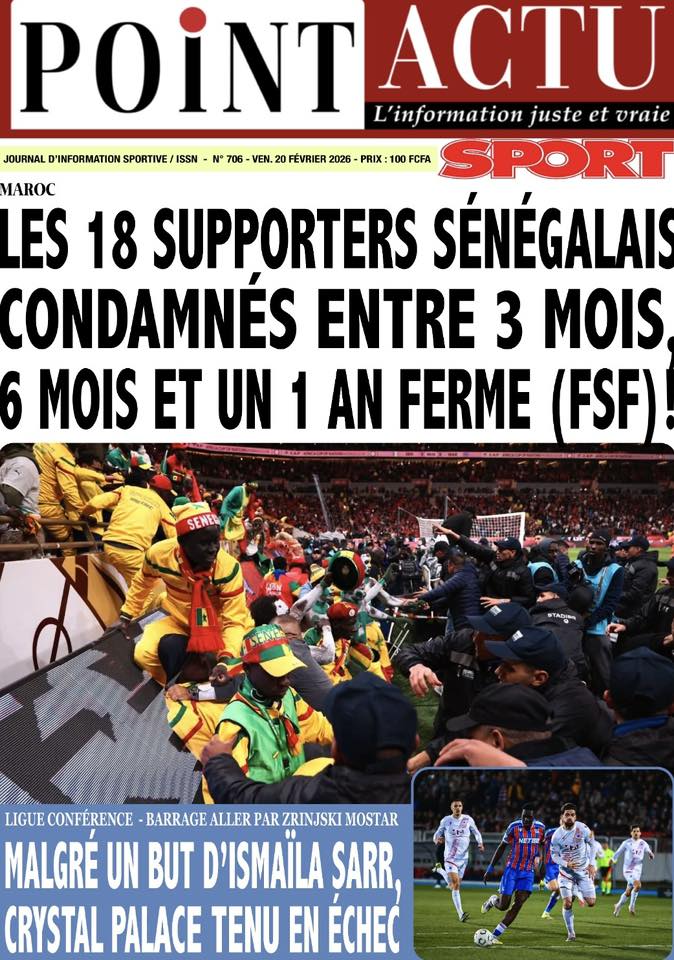 Les quotidiens sénégalais de ce vendredi 20 février 2026 sont dominés par le verdict tombé au Maroc concernant les 18 supporters sénégalais détenus depuis plusieurs semaines. Entre condamnations lourdes, solidarité nationale et autres sujets brûlants, la presse offre un panorama contrasté de l’actualité.